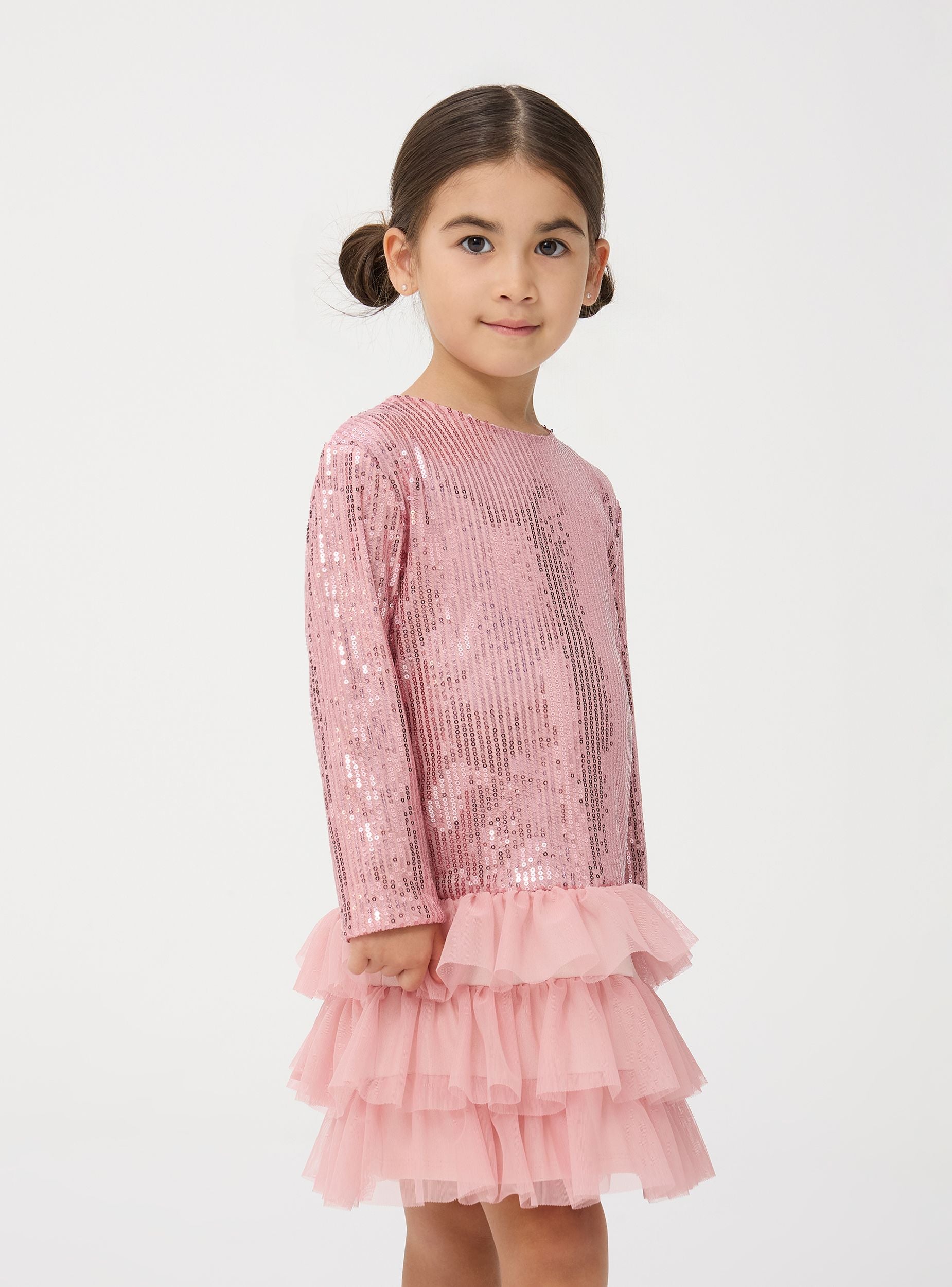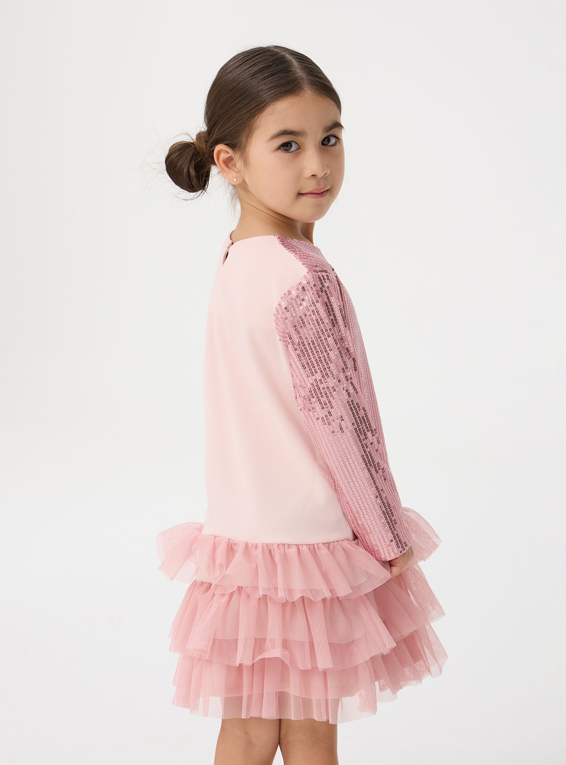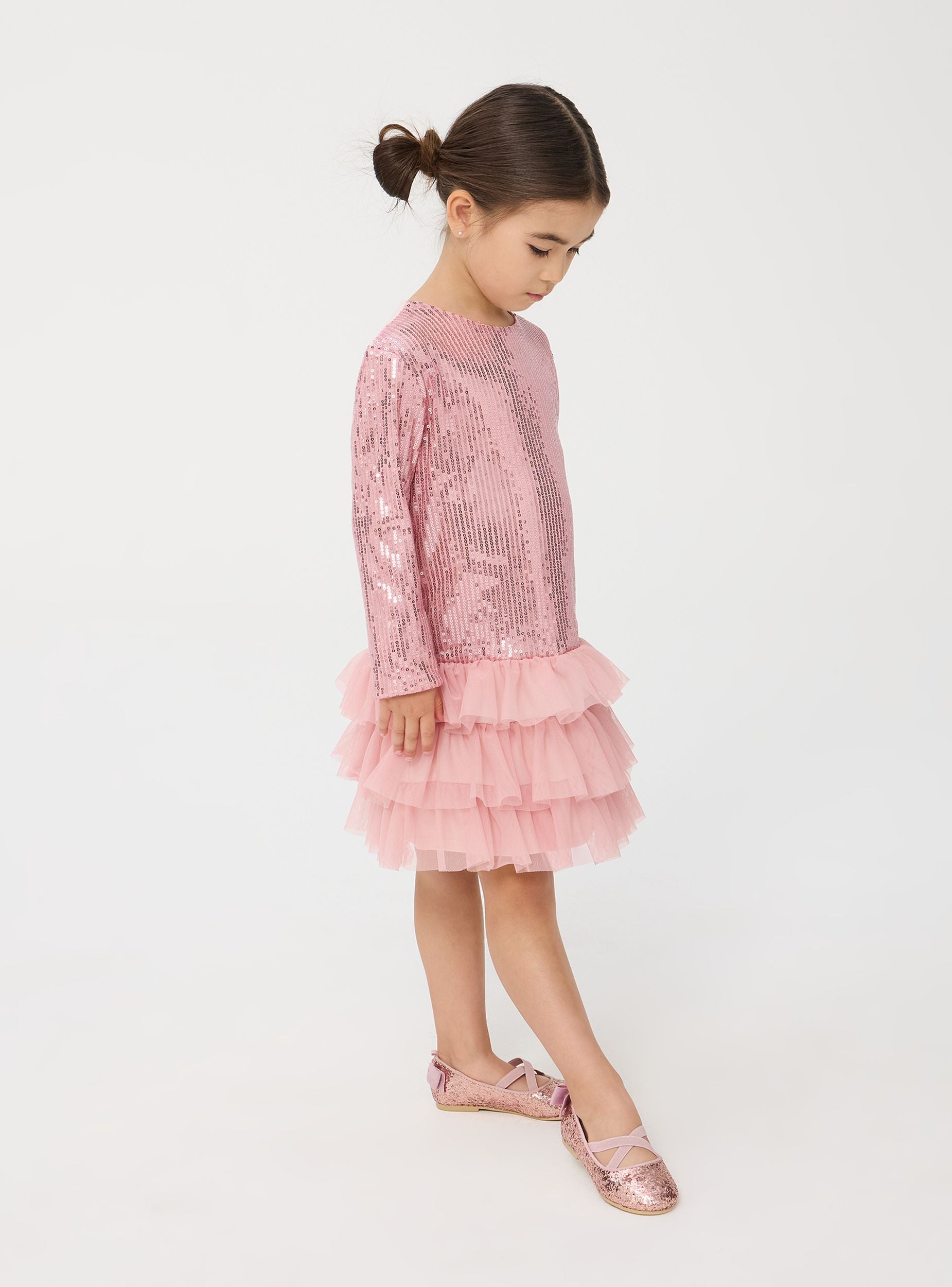 Тази очарователна рокля за момиче е перфектна за специални поводи. Тя има дълги ръкави и елегантен корсет, покрит с пайети, които придават блясък и гламур. Полата с волани добавя обемен и динамичен детайл, създавайки очарователен и игрив вид. Общият дизайн съчетава стил и комфорт, което я прави идеална за партита и празненства, където вашето малко ще може да се чувства като истинска принцеса.Детайли