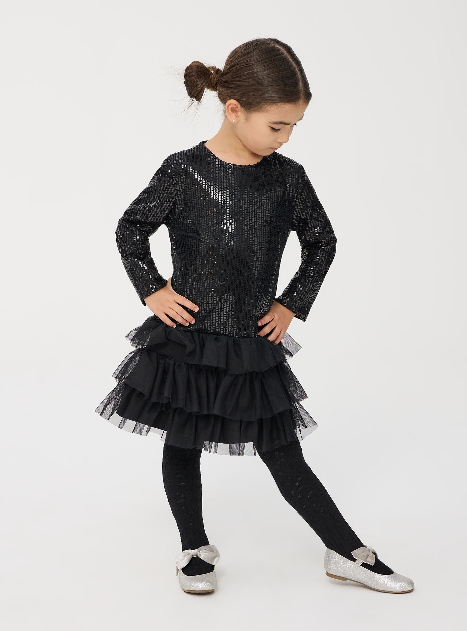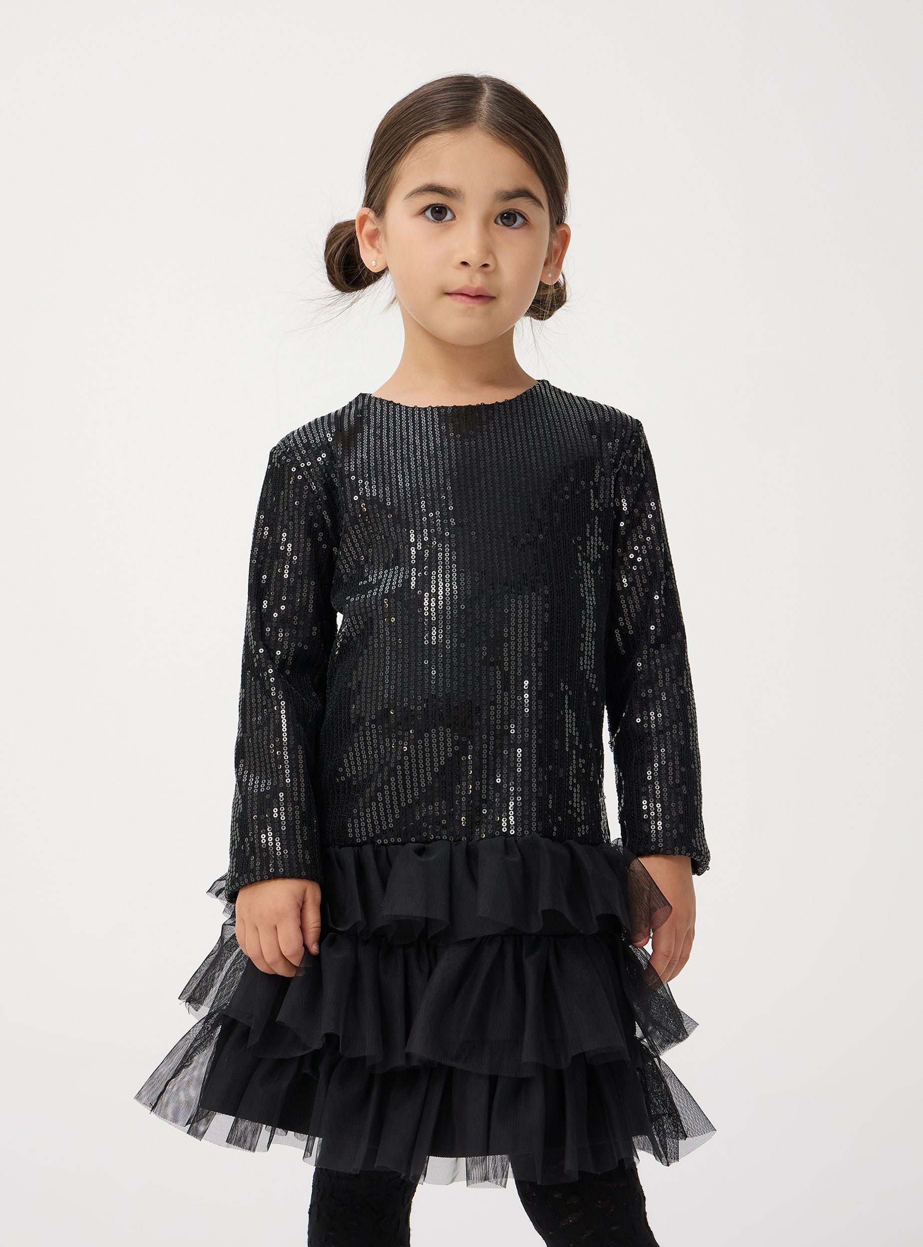 Тази очарователна рокля за момиченце е перфектна за специални поводи. Тя има дълги ръкави и елегантен корсет, покрит с пайети, които придават допълнителен блясък и шик. Полата с волани добавя обемен и динамичен детайл, създавайки очарователен и игрив вид. Общият дизайн съчетава стил и комфорт, което я прави идеална за партита и тържества, където вашето малко момиче може да се почувства като истинска принцеса.