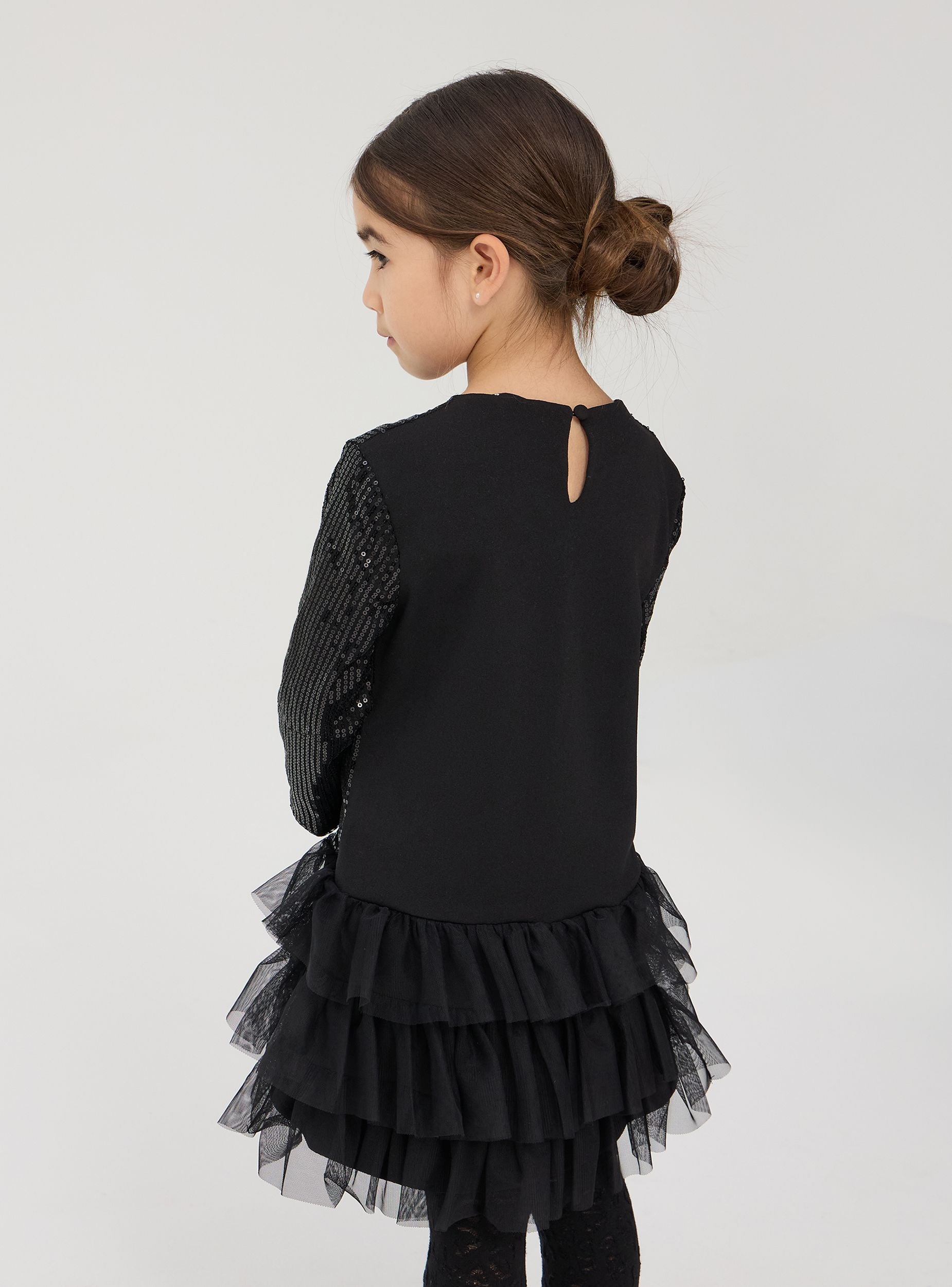 Рокля с дълги ръкави, пайети и волани