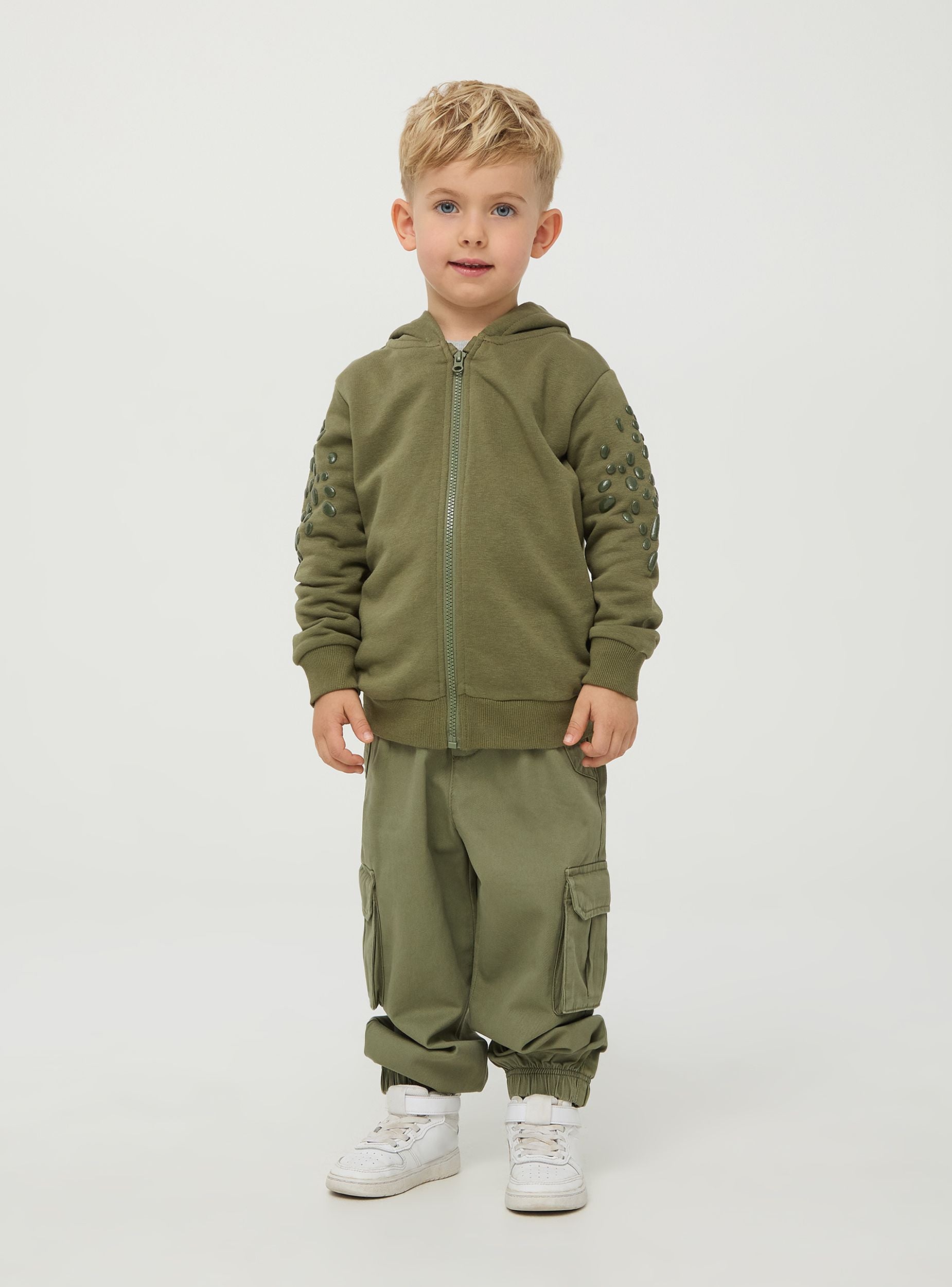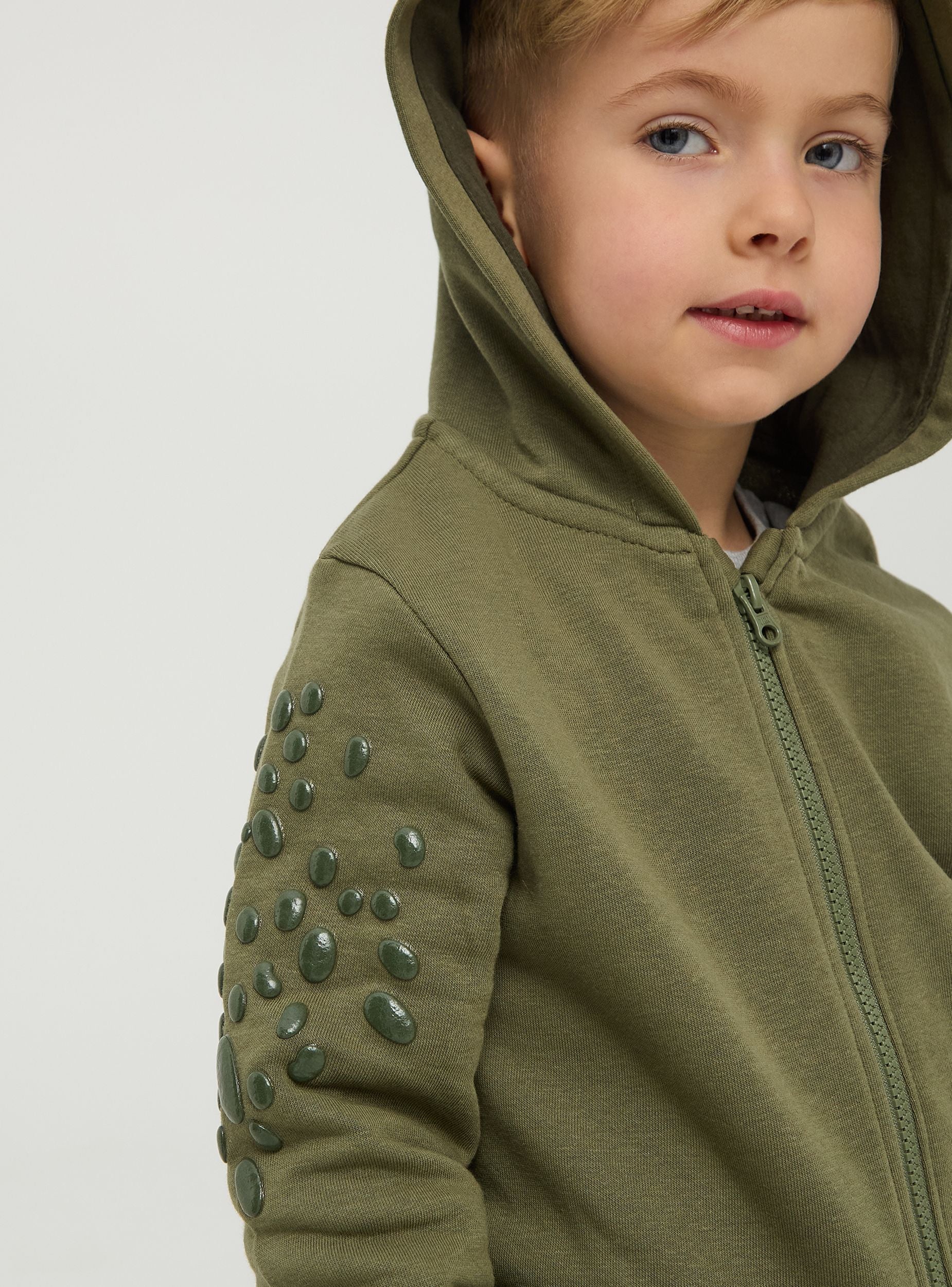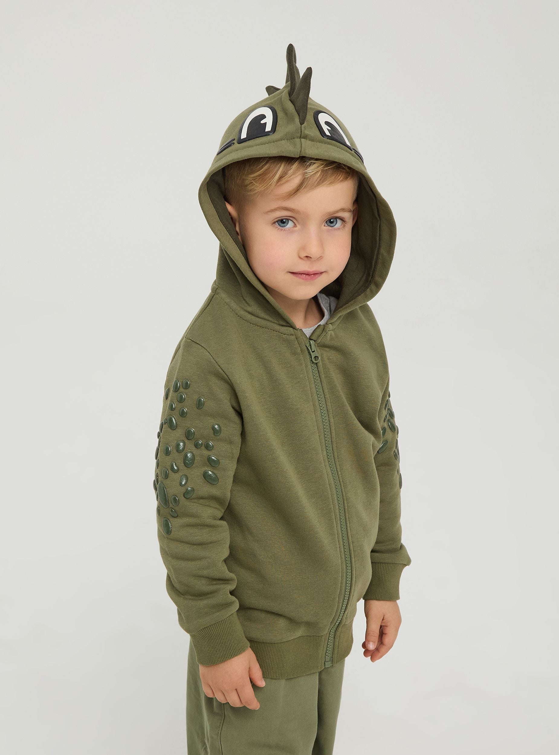 Симпатичен суитчер за дете с 3D детайли на динозавър. Капюшонът е с гребен и весели очички, докато горната част на ръкавите е покрита с люспи. Модел с цип и ръбове с ластик, плътен текстил. Перфектен за игрив и забавен вид. Стандартна кройка.