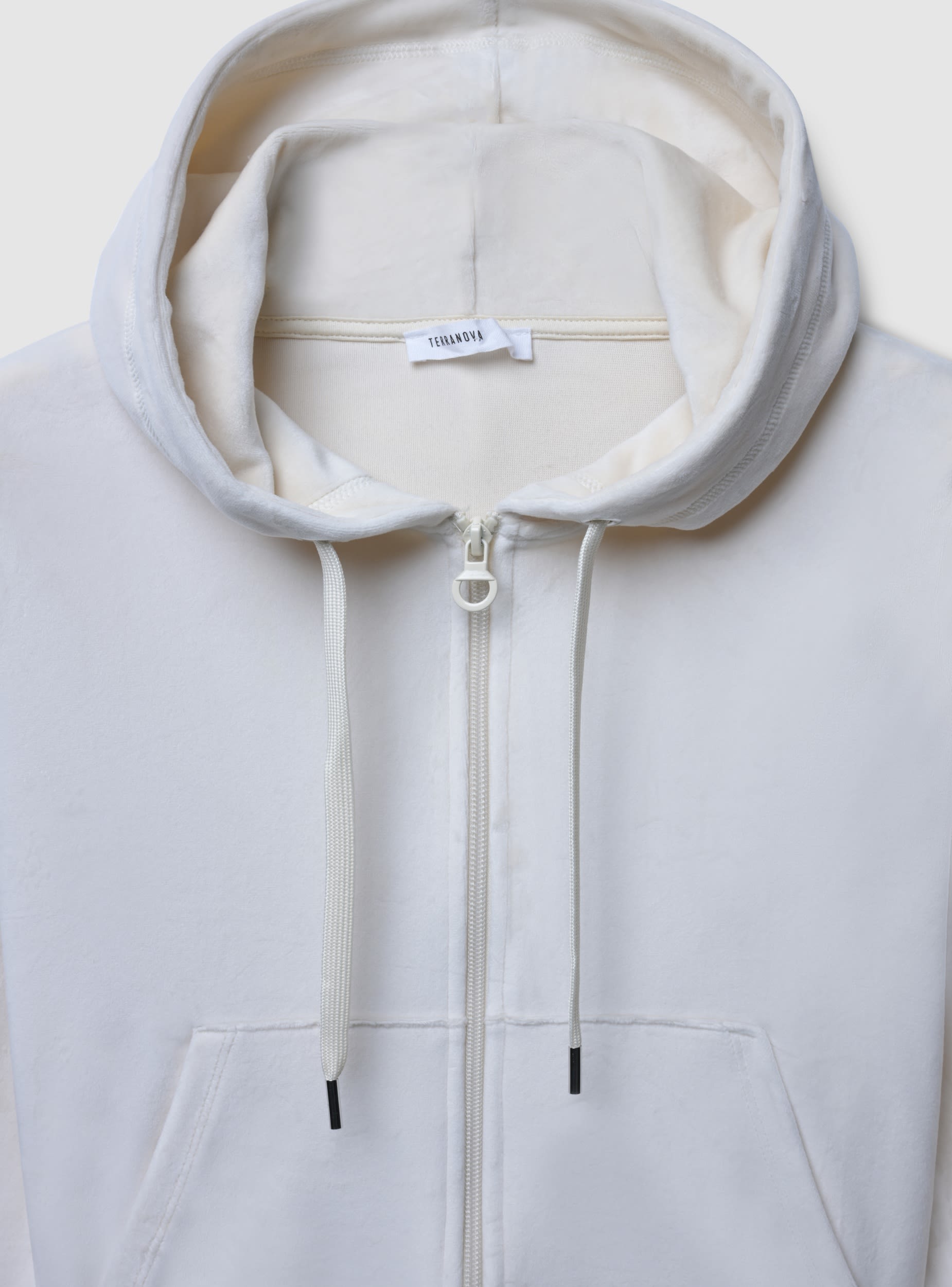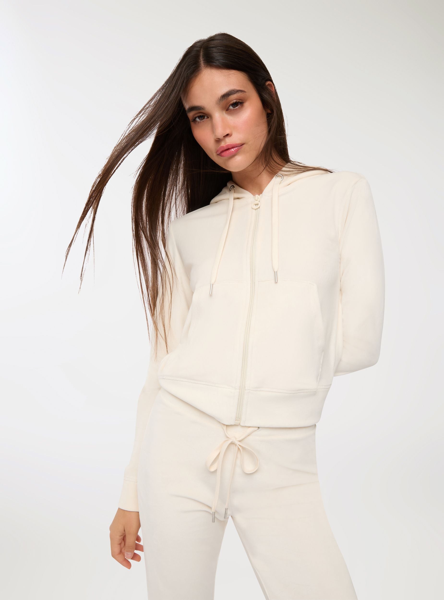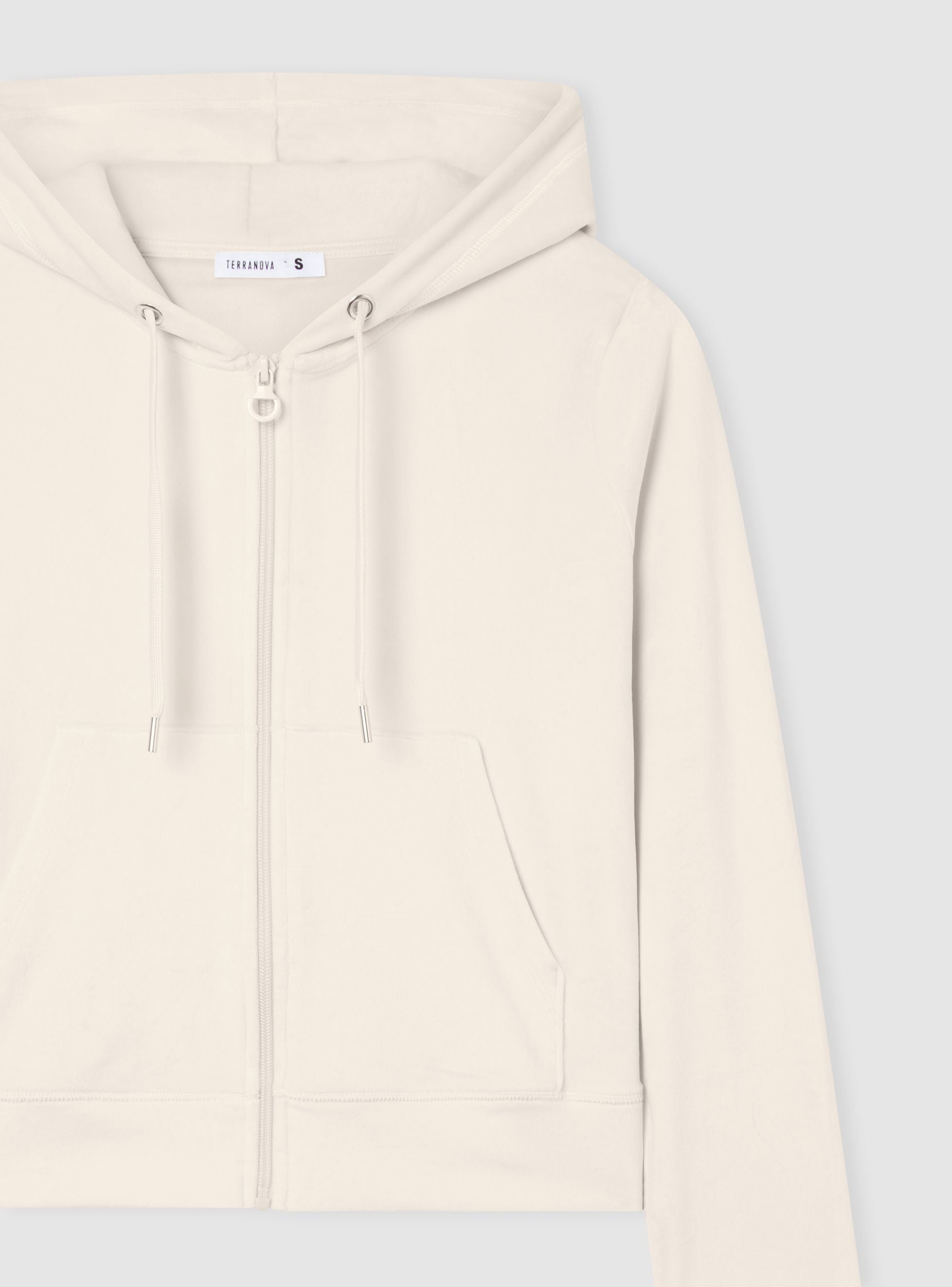 Женска блуза от мека велурена материя с цип и регулируем качулка с връзки. Велурената текстура я прави перфектна за неформален шикозен вид. С предни джобове е идеална за съчетаване с джогъри или дънки за удобно и модно облекло.Детайли