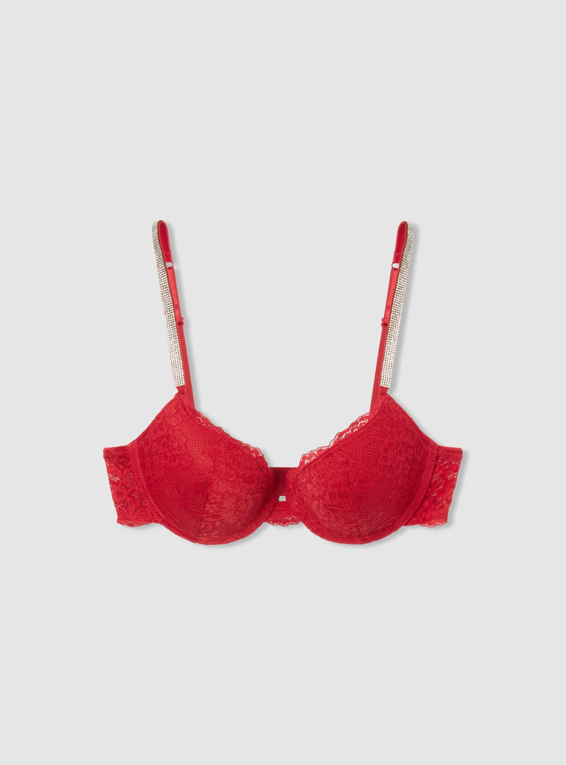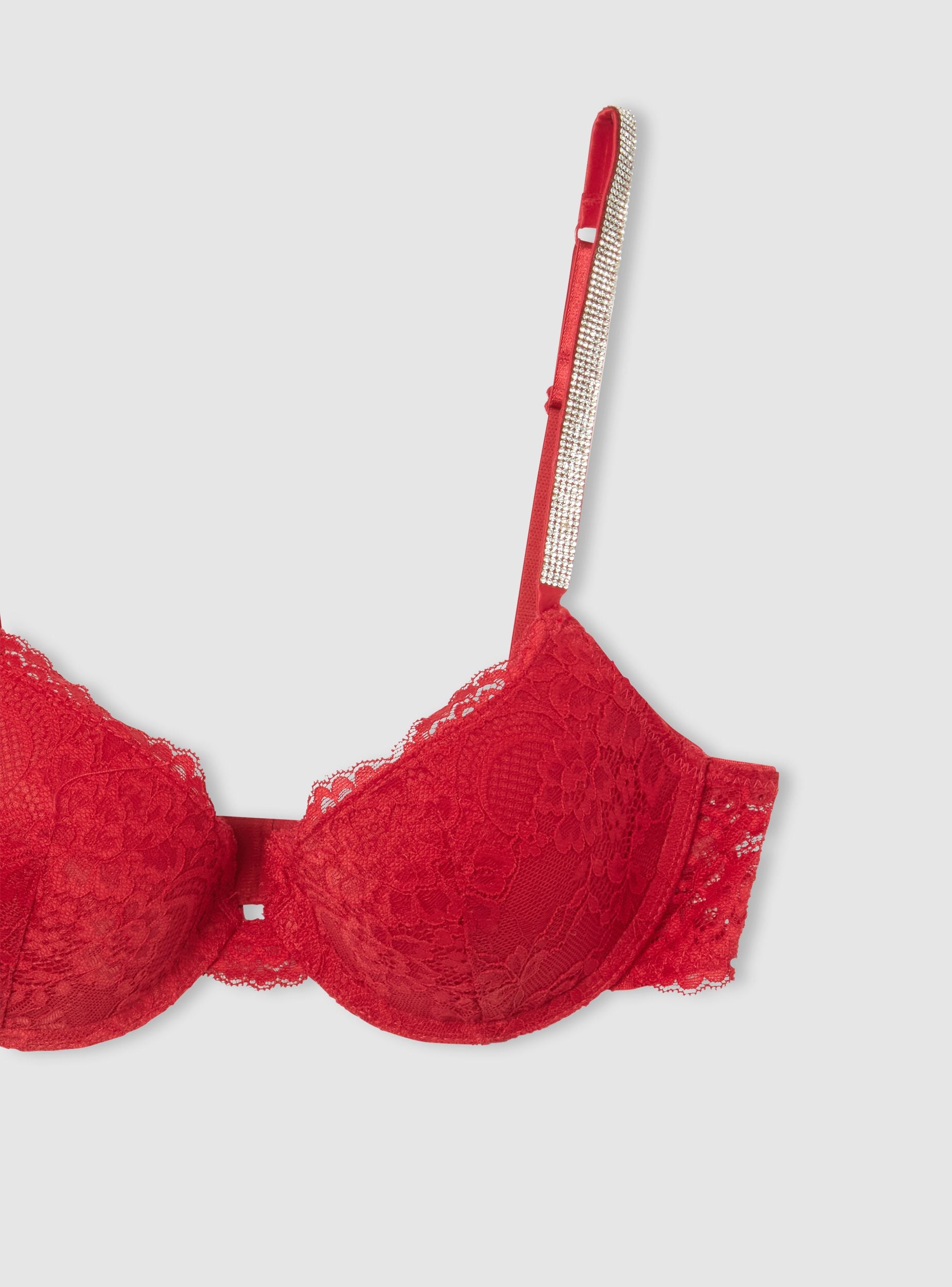 Дамски сутиен балконет, идеален за подчертаване на деколтето с елегантност. Презрамките са украсени с кристали, добавяйки светъл и изискан акцент. Дантелената му изработка го прави универсален под разголени рокли или топове, осигурявайки подкрепа и комфорт през целия ден.Детайли