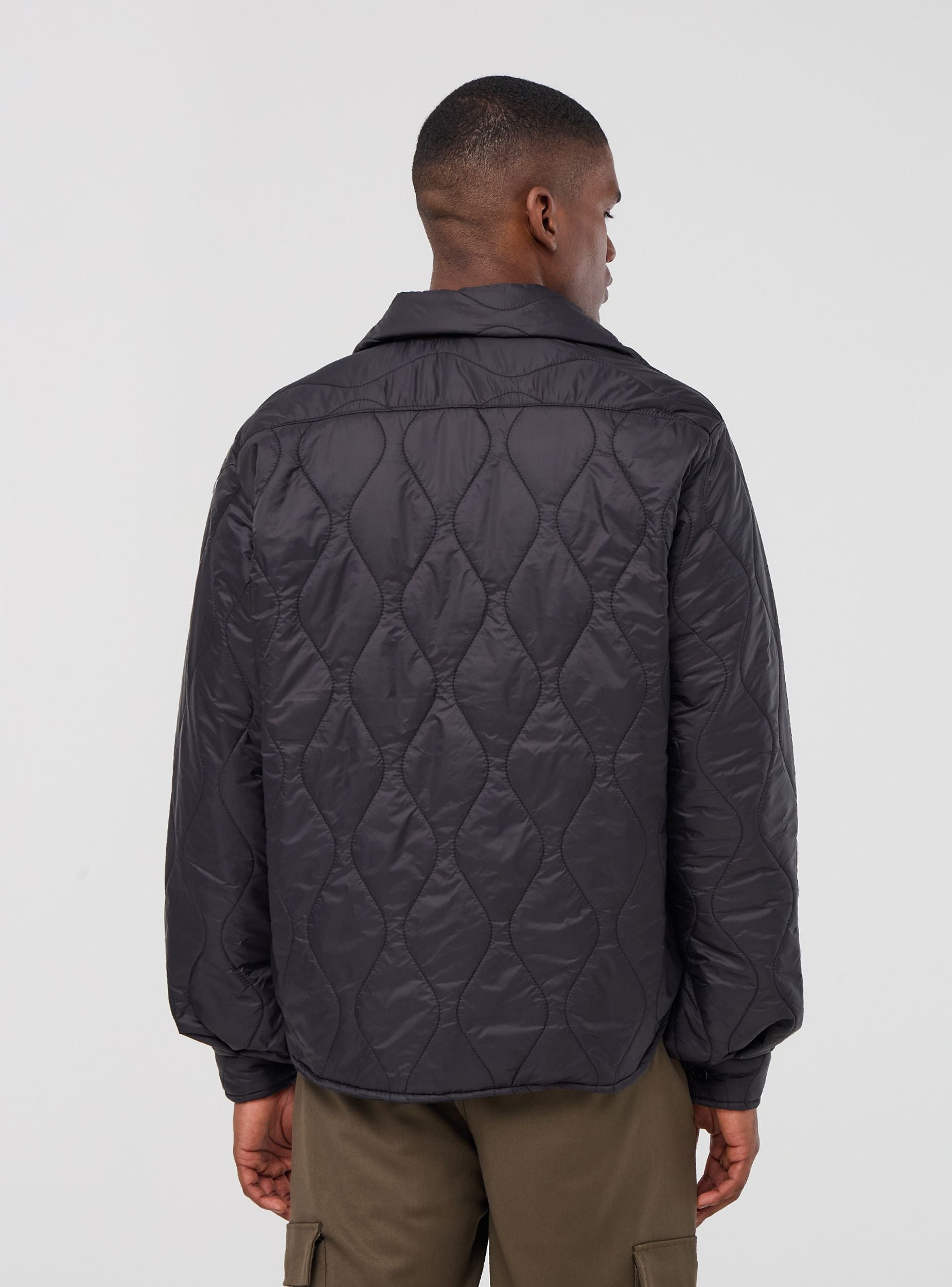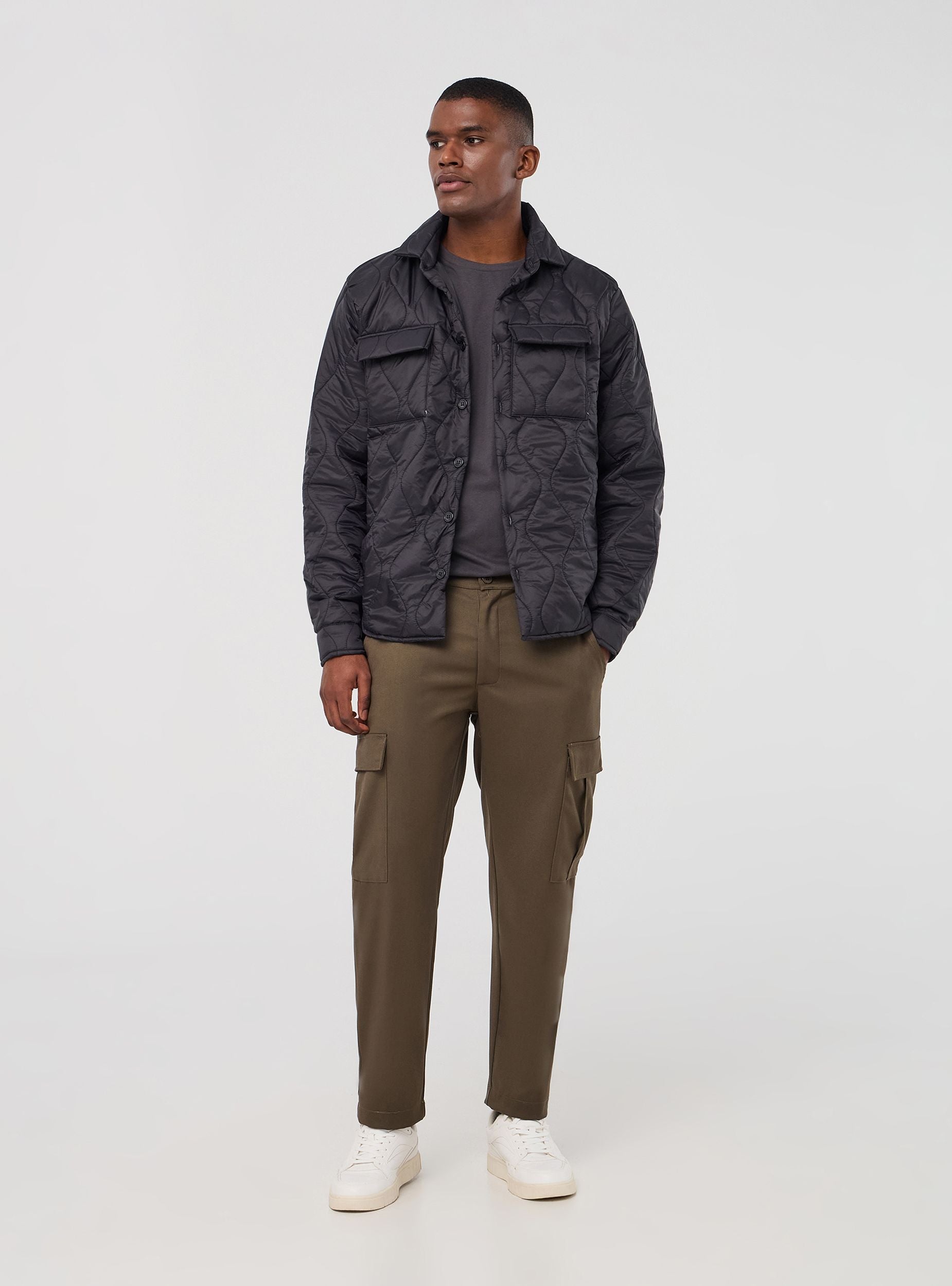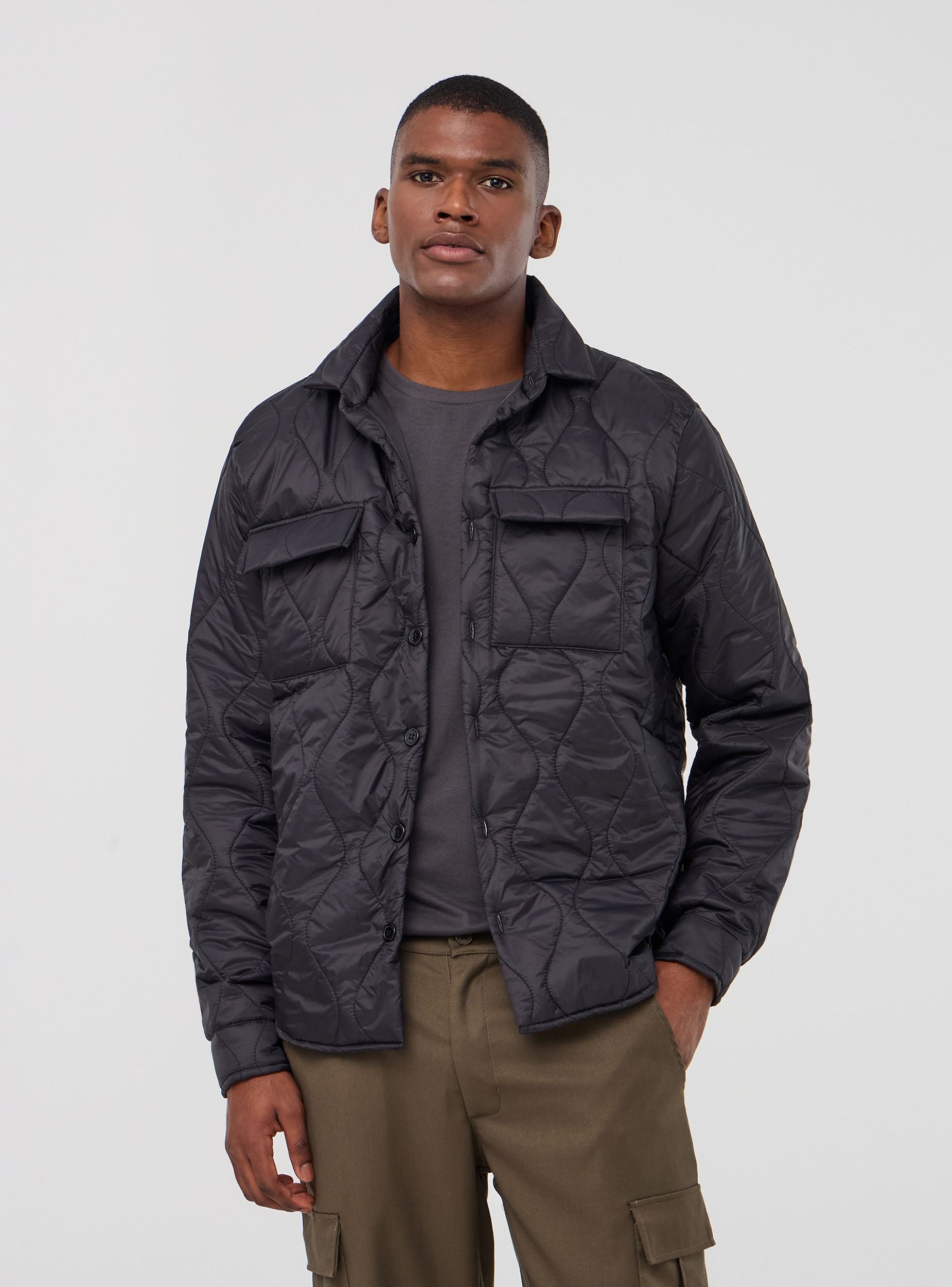 Мъжко яке с капитониране на геометрични фигури, класическа яка и предно закопчаване с копчета. Има джобове на гърдите с капак и копче, които правят модела функционален. Ръкавите са дълги. Моделът е изчистен и модерен, идеален за допълнение на ежедневна или малко по-елегантна визия.Детайли