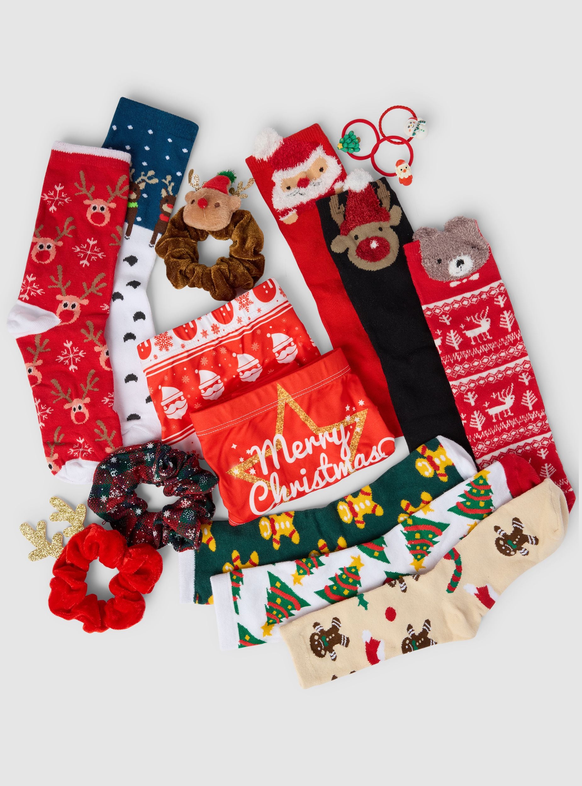 Ženski adventski kalendar s 24 ukrasna dodatka. Čarape, gaćice, ukrasi za kosu – sve u božićnom duhu.Detalji