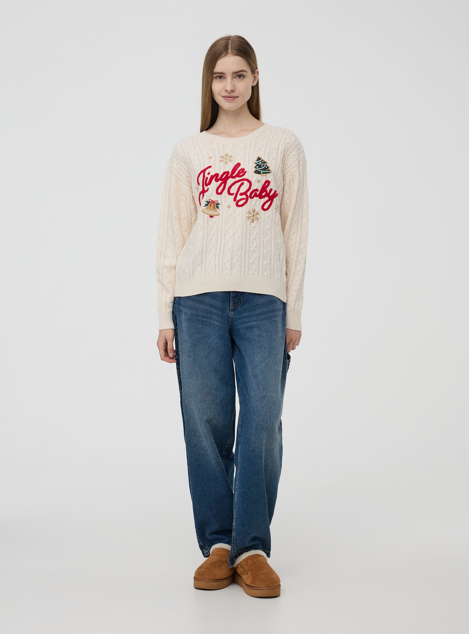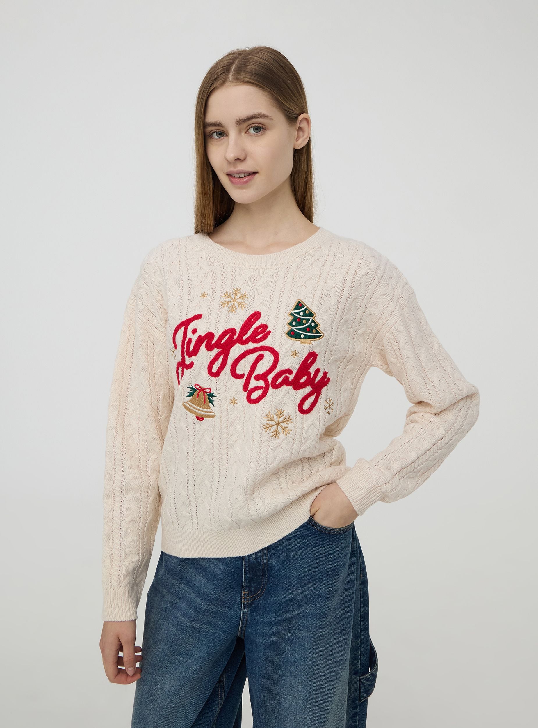 Ženska majica dugih rukava s božićnim motivom sprijeda s natpisom "Jingle Baby" i blagdanskim ukrasima s aplikacijama poput drveća i zvončića. Ima pleteni uzorak koji dodaje teksturu odjeći. Opremljena je rebrastim manžetama i donjim rubom, pruža udoban i topao kroj za zimsko razdoblje.