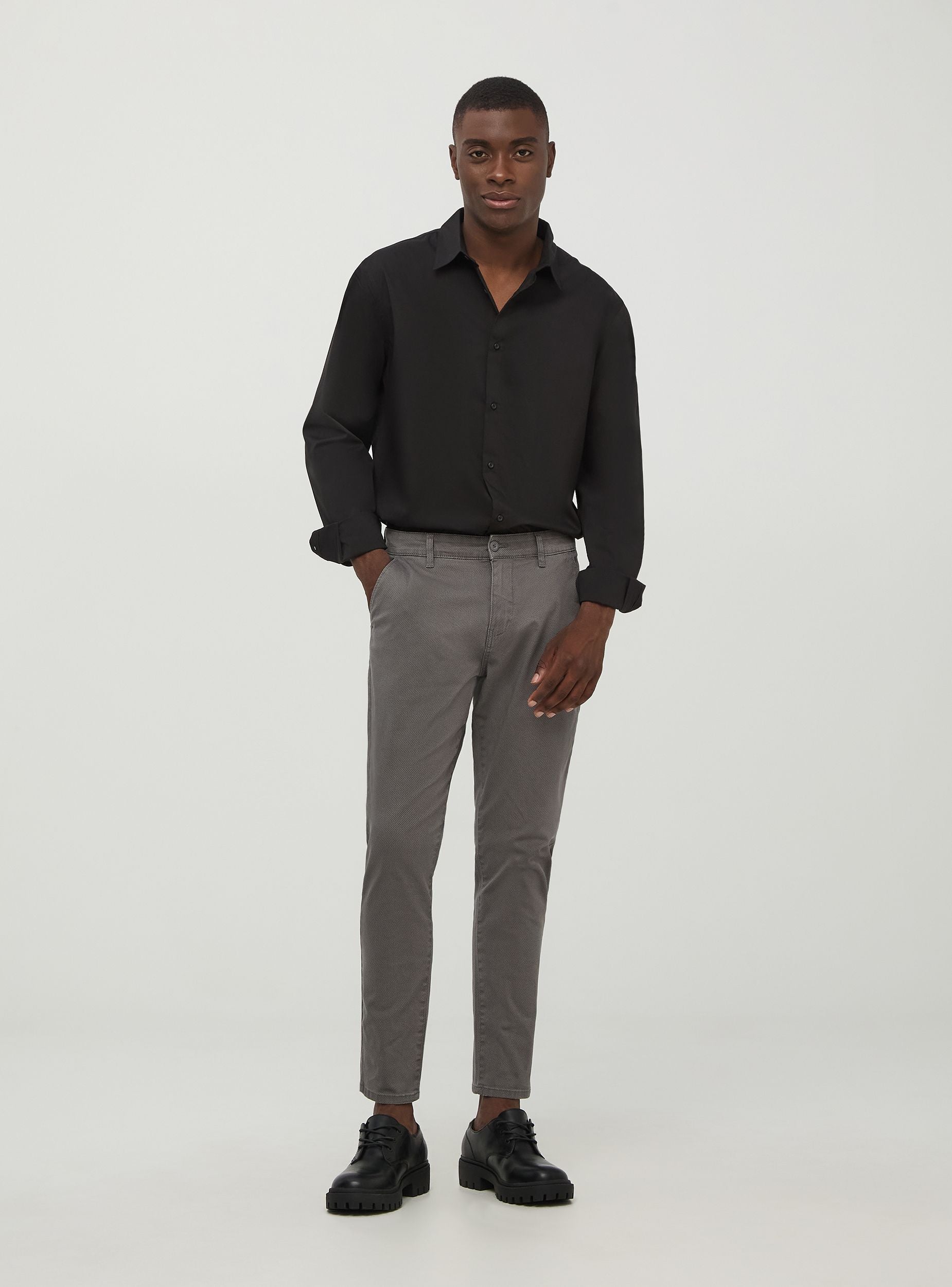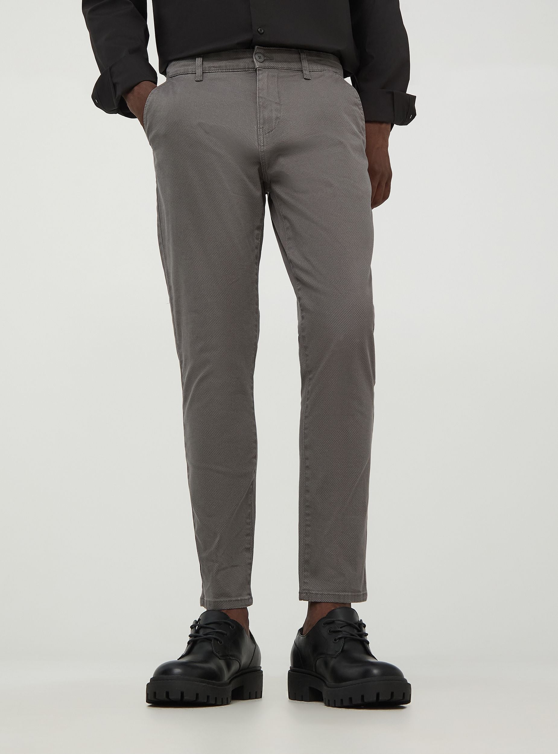Muški chino hlače, skinny fit, izrađene od elastičnog pamuka, savršene za ležeran, ali dotjeran izgled. Idealne za svakodnevnu upotrebu. Tkanina s mikrouzorkom čini ih svestranim. Opremljene su nagnutim prednjim džepovima i stražnjim džepovima s preklopom, zatvaranje na gumb i patentni zatvarač. Idealne za ležerne situacije ili za ured.
