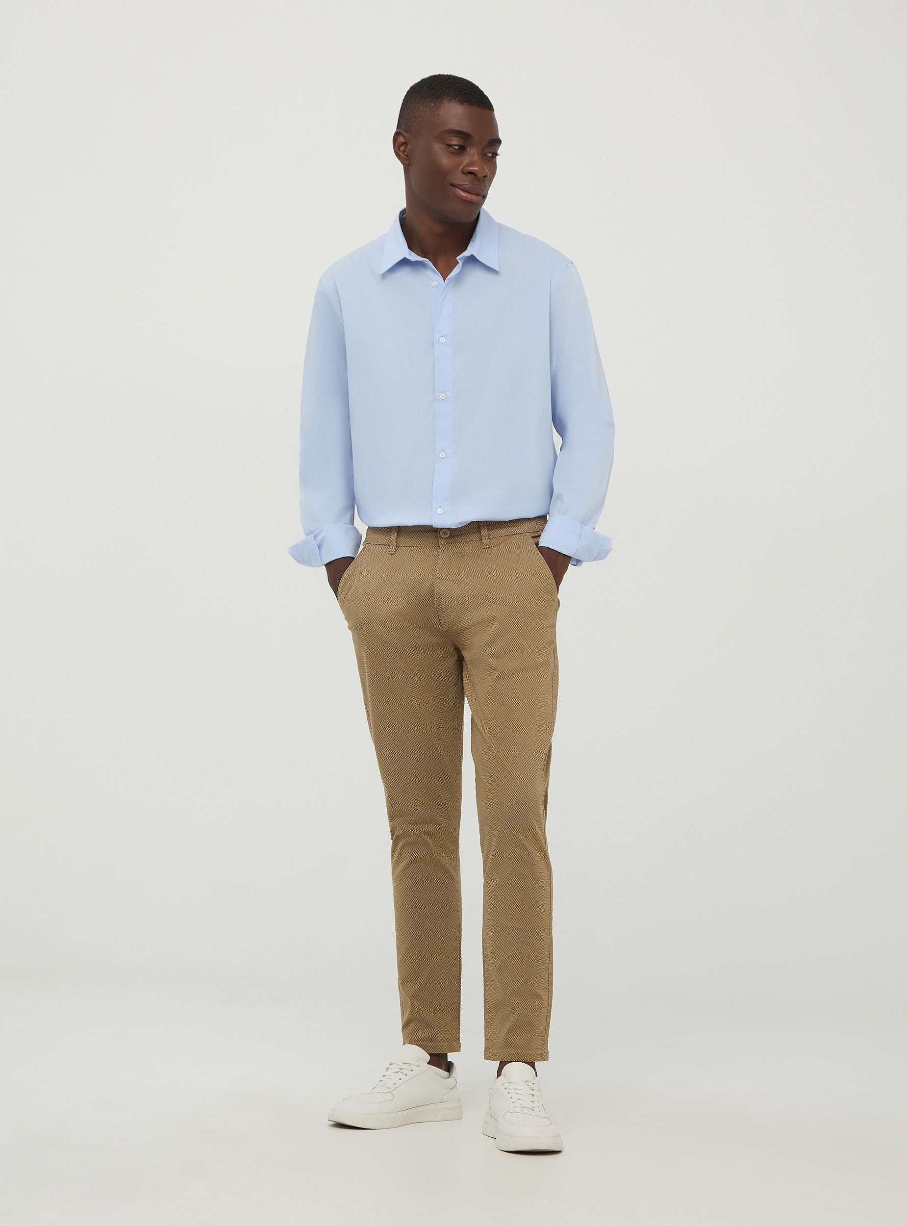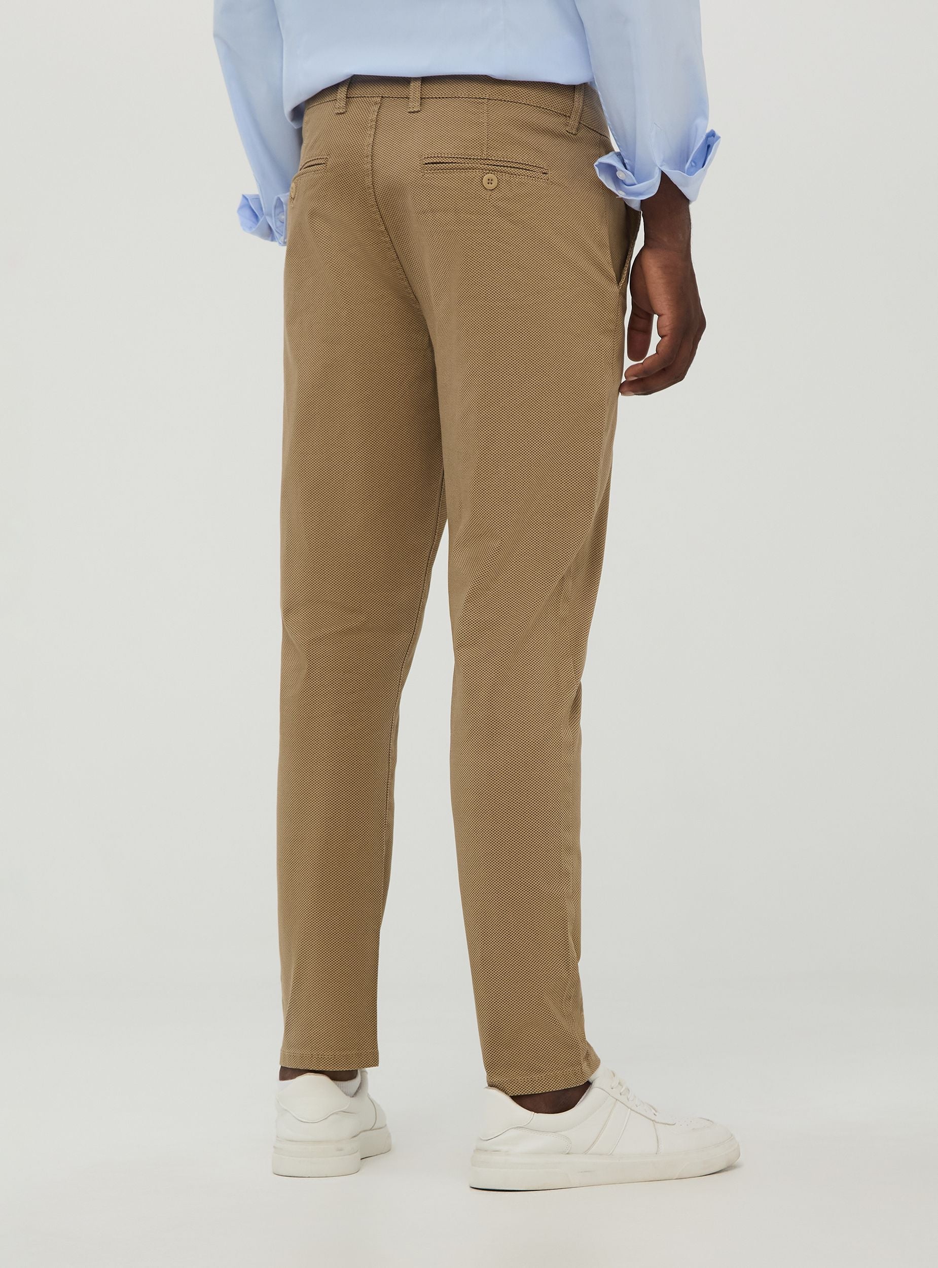 Muški chino hlače, uskog kroja, izrađene od rastezljivog pamuka, savršene za ležeran, ali dotjeran izgled. Idealne za svakodnevnu upotrebu. Tkanina s mikro uzorkom čini ih svestranim. Opremljene su nagibnim prednjim džepovima i stražnjim džepovima s preklopom, zatvaranje na dugme i patentni zatvarač. Idealne za ležerne situacije ili za ured.