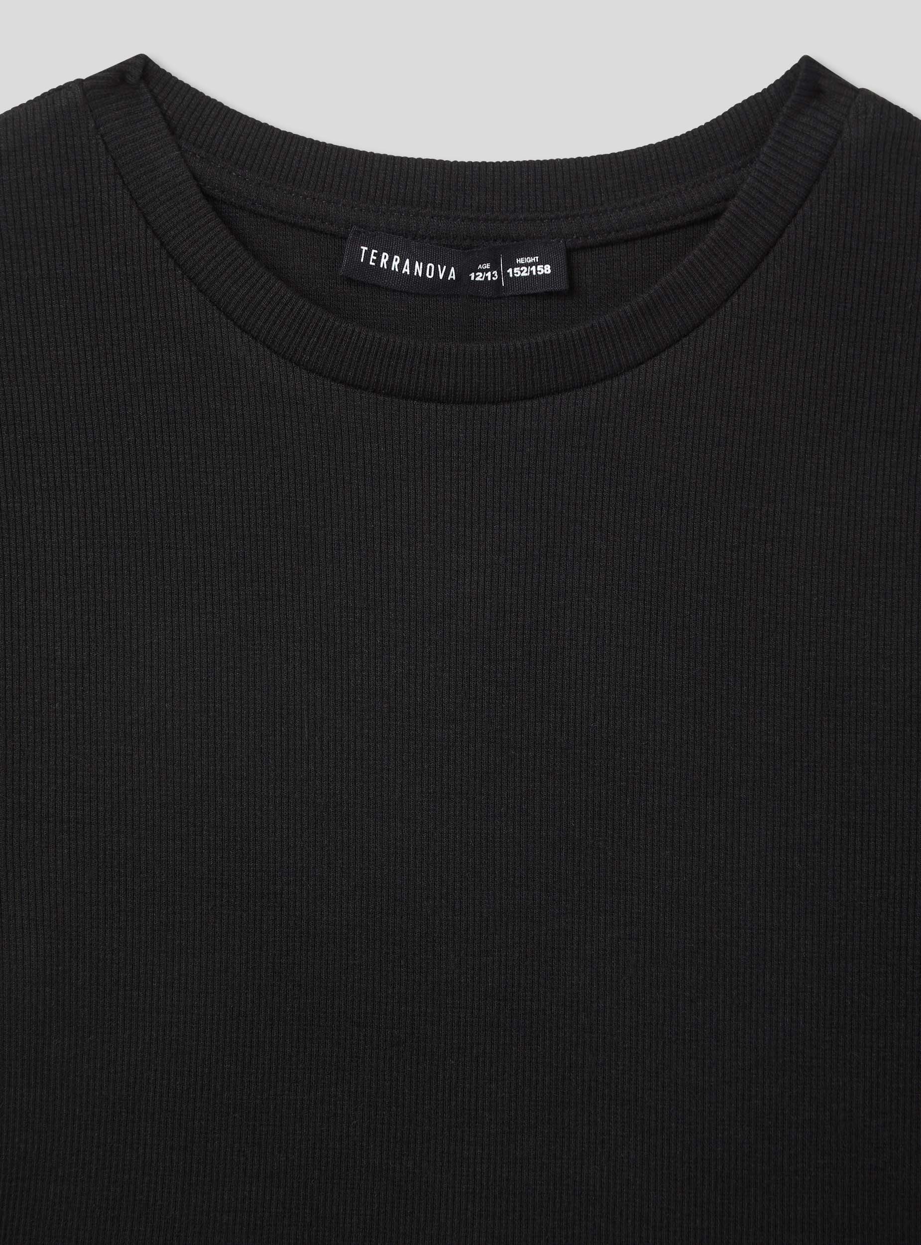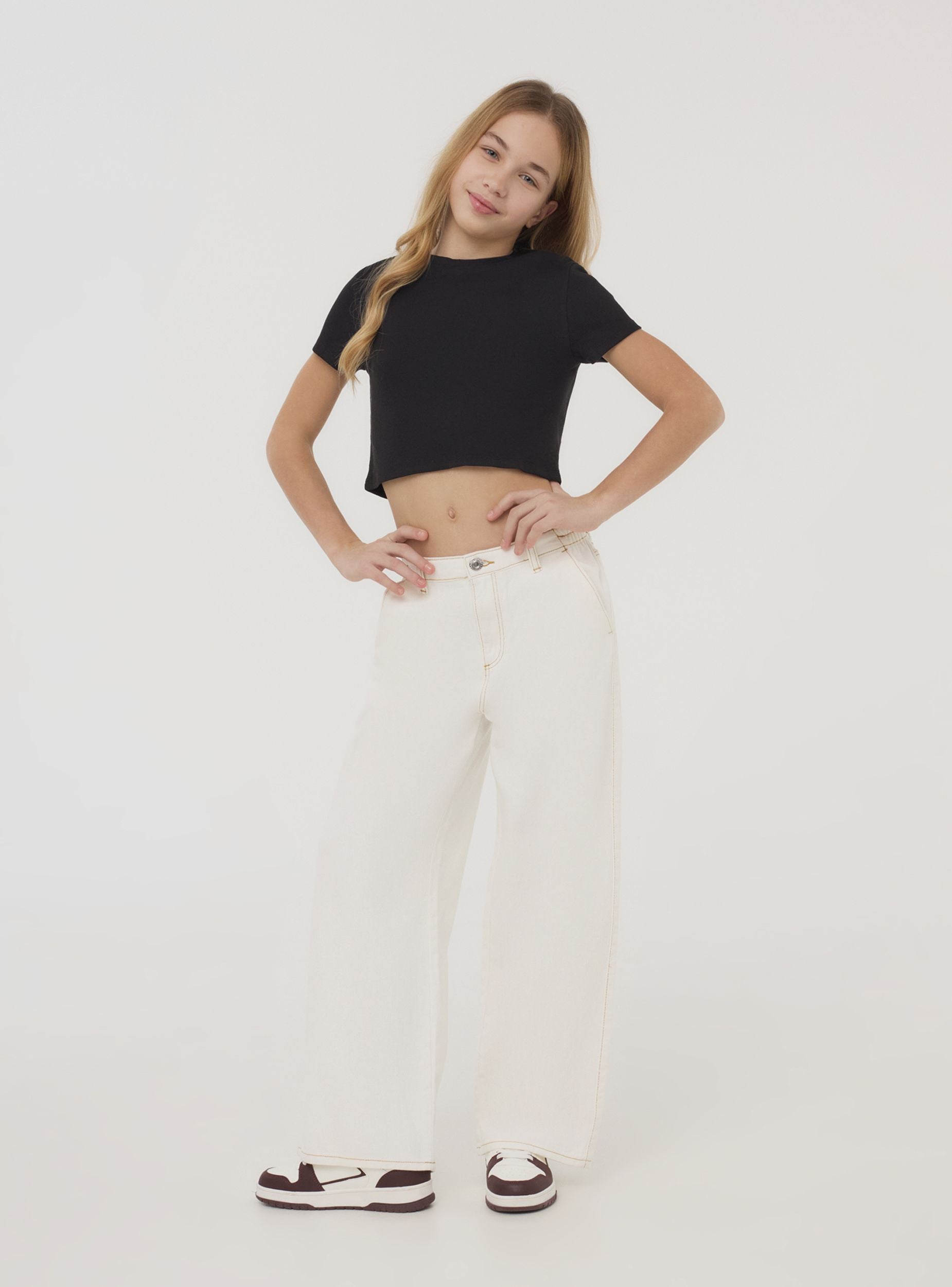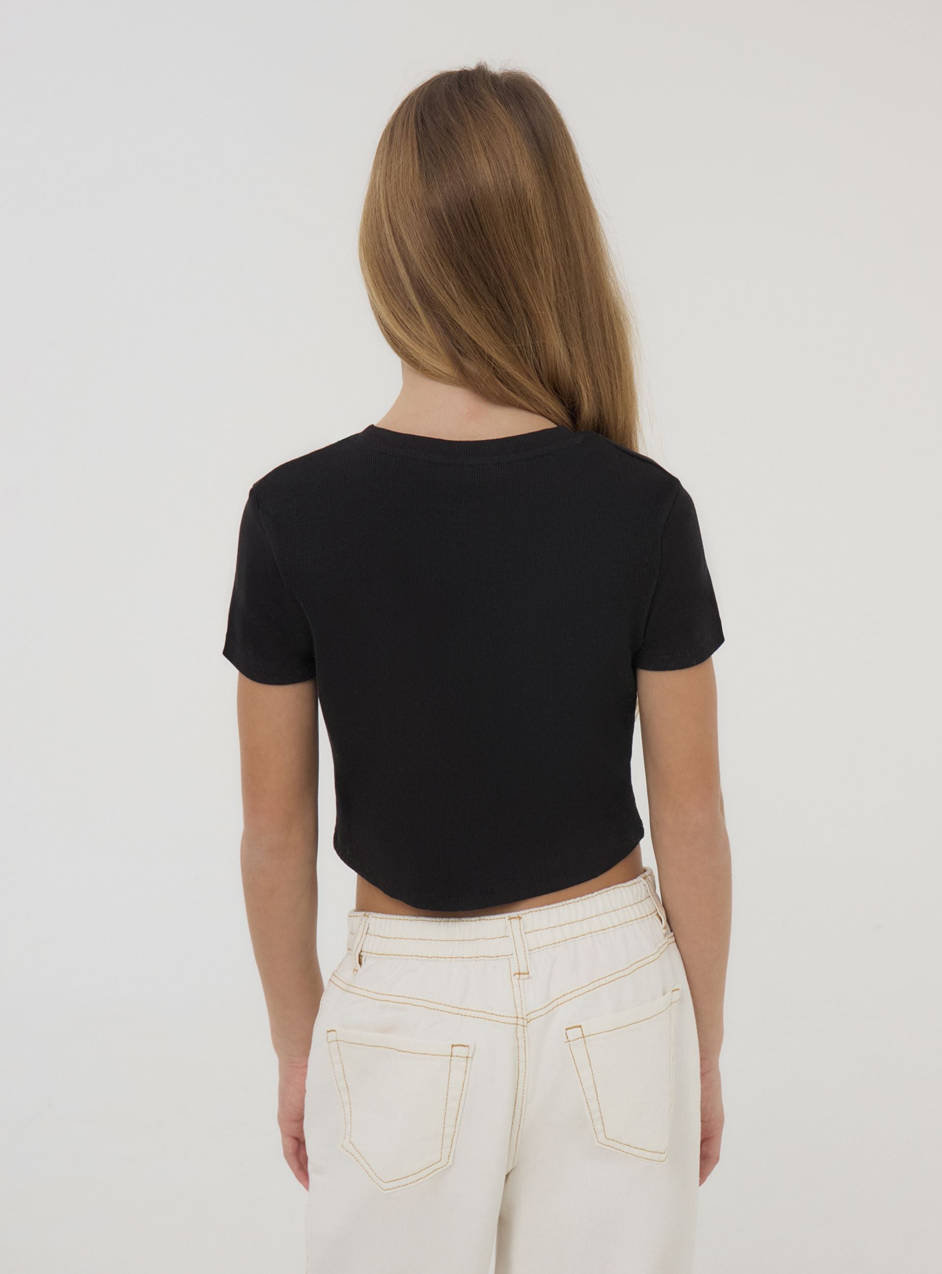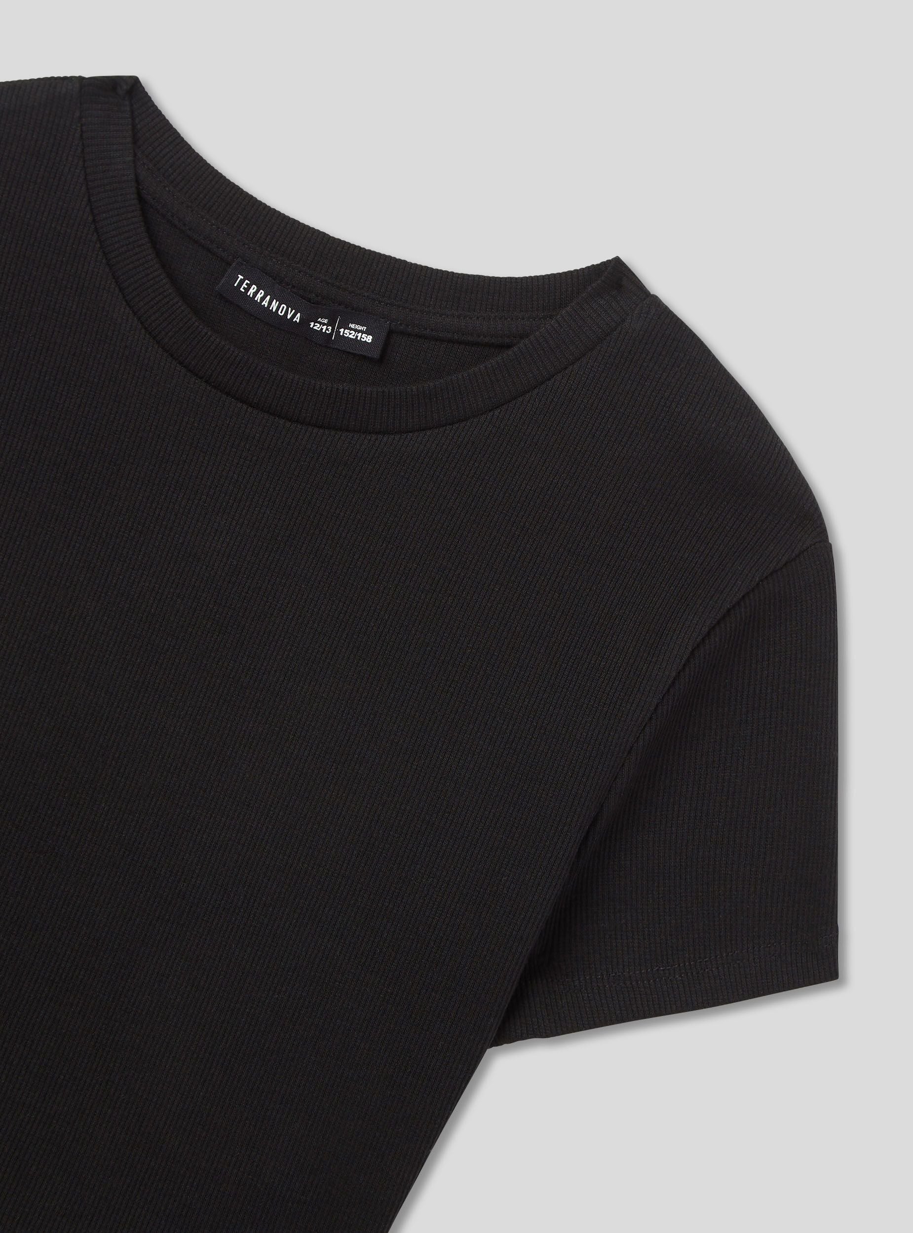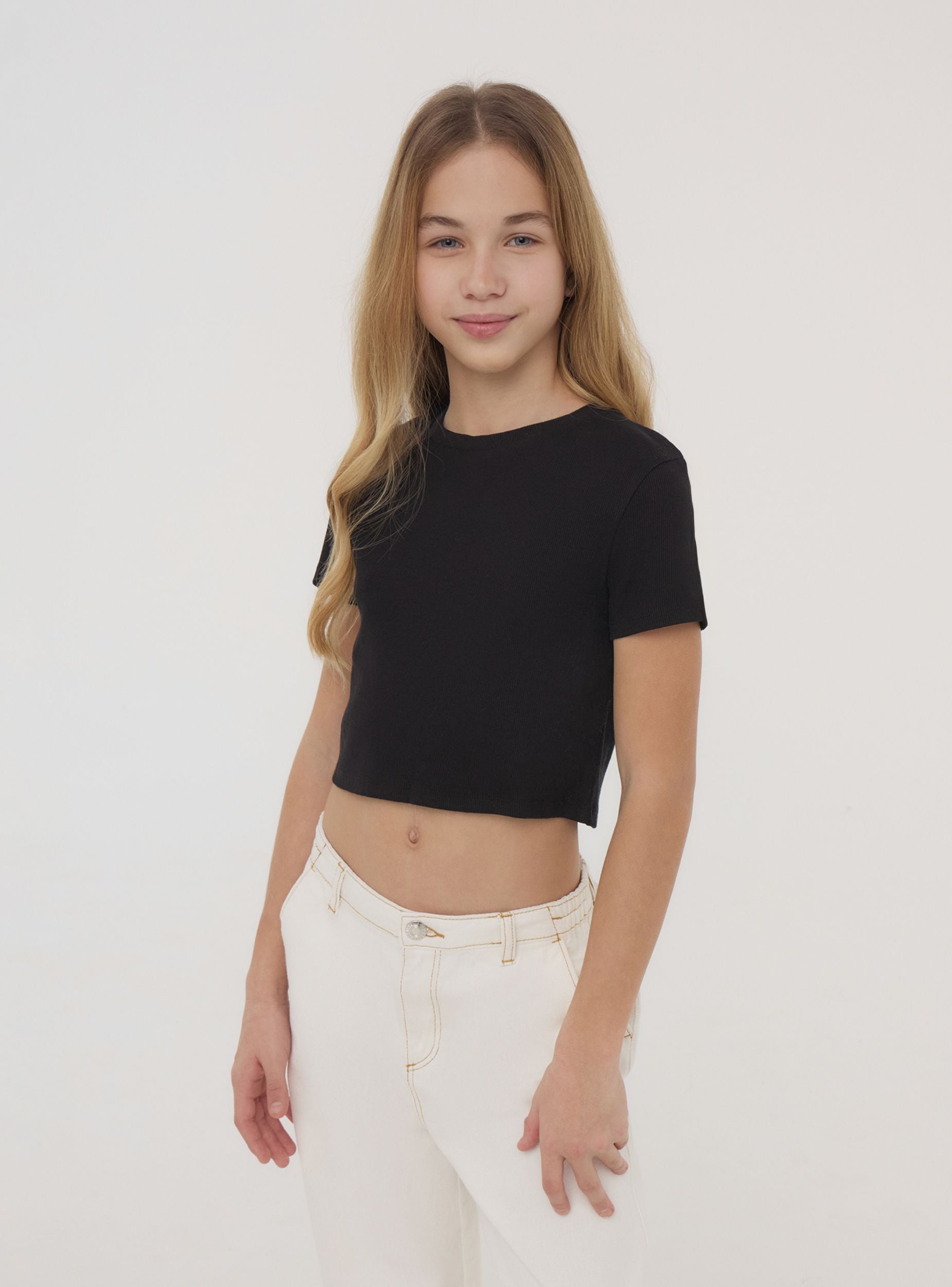 Majica za djevojčice savršena za dovršavanje ležernog i modernog izgleda, idealna za školu ili slobodno vrijeme. S kratkim rukavima i okruglim izrezom, model kratkog kroja u jednobojnoj boji ističe se po rebrastom materijalu koji dodaje dašak suvremenog stila. Svestrana i udobna, prikladna za svaku priliku.