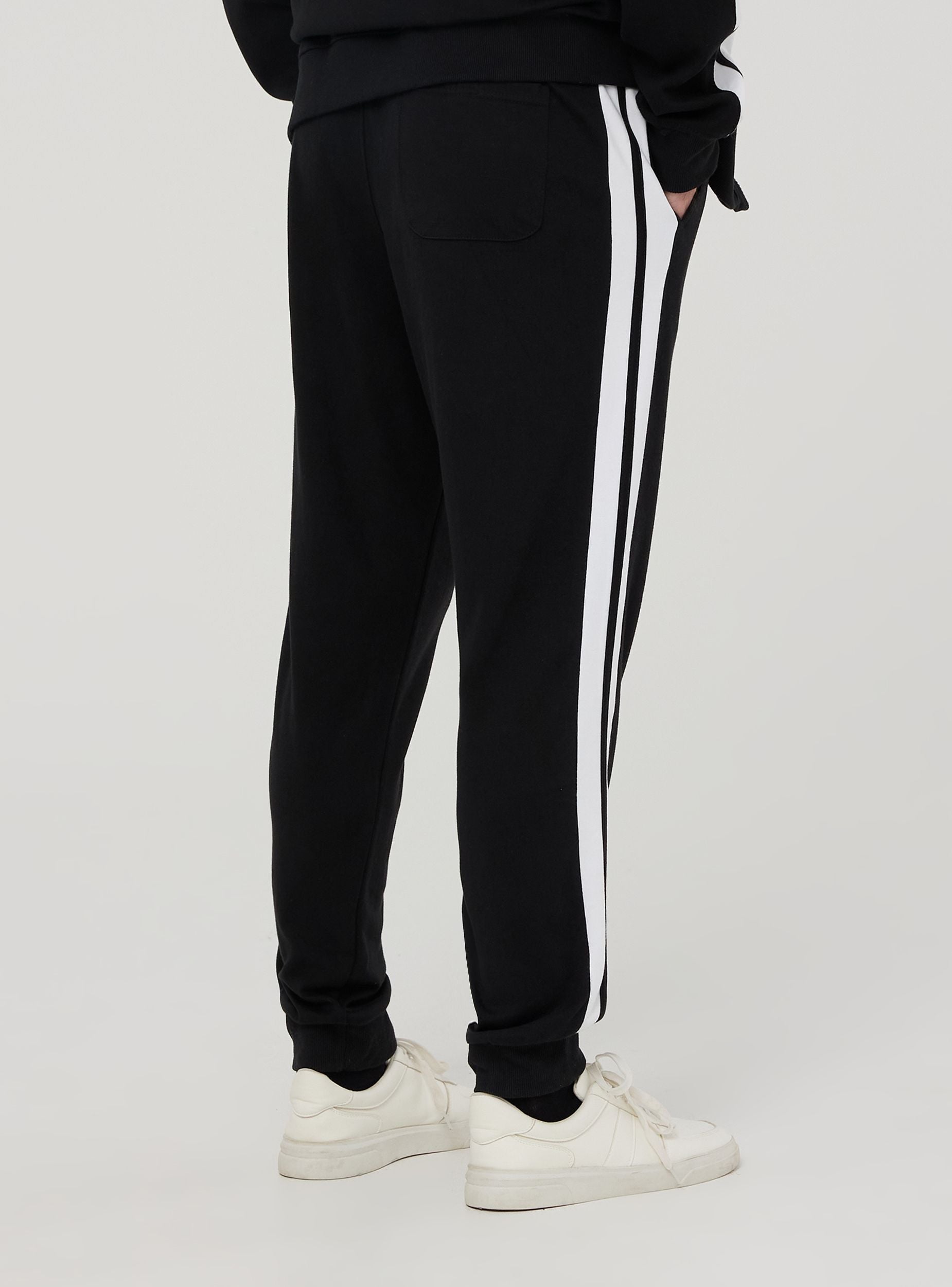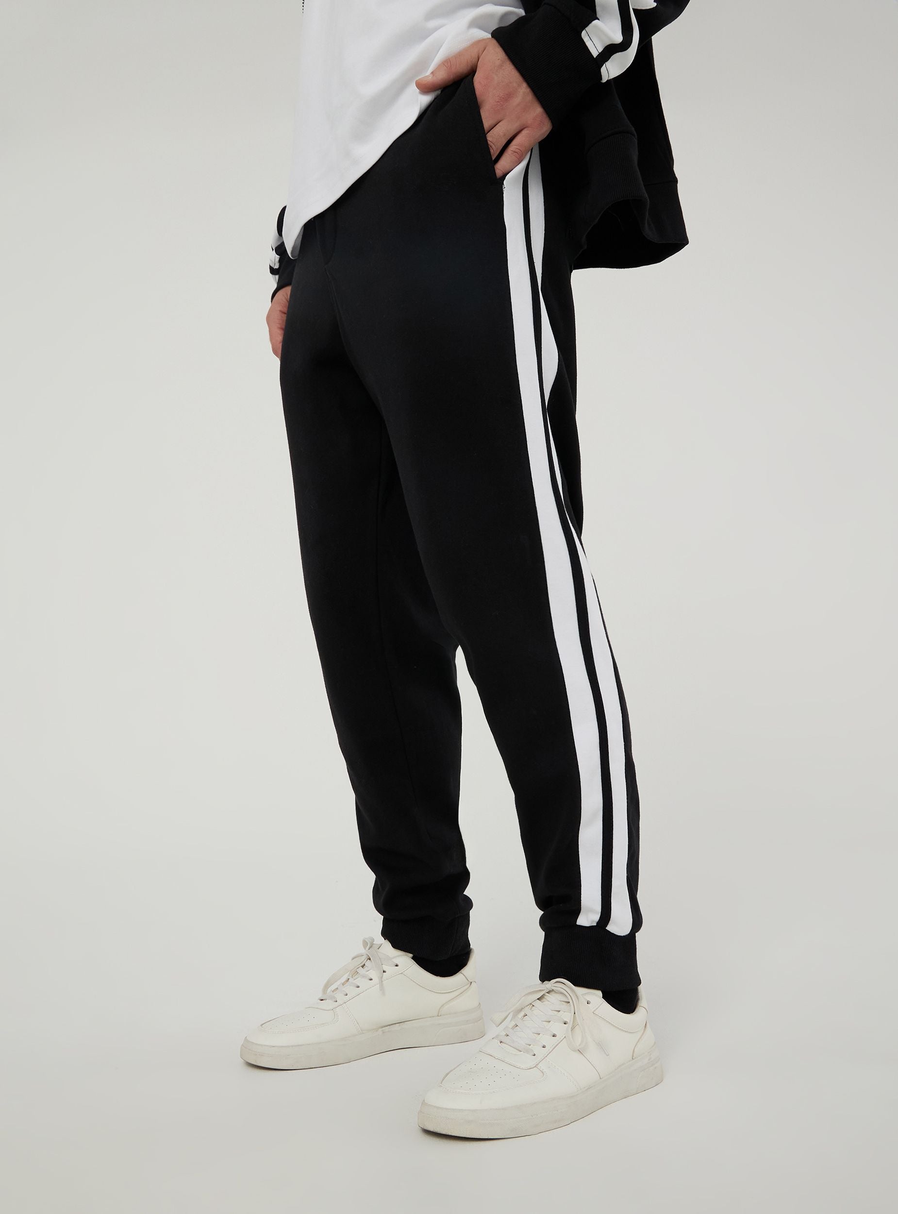 Muški trenirci od interlock tkanine s elastičnim manžetama na gležnjevima. Dizajn uključuje vezanje s vezicom u struku, dva bočna džepa i jedan stražnji. Bočne trake dodaju dašak stila odjeći, čineći je pogodnom za trening i ležerni izgled.Detalji
