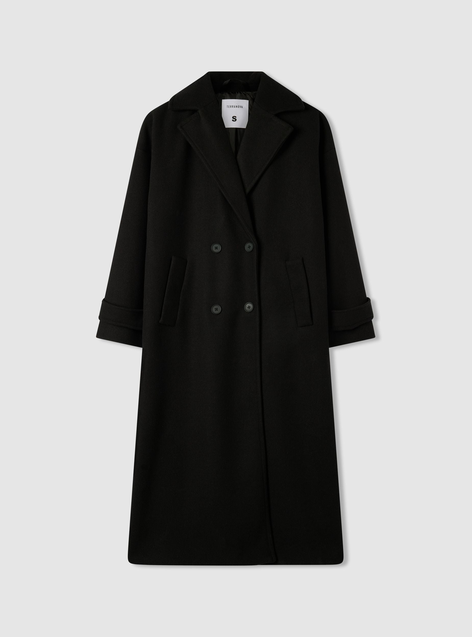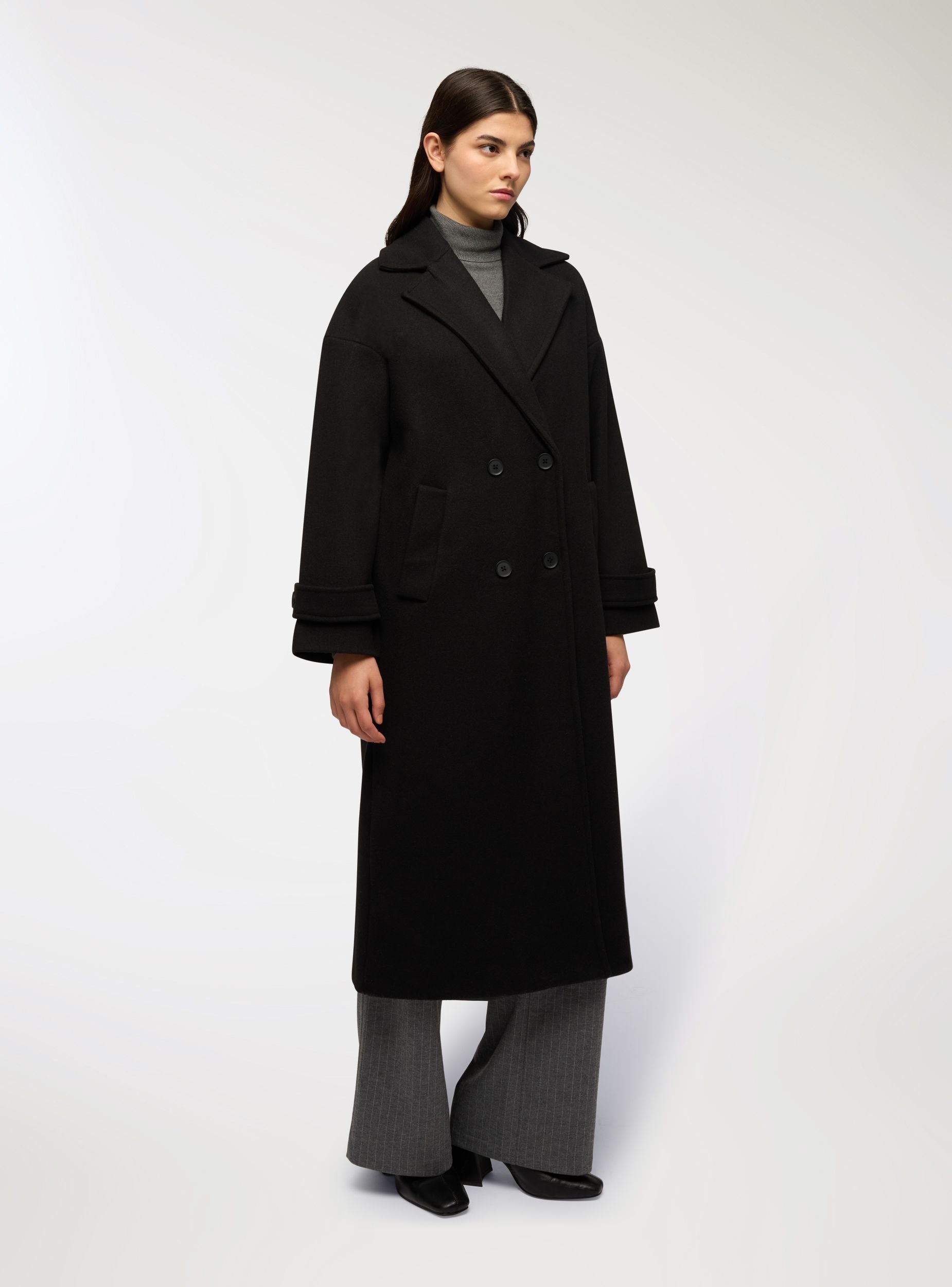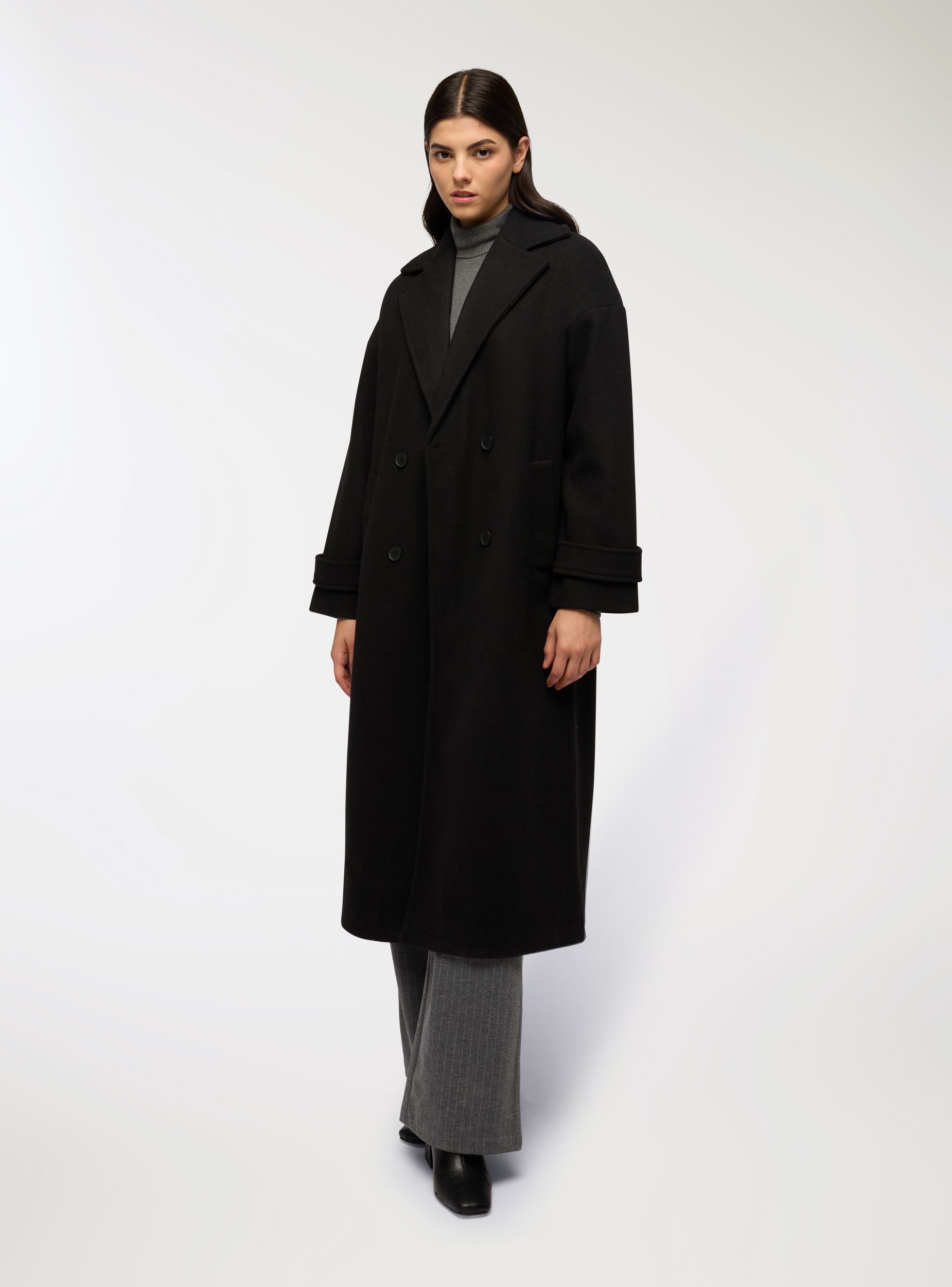 Ženski dugi dvoredni kaput, idealan za formalne i profesionalne prilike. Ima oversize kroj, zatvaranje na kopče i bočne džepove. Elegantni dizajn i duljina čine ga savršenim za upotpunjavanje sofisticiranih outfita. Dobro se slaže s klasičnim hlačama i elegantnom obućom, pružajući profinjen i bezvremen izgled.