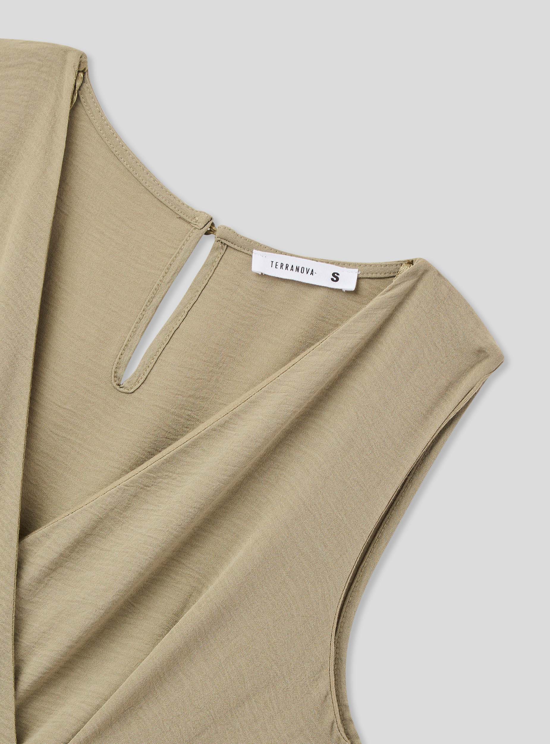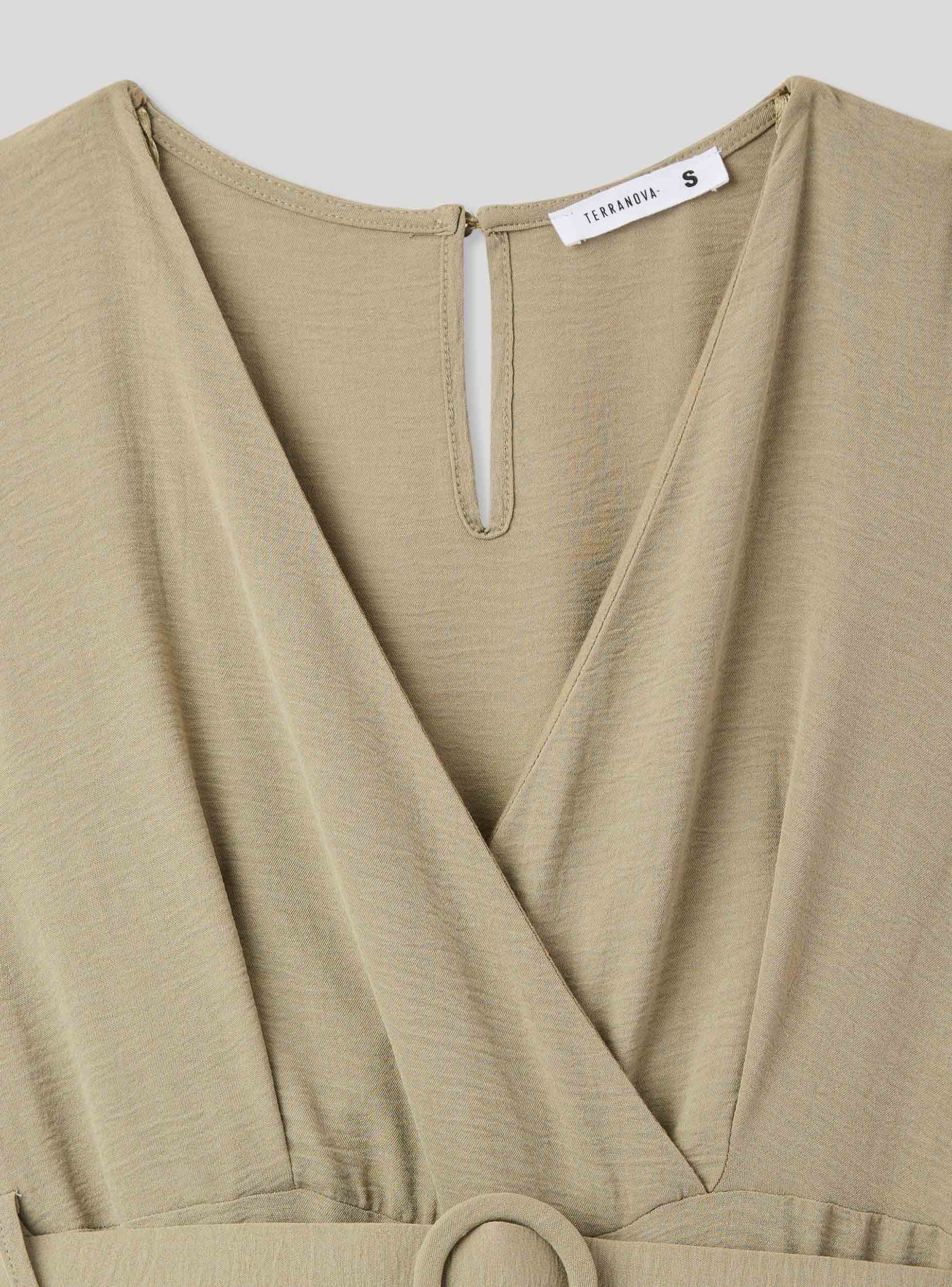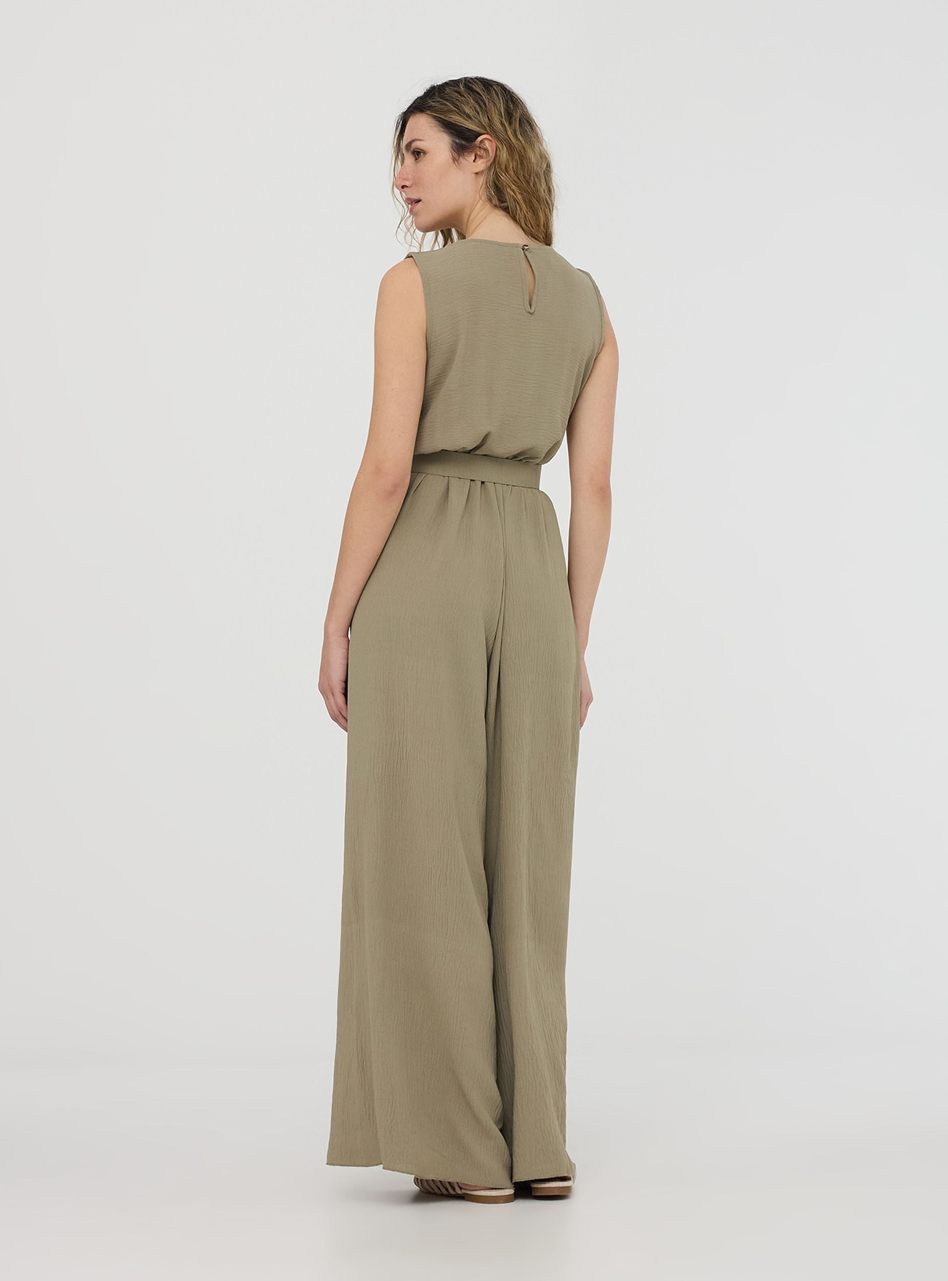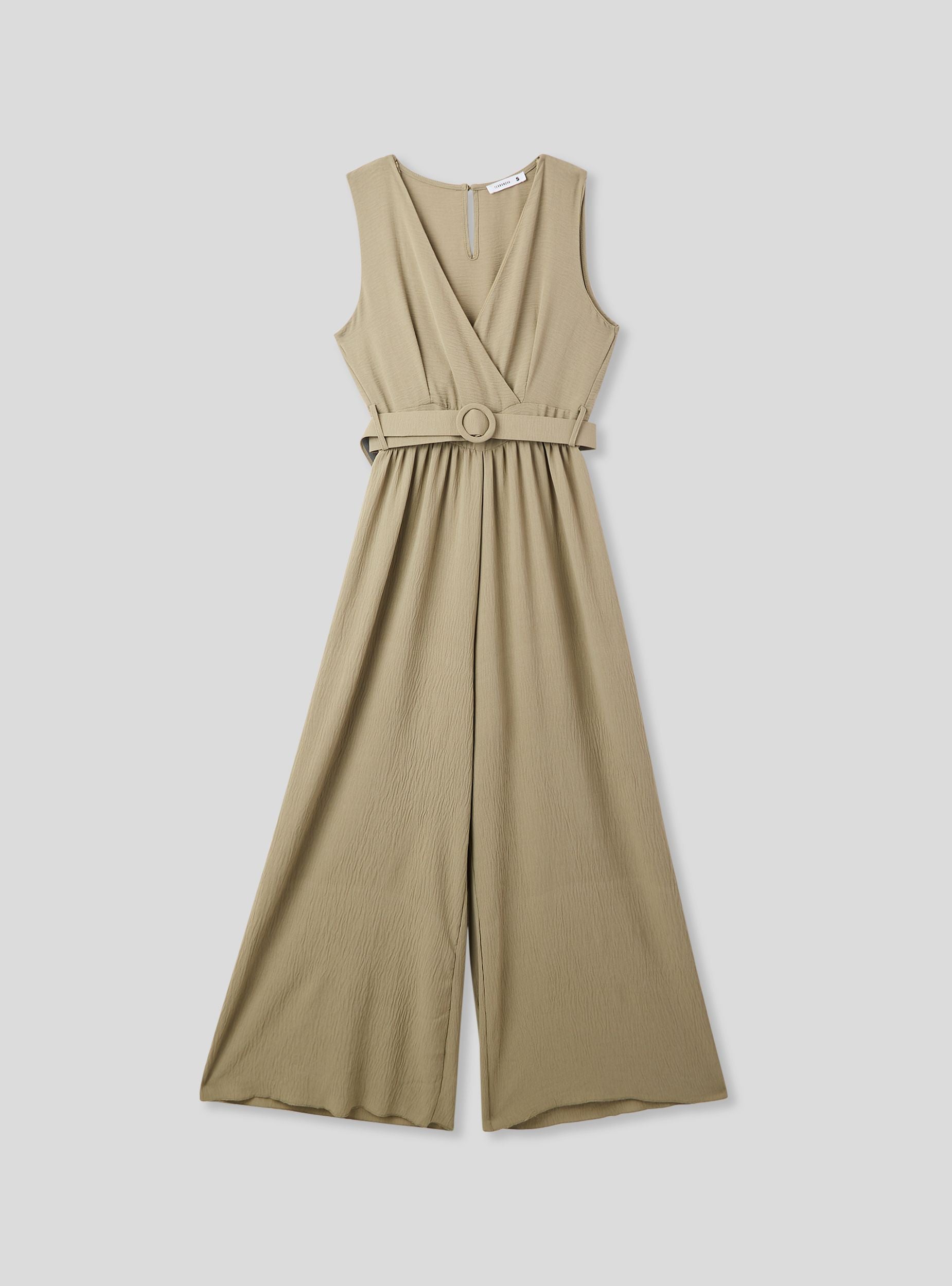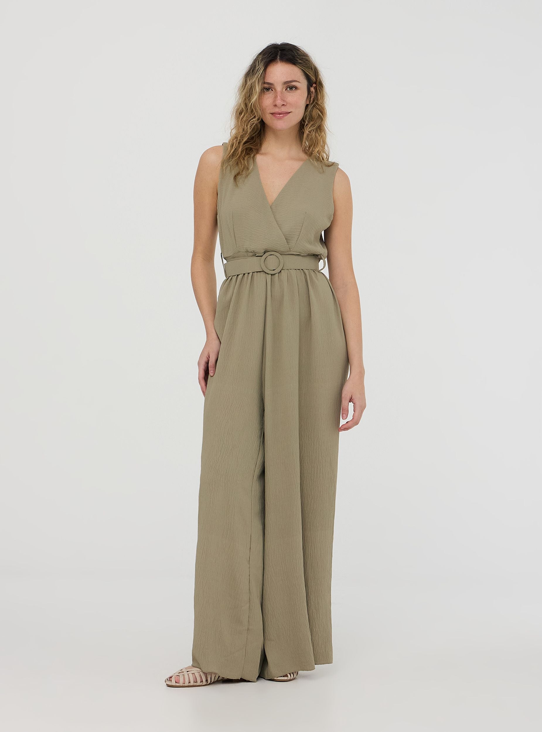 Ženska duga kombinezon, karakterizirana preklopnim dizajnom koji ističe figuru, nudi sofisticiran i moderan stil. Pojas u struku s kopčom dodaje elegantan dodir oblikujući siluetu. Ovaj svestrani komad, u jednobojnoj boji, zamišljen je za suvremen i chic izgled, prikladan za večernje događaje kao i za opuštenije prilike, u kombinaciji s sandalama ili potpeticama. Udobna kroja i izdužena linija upotpunjuju dizajn, čineći ga idealnim izborom za one koji traže eleganciju i praktičnost u jednom rješenju.Detalji