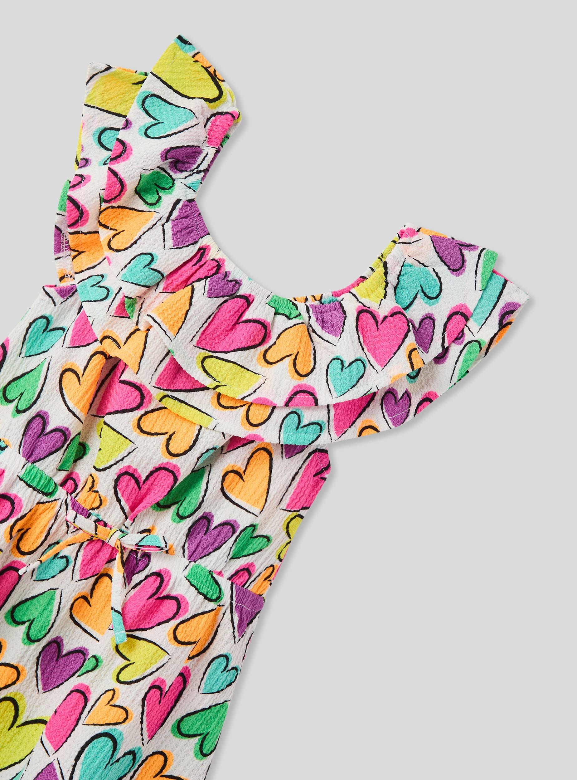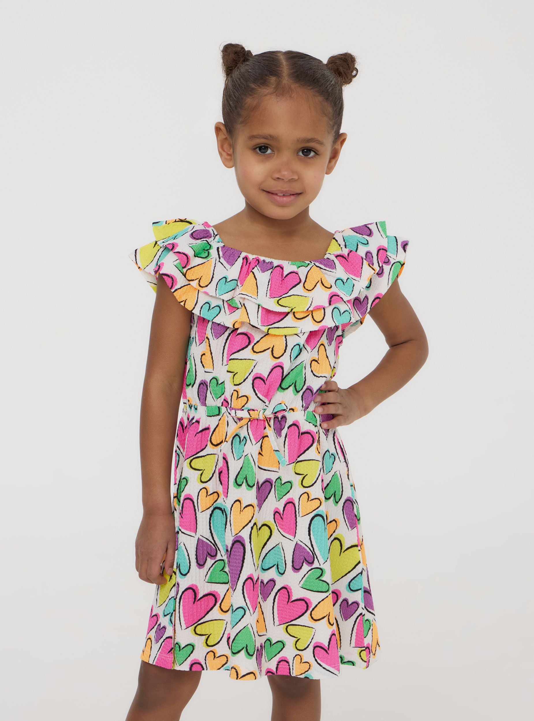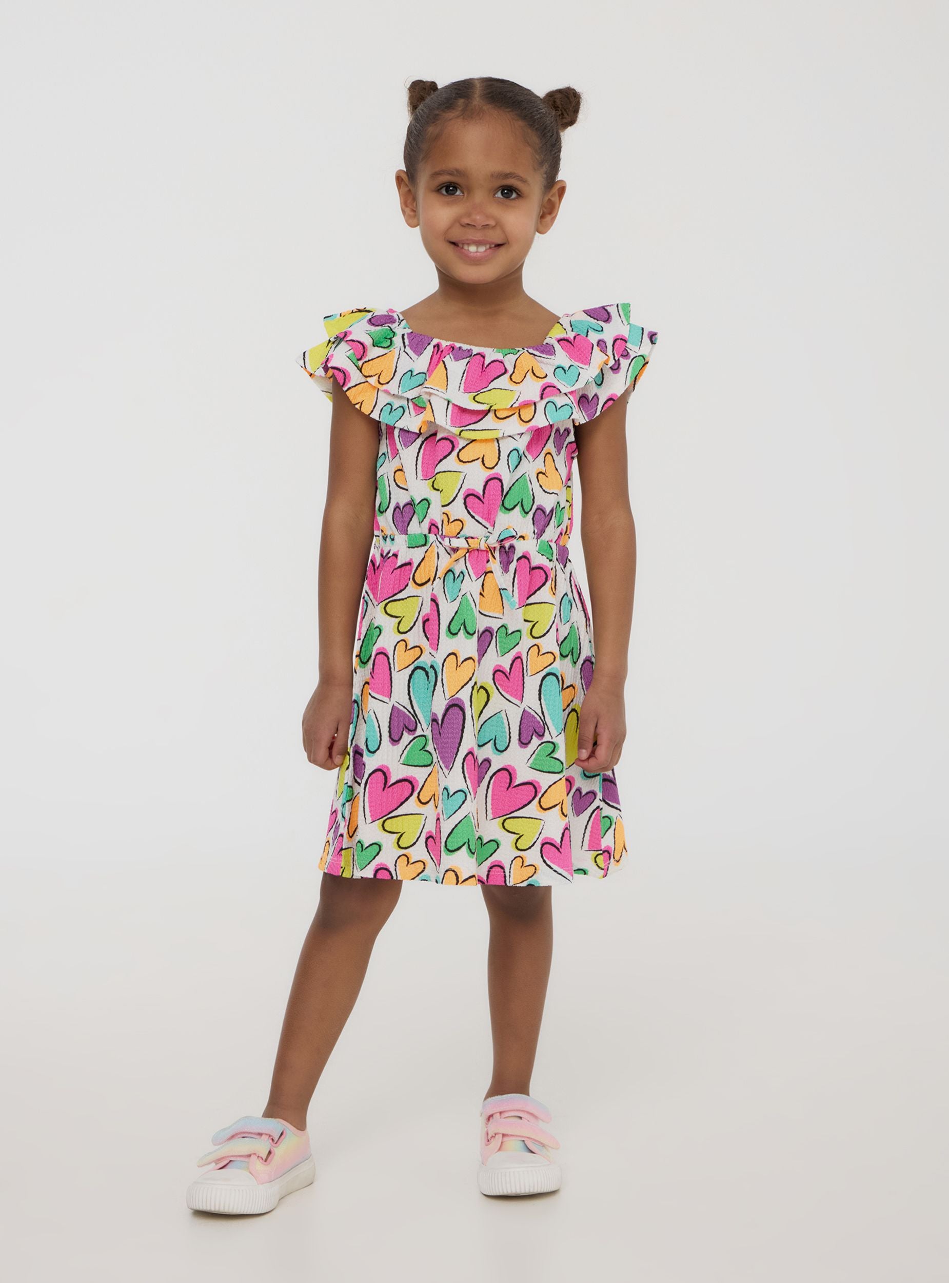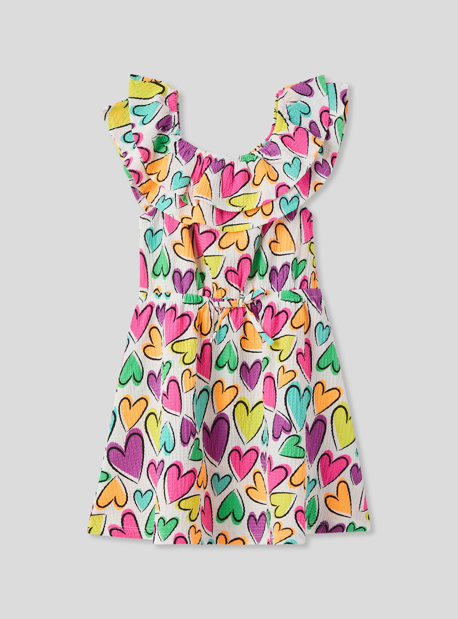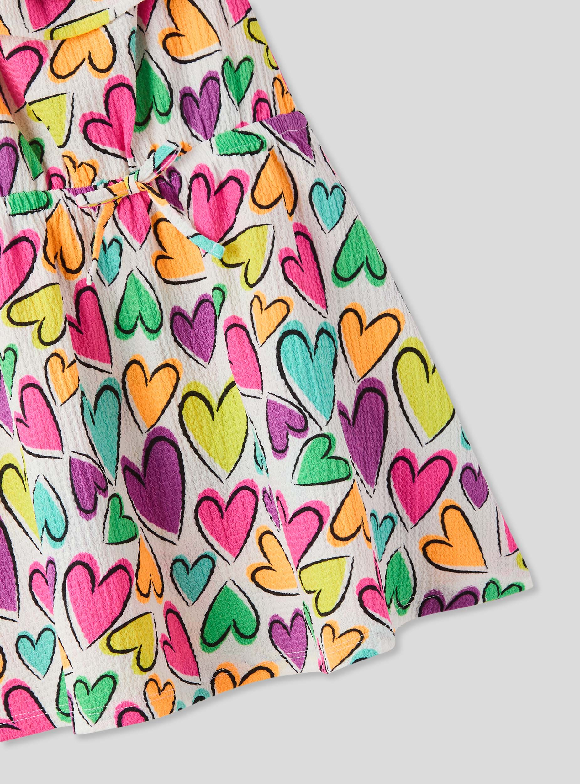 Haljina za djevojčice obogaćena šarenim uzorkom s srcima. Dizajn sadrži lijepe volane koji daju romantičan i veseli dodir. Idealna za male koje vole osjećati se jedinstveno i moderno, savršena za posebne prigode ili za dodavanje malo radosti u svaki dan.Detalji