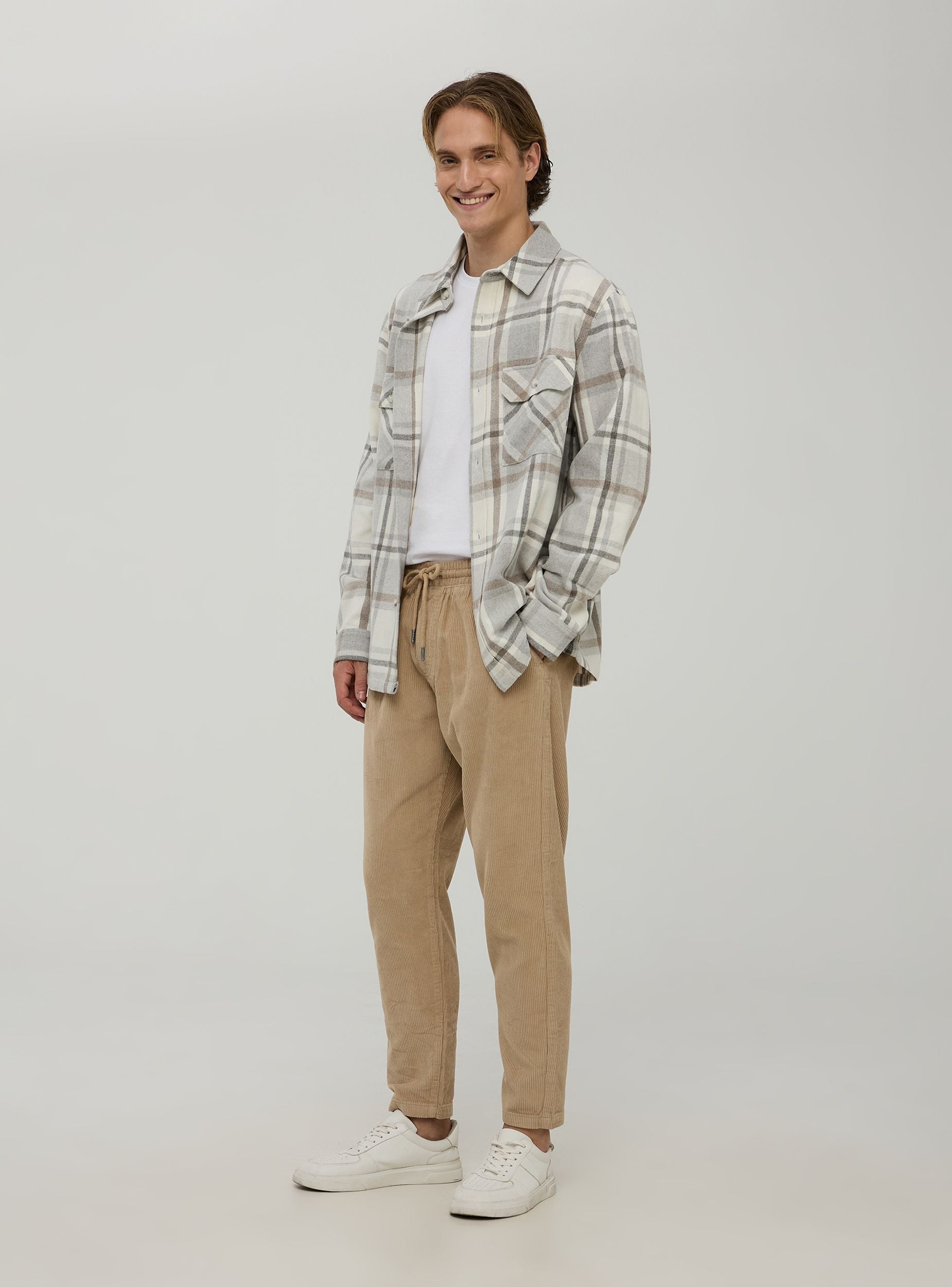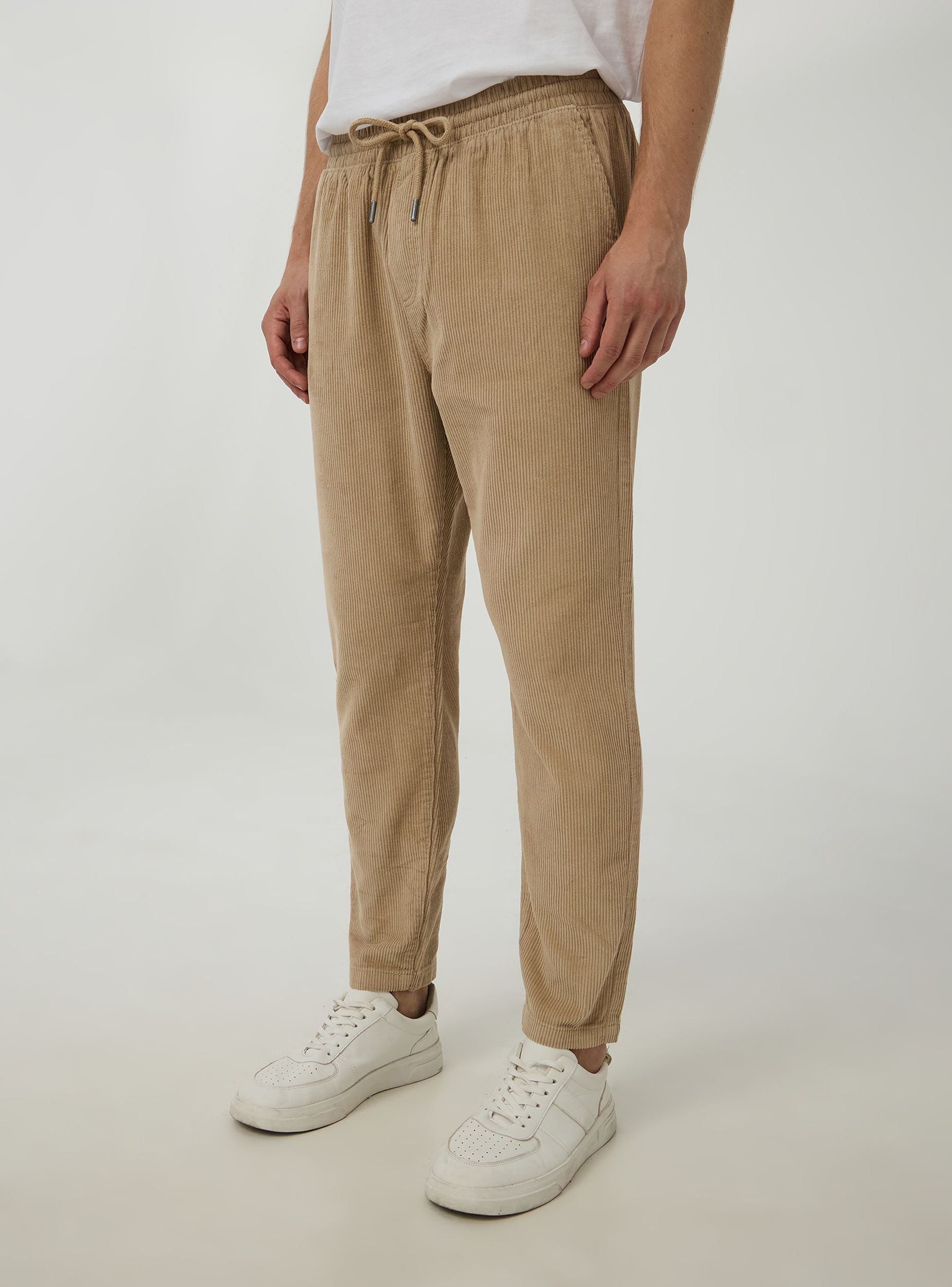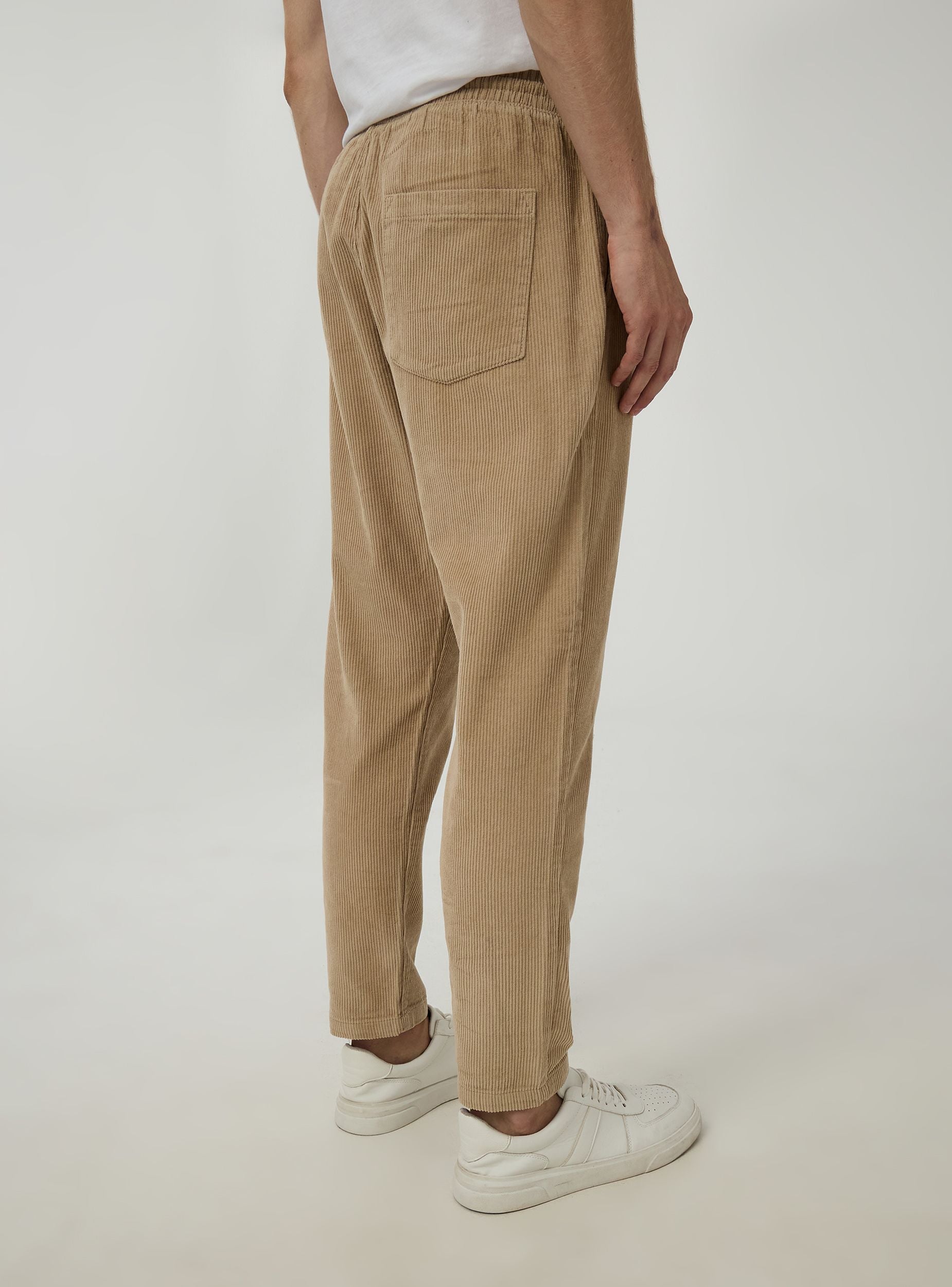 Muški hlače izrađene od jednobojnog tkanog velura. Opremljene su elastičnom trakom u struku za optimalno podesivo pristajanje, dvije bočne džepove i jedan stražnji džep. Savršene za ležerne i udobne kombinacije.Detalji
