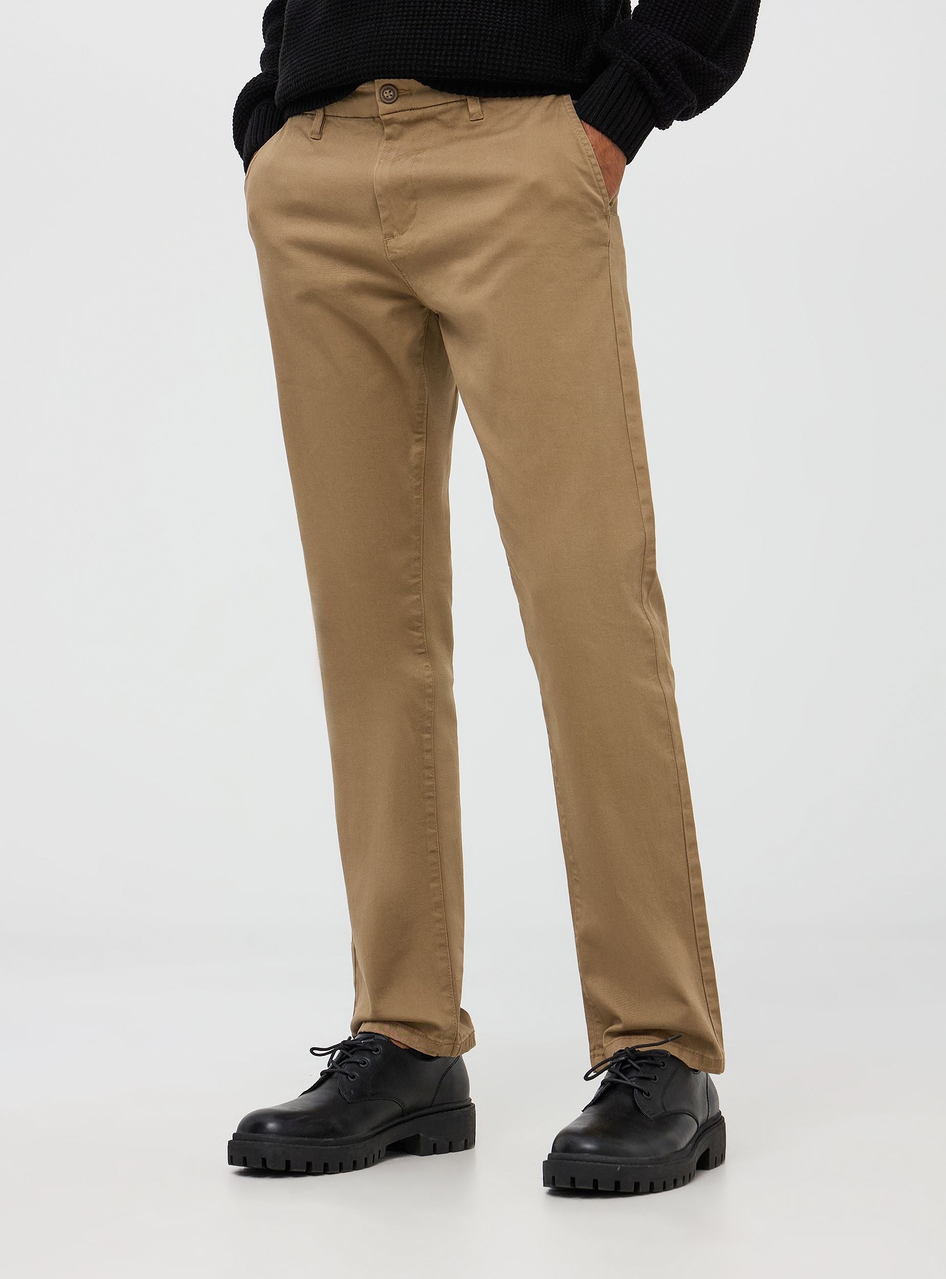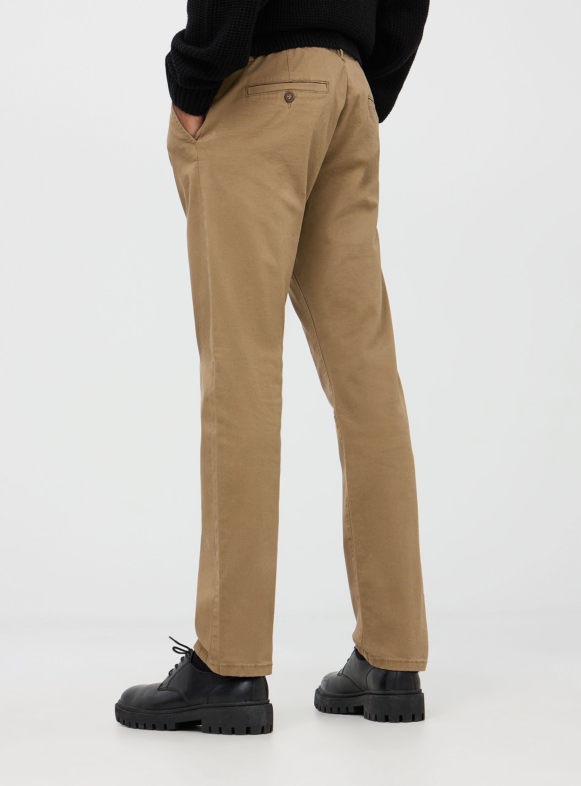 Muške hlače, model chino, karakterizirane elastičnom pamučnom tkaninom. Imaju elastičan pojas za veći komfor, s petljama za remen i zatvaranjem na gumb i patentni zatvarač. Imaju četiri džepa: dva bočna koso i dva stražnja ušivena. Noga hlača ima ravnu liniju, dajući čist i klasičan izgled. Ove chino hlače su idealne za različite prilike, kako ležerne, tako i polu-formalne. Zahvaljujući svojoj svestranosti, mogu se nositi u uredu, u kombinaciji s košuljom i blejzerom, ili u neformalnijim kontekstima s majicom ili laganom džemperom.
