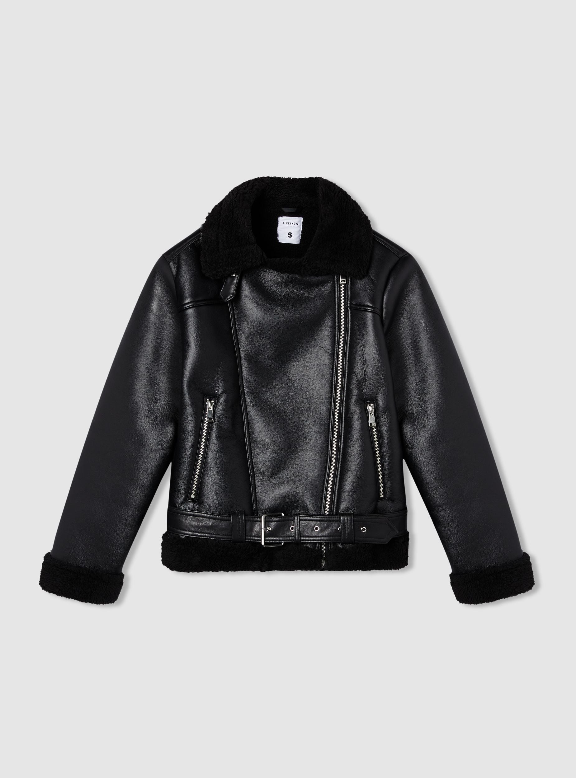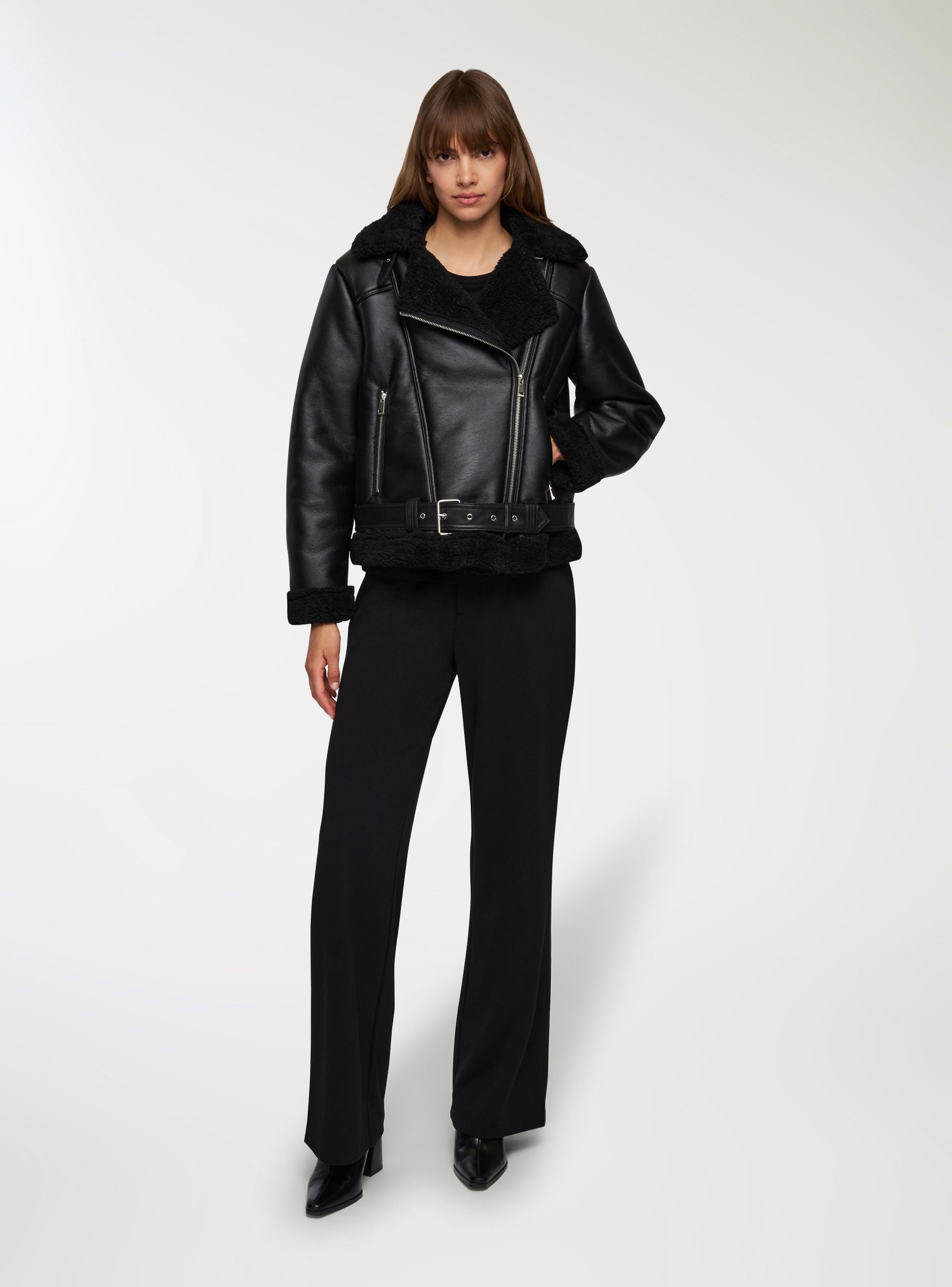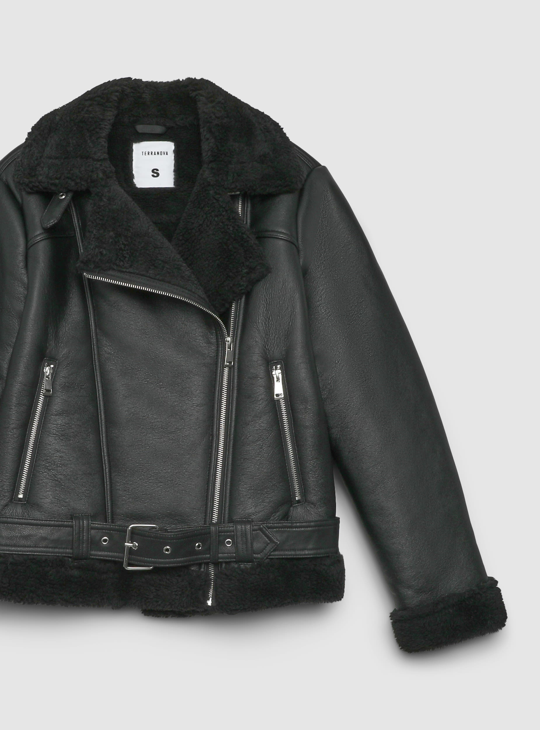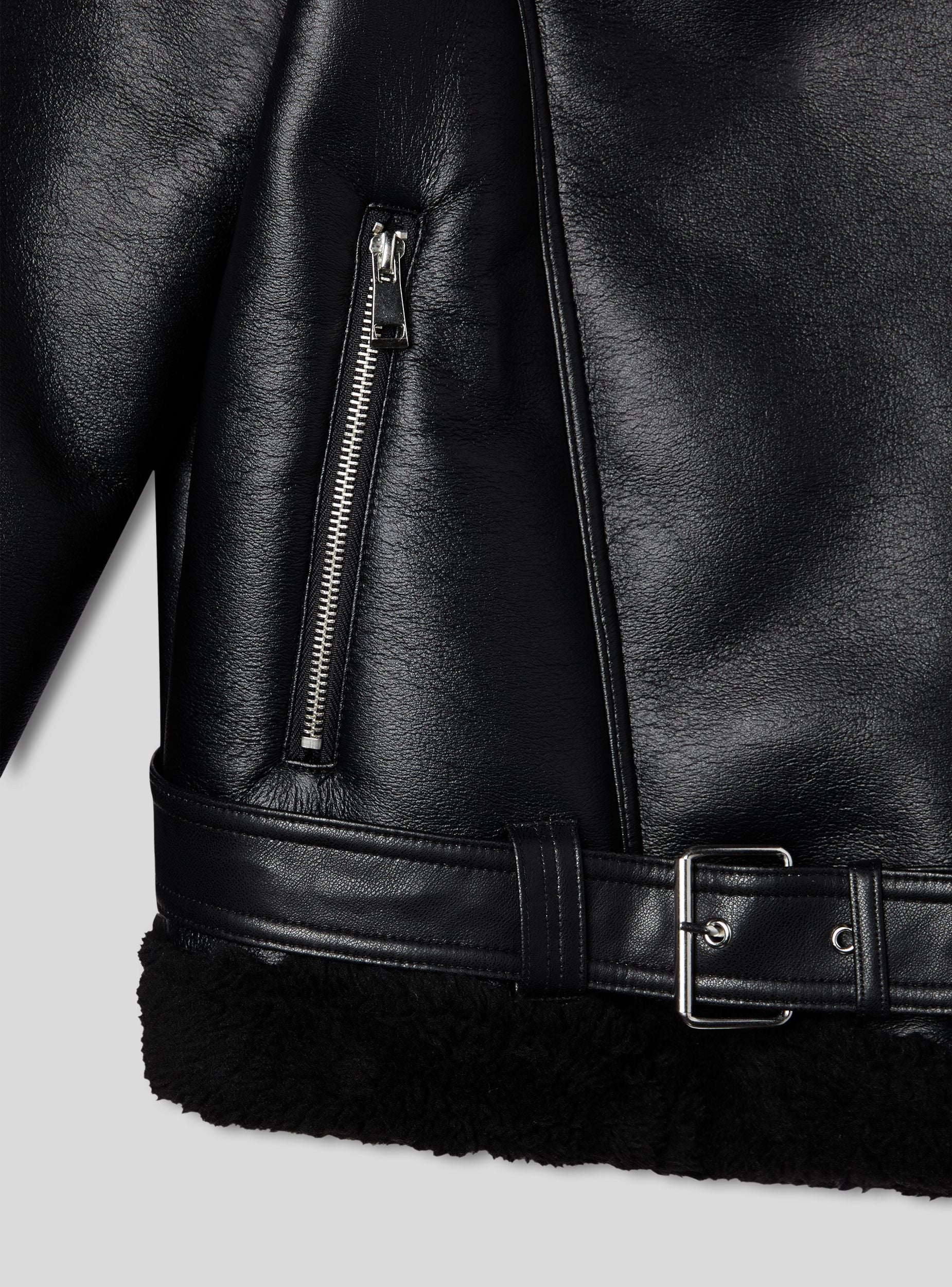 Ženska jakna od sintetičke ovčje vune, savršena za urbani i moderni izgled. Idealna za svježe dane, ova jakna se ističe svojim biker stilom s detaljima na zatvaraču i podesivim remenom. Redovita kroja čini je udobnom i svestranom, pogodnom za kombiniranje s trapericama ili ležernim hlačama. Komad koji spaja praktičnost i stil za trendi outfit.Detalji