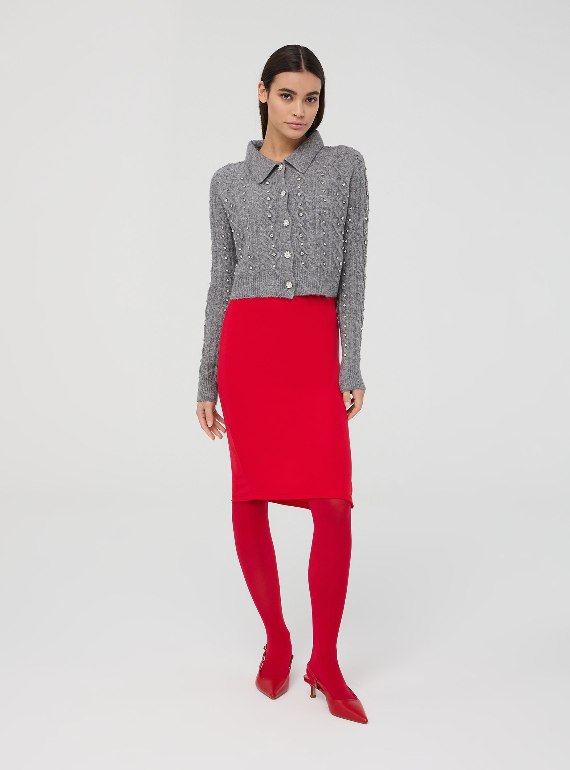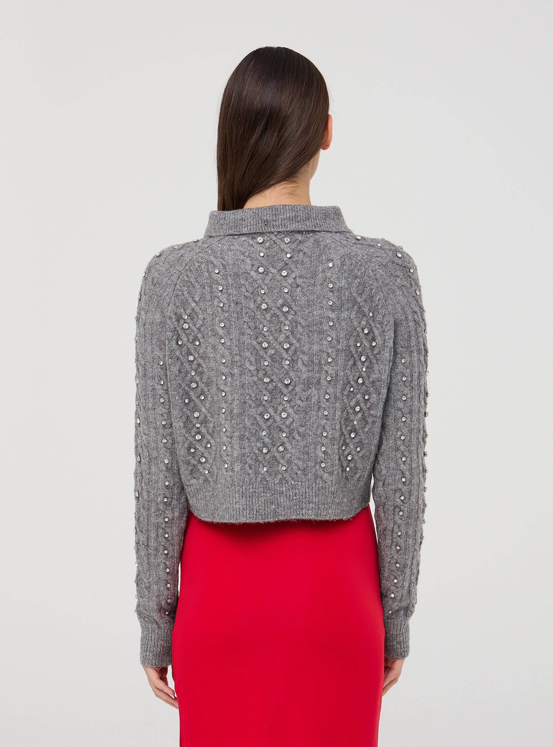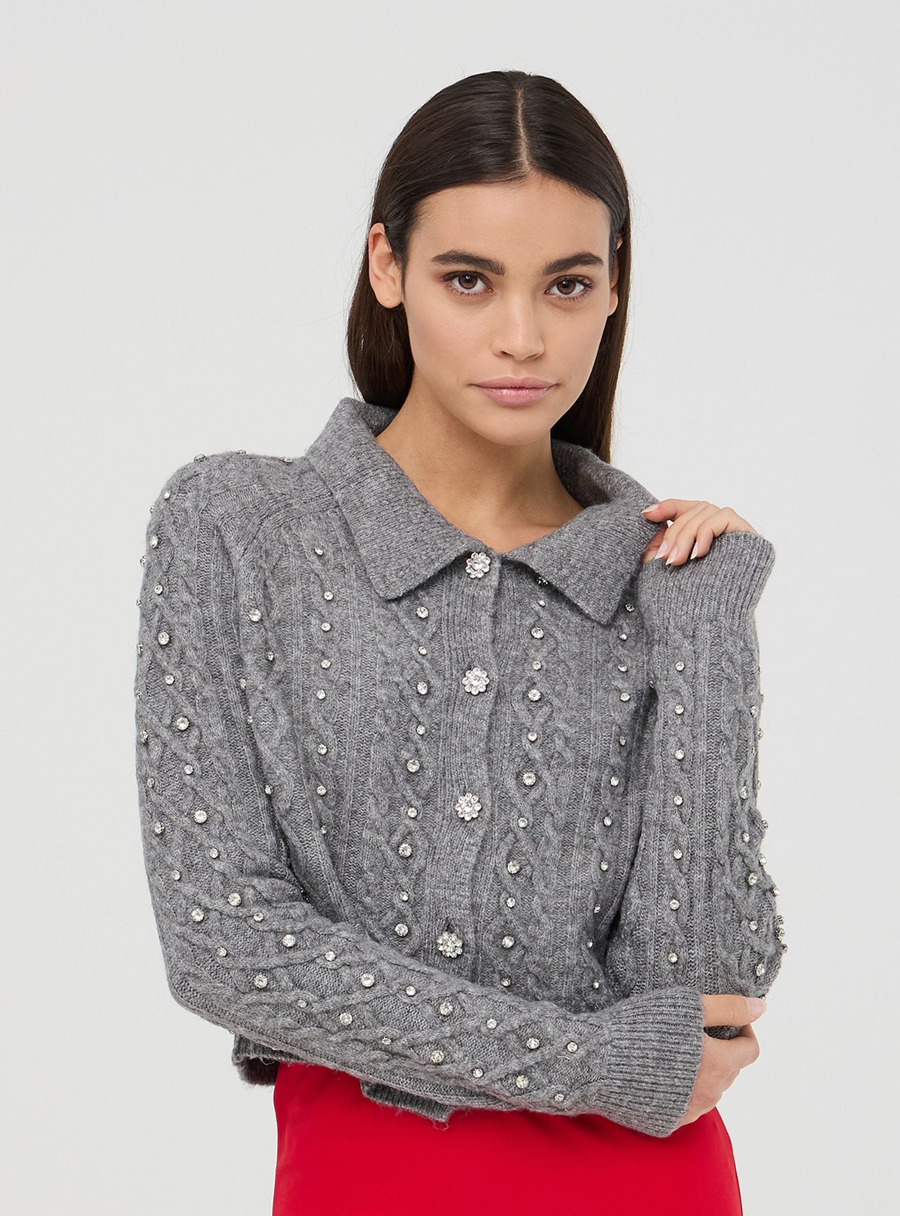 Ženski jednobojni kardigan, ukrašen rafiniranim draguljima i sjajnim detaljima od strasa koji daju dašak elegancije. Ovratnik i dugi rukavi upotpunjuju dizajn, čineći ga savršenim za ženske i sofisticirane outfite. Idealni komad za dodavanje glamura svakom izgledu, bez odricanja od udobnosti i svestranosti, savršeno za svaku posebnu ili svakodnevnu priliku.Detalji