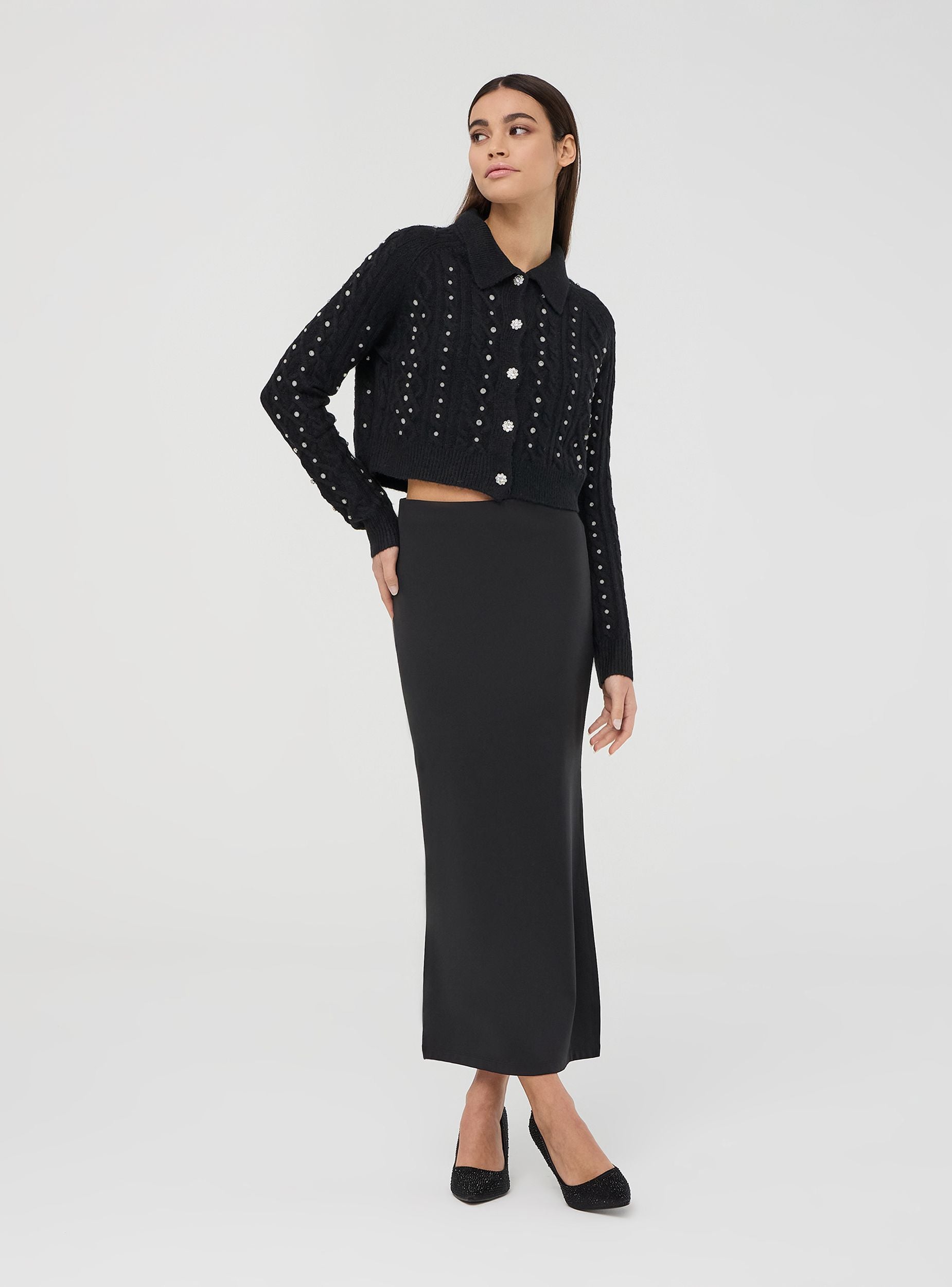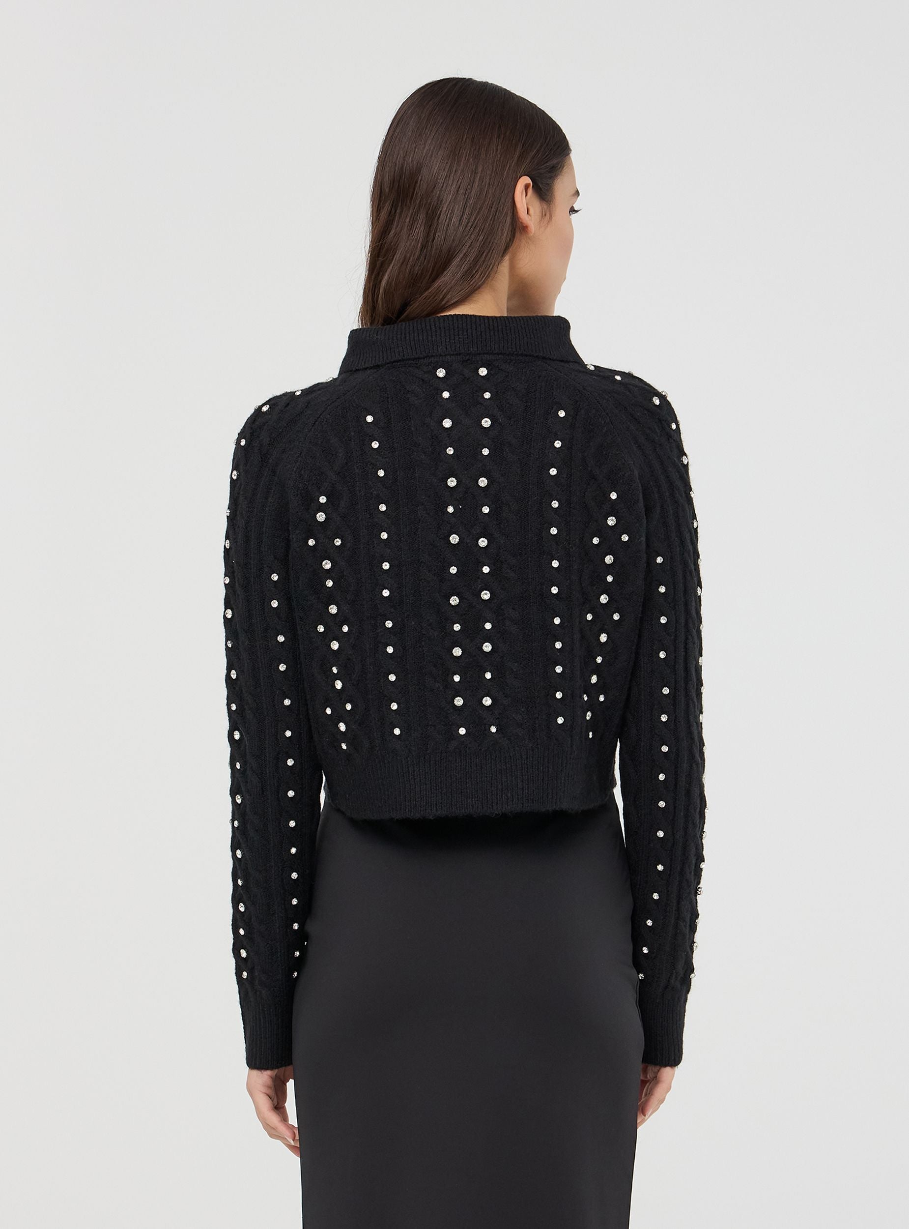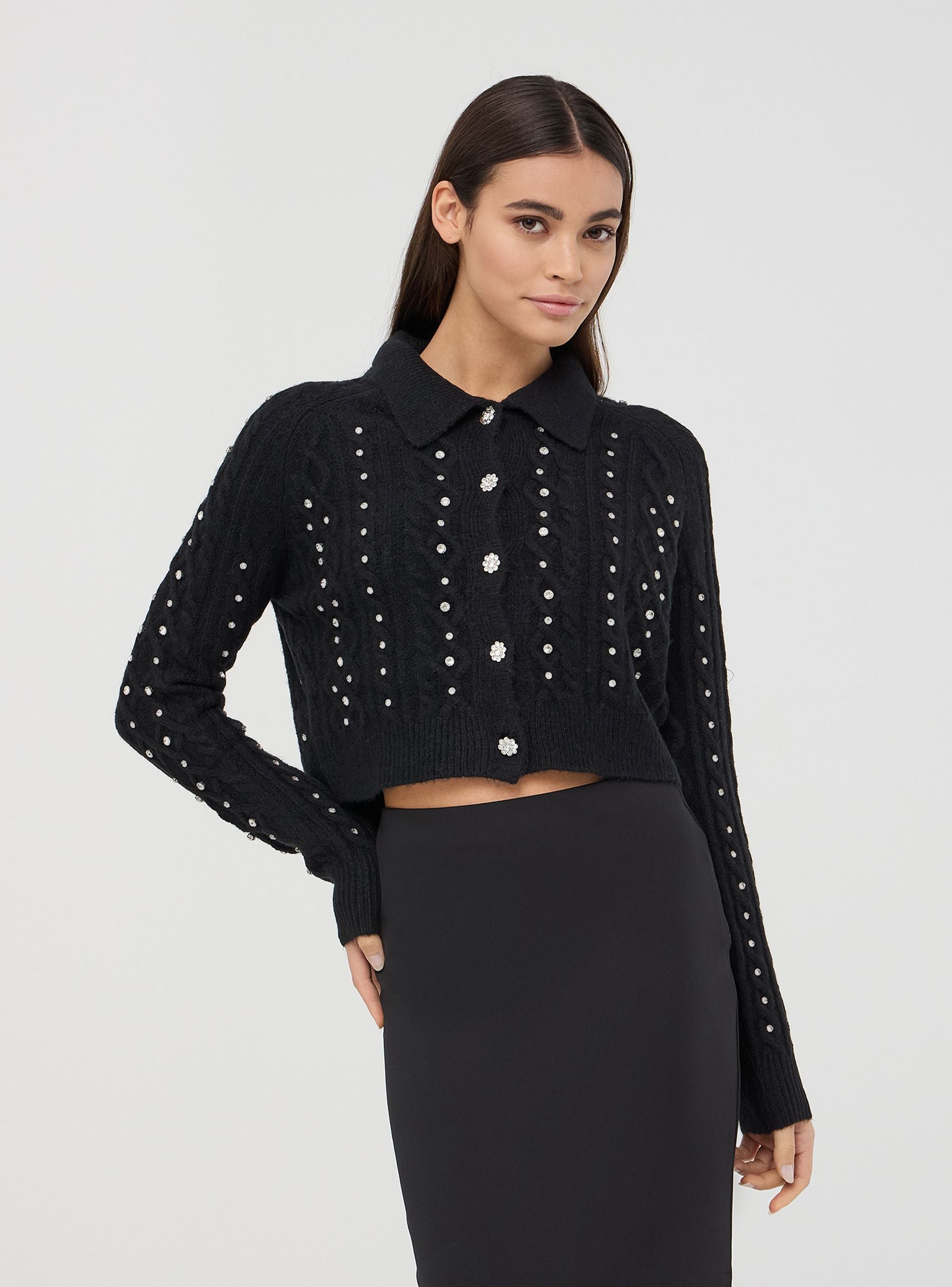 Ženski jednobojni kardigan, ukrašen profinjenim dugmadi od nakita i svijetlim detaljima od cirkona koji daju dašak elegancije. Ovratnik i dugi rukavi upotpunjuju dizajn, čineći ga savršenim za ženstvene i sofisticirane odjevne kombinacije. Idealna odjeća za dodavanje glamura bilo kojem izgledu, bez odricanja od udobnosti i svestranosti, savršena za svaku posebnu ili svakodnevnu prigodu.Detalji
