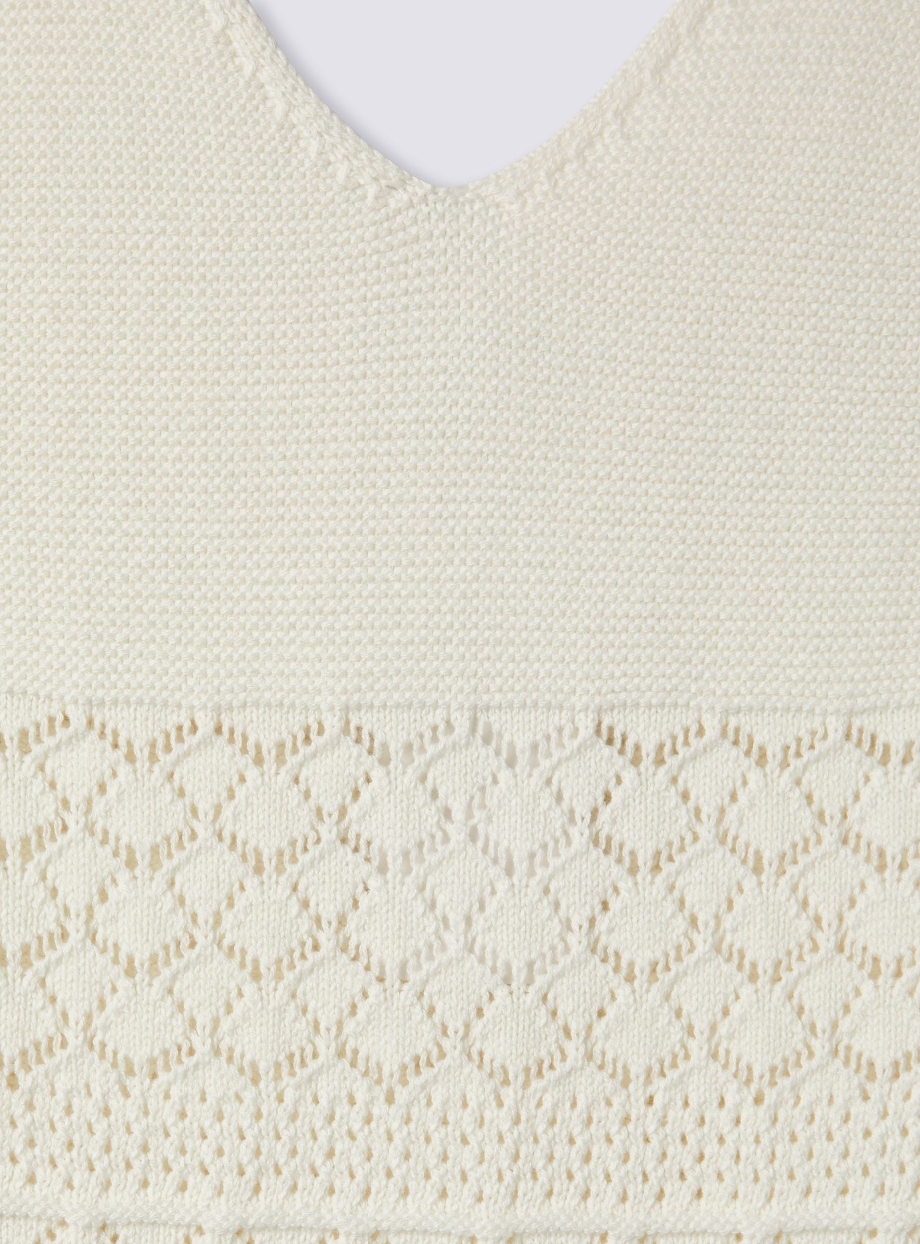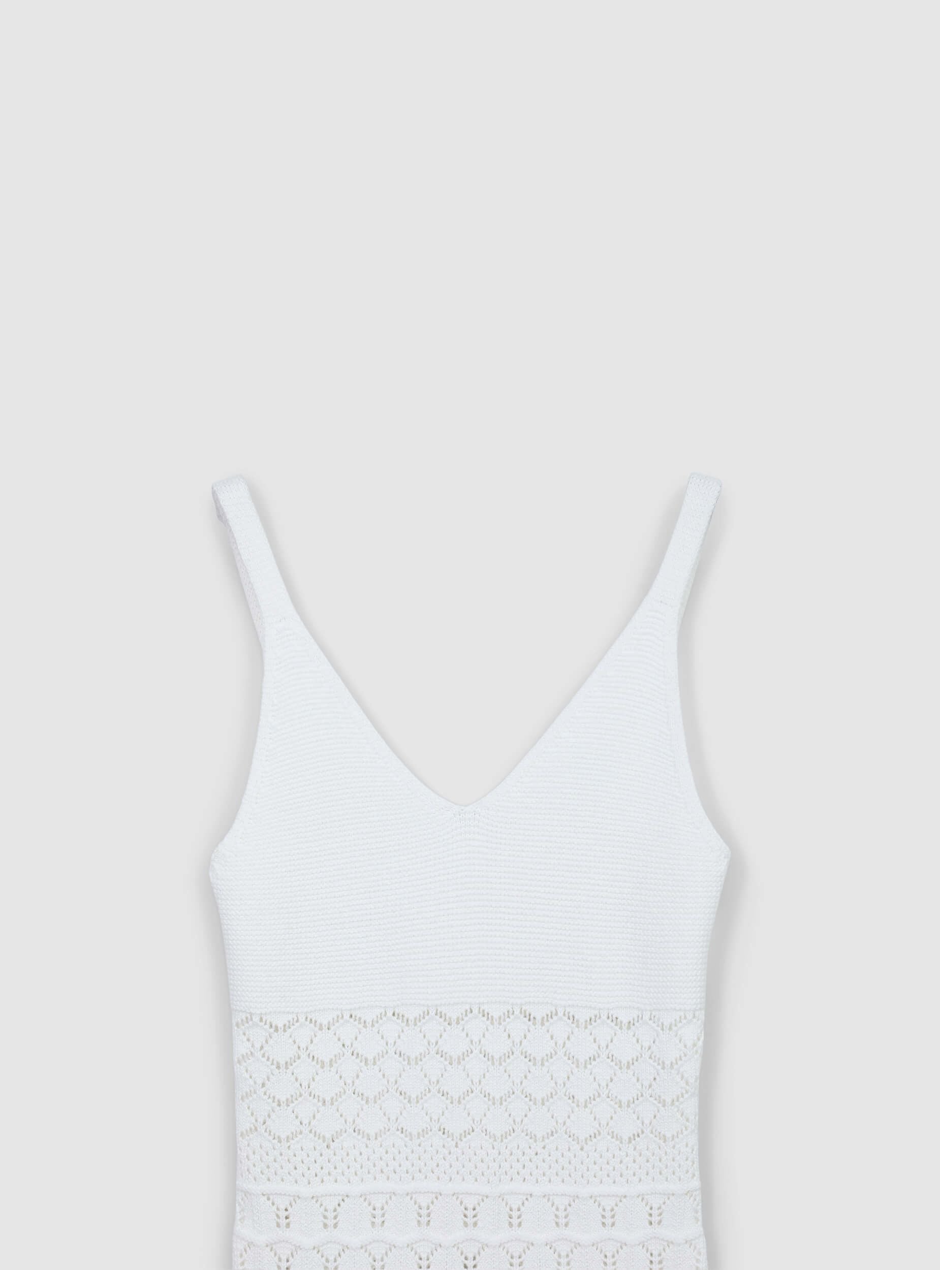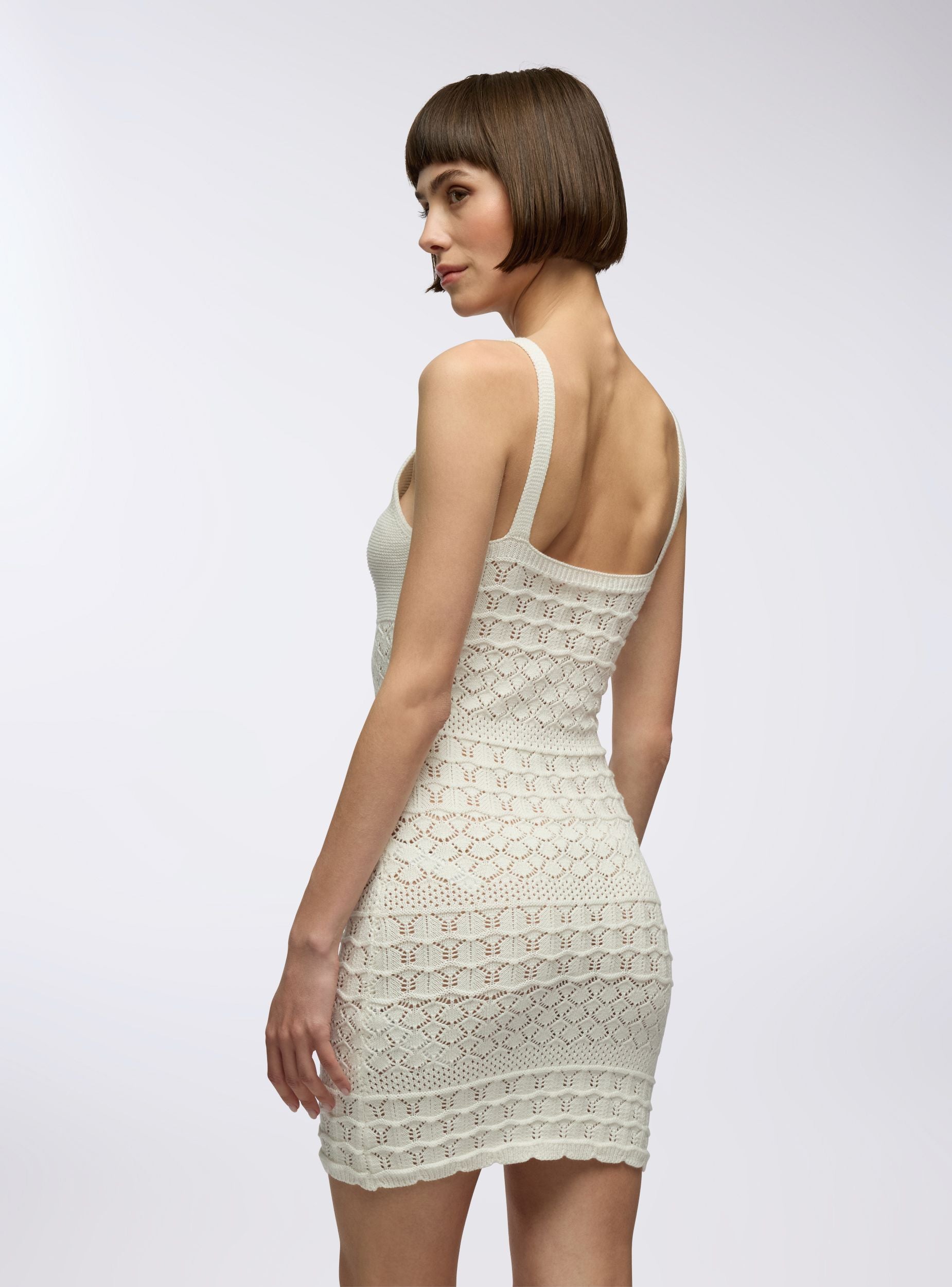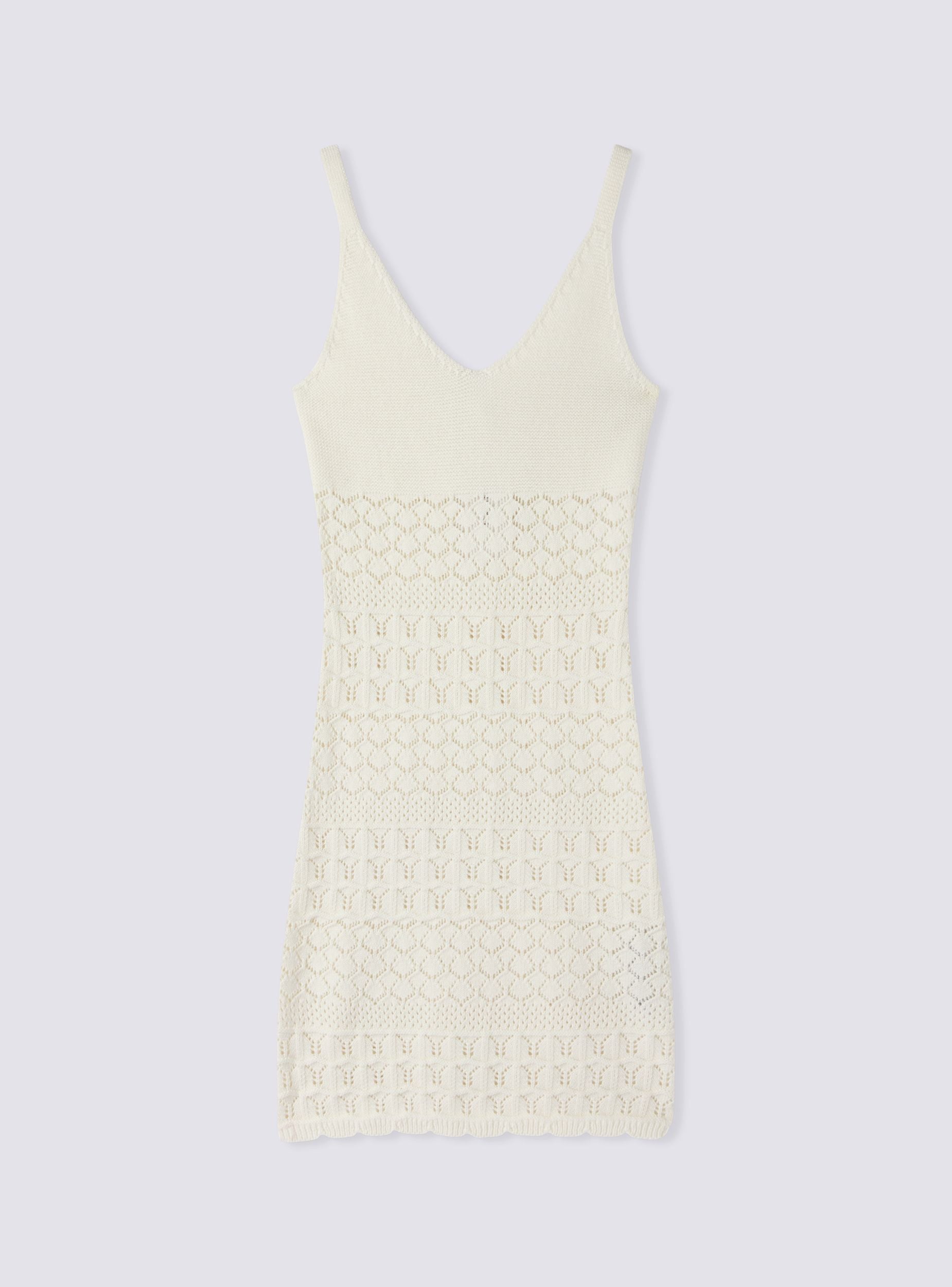 Kratka ženska haljina od prozračnog pletenog materijala, savršena za ljetni ženski i svestrani izgled. Jednostavan dizajn s tankim naramenicama ističe siluetu, dok prozračna izrada dodaje sofisticirani dodir. Idealna kao kupaći kostim na plaži ili za večernji izlazak s sandalama i minimalnim dodacima. Savršena i s laganom jaknom za casual chic stil.Detalji