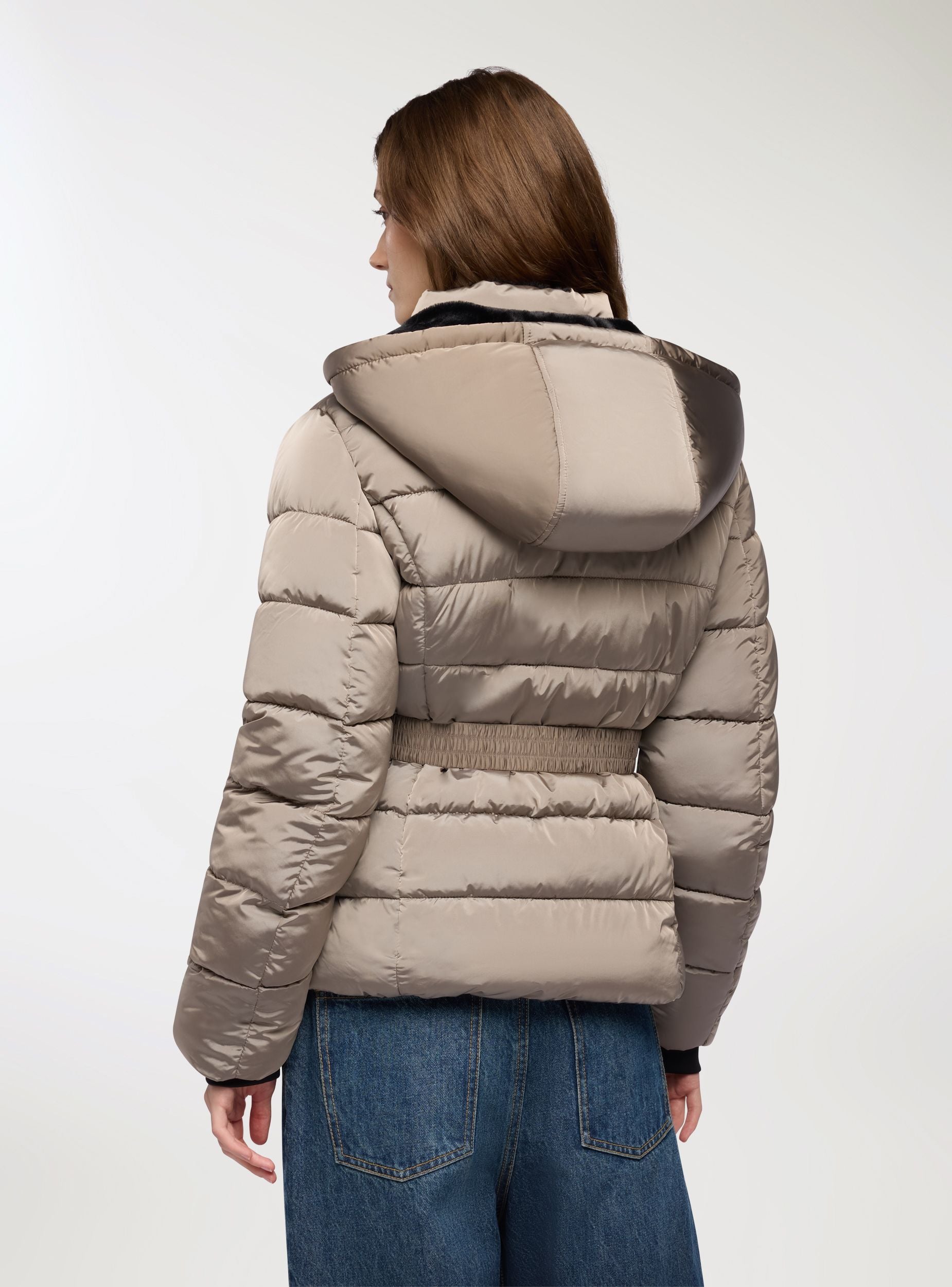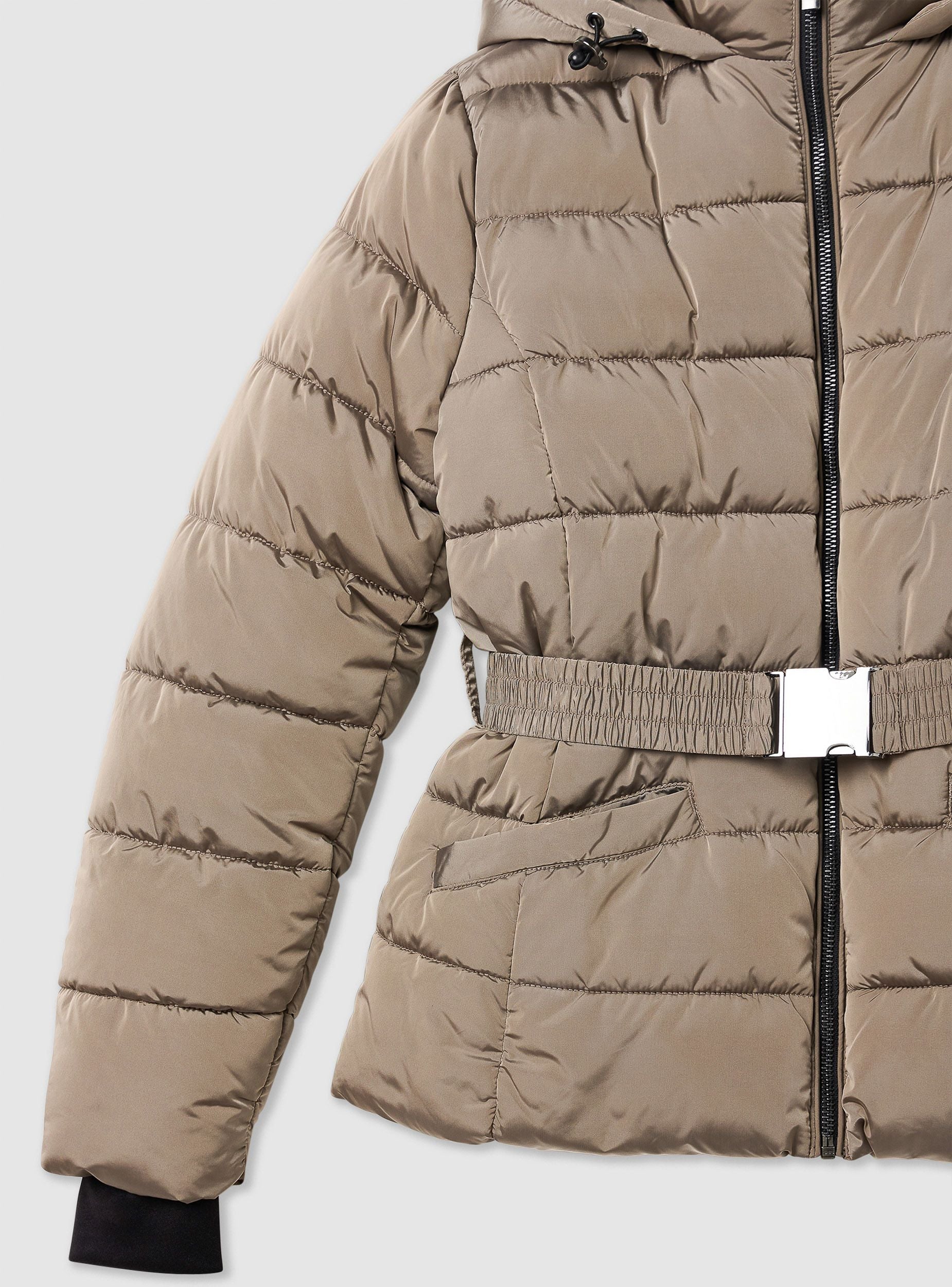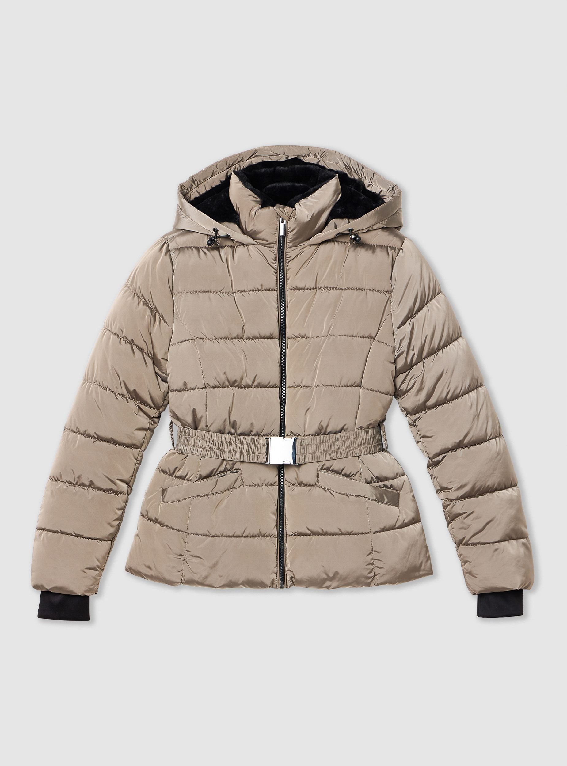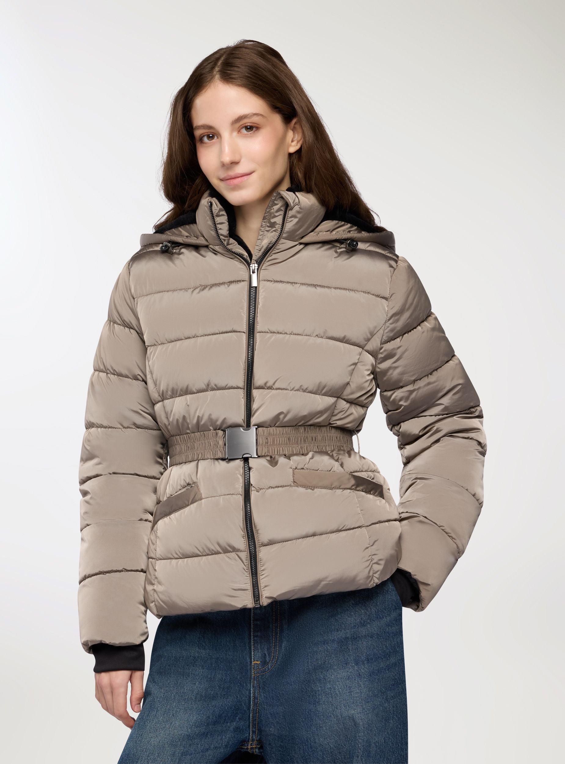 Ženska podstavljena jakna s kapuljačom, idealna za hladne dane. Ima zatvarač na patent i podesivi remen u struku za prilagođeno pristajanje. Jednobojni dizajn čini je svestranom i prikladnom za različite prilike. Savršena za upotpunjavanje ležernih i sportskih outfita, pružajući udobnost i stil.