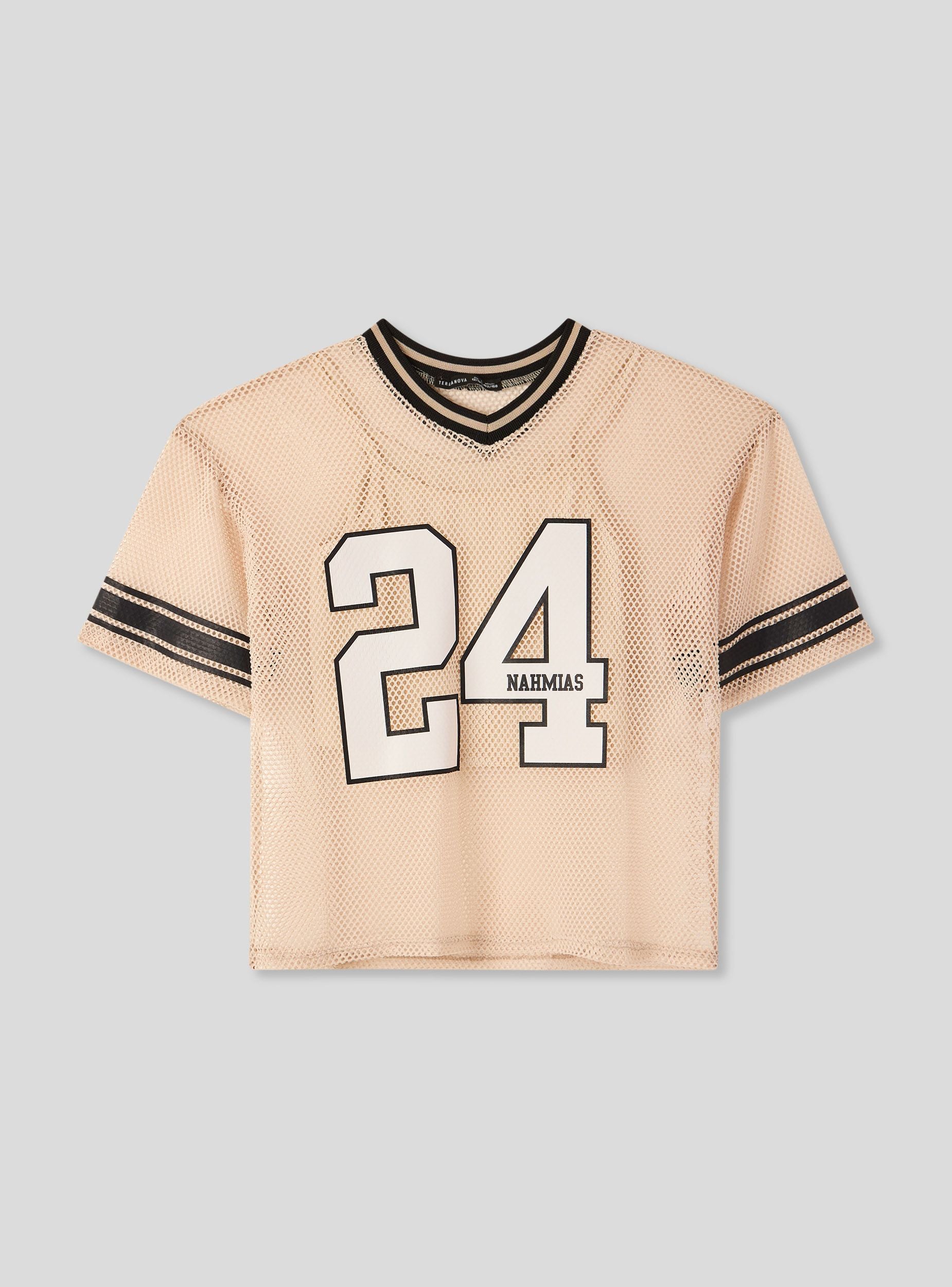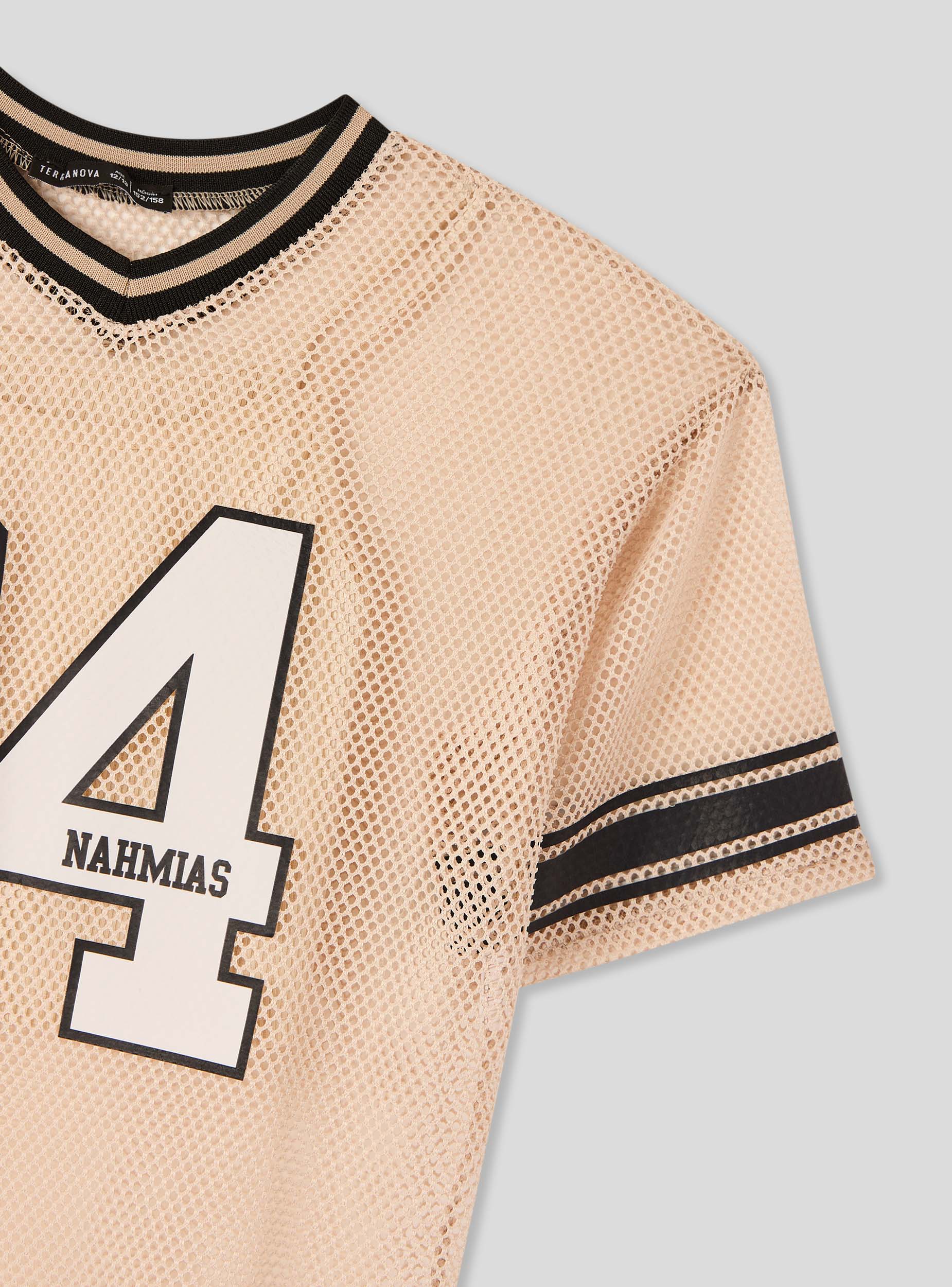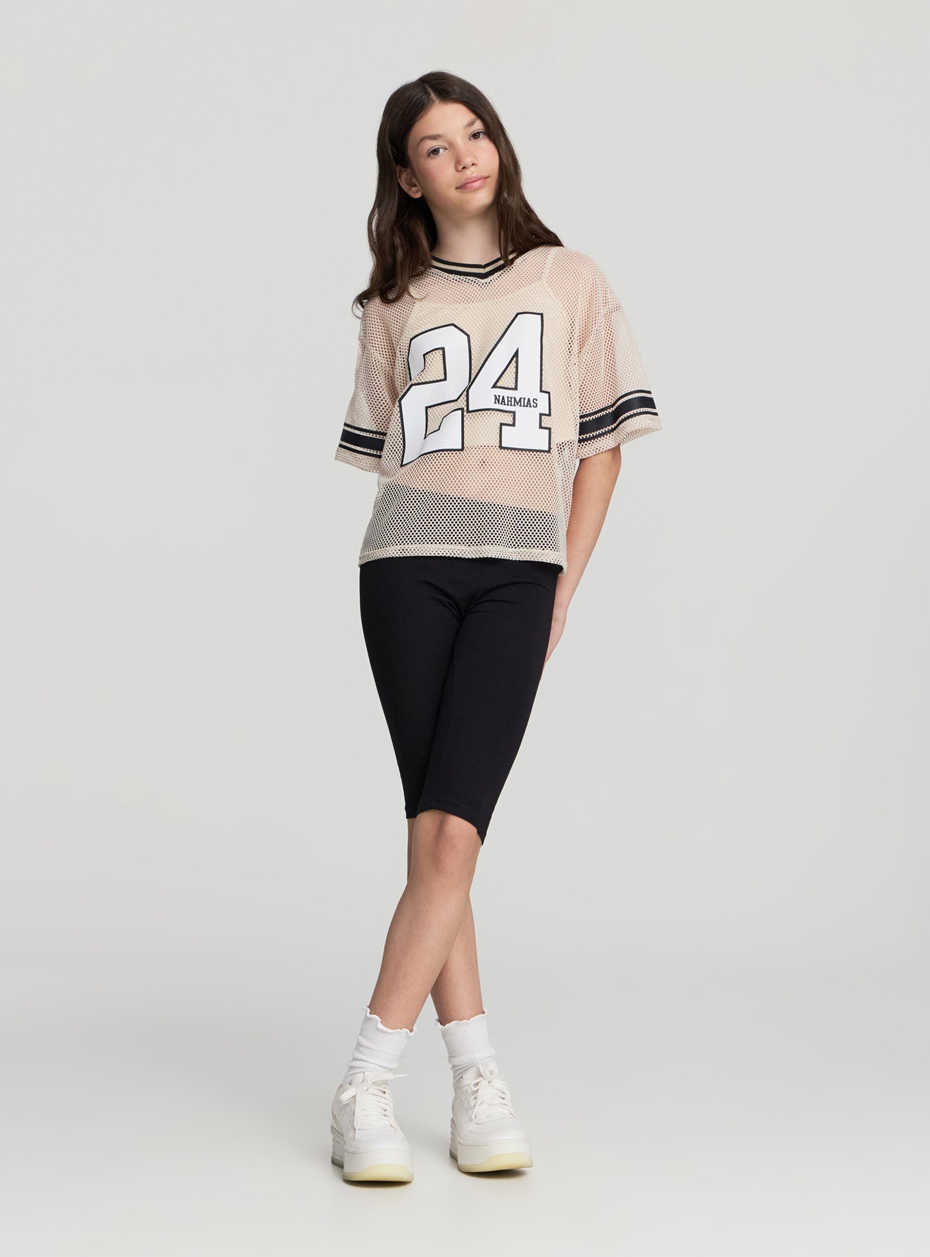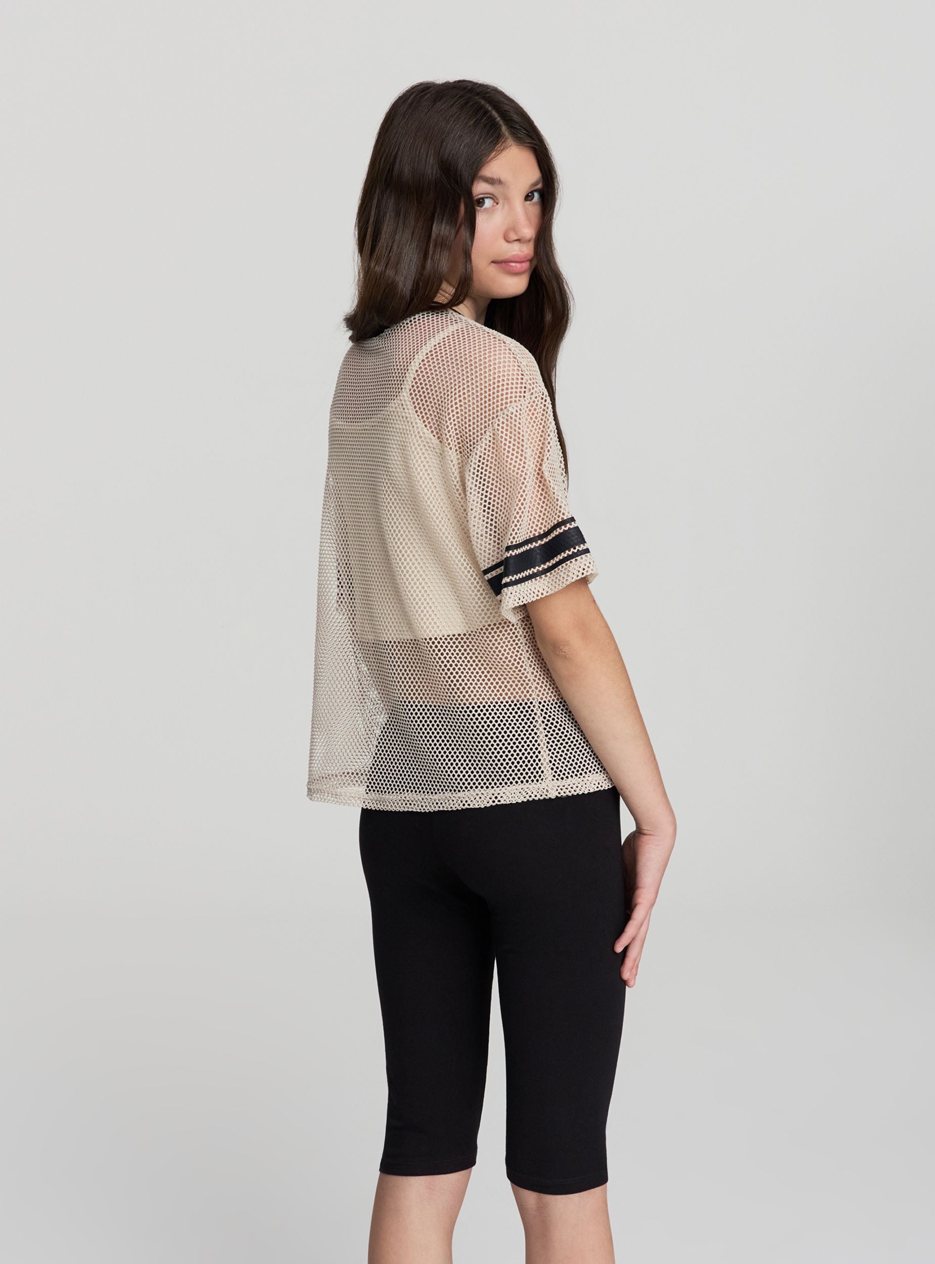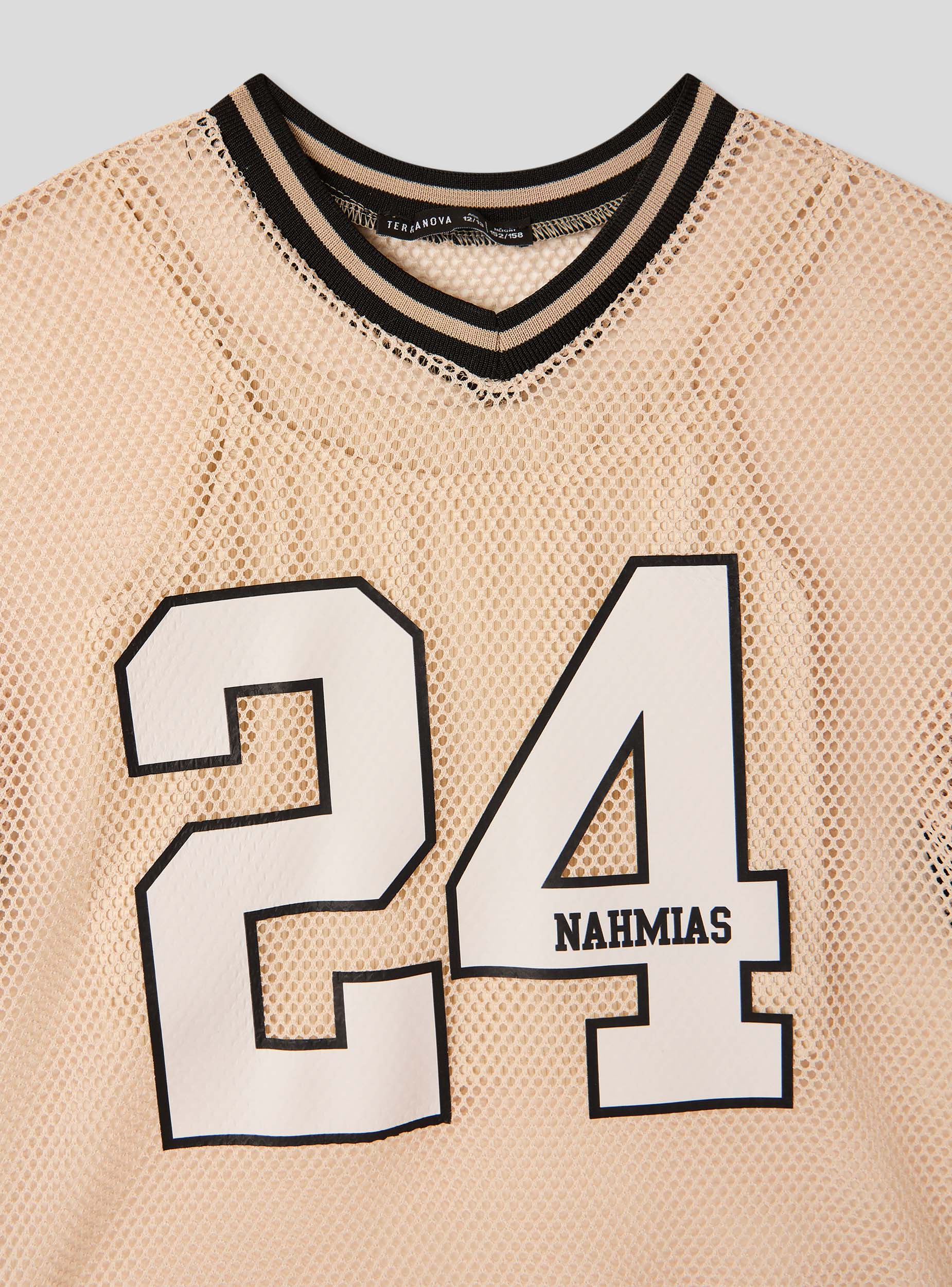 Majica za djevojčice sportskog stila, izrađena od mreže, idealna za dinamične aktivnosti i slobodno vrijeme. Mrežasti dizajn dodaje modernu notu, dok ispis s brojem i natpisom sprijeda podsjeća na košarkaške dresove. V-izrez i kratki rukavi s detaljima na prugice upotpunjuju izgled, savršena za kombiniranje s trapericama ili kratkim hlačama za ležeran i odvažan outfit.Detalji