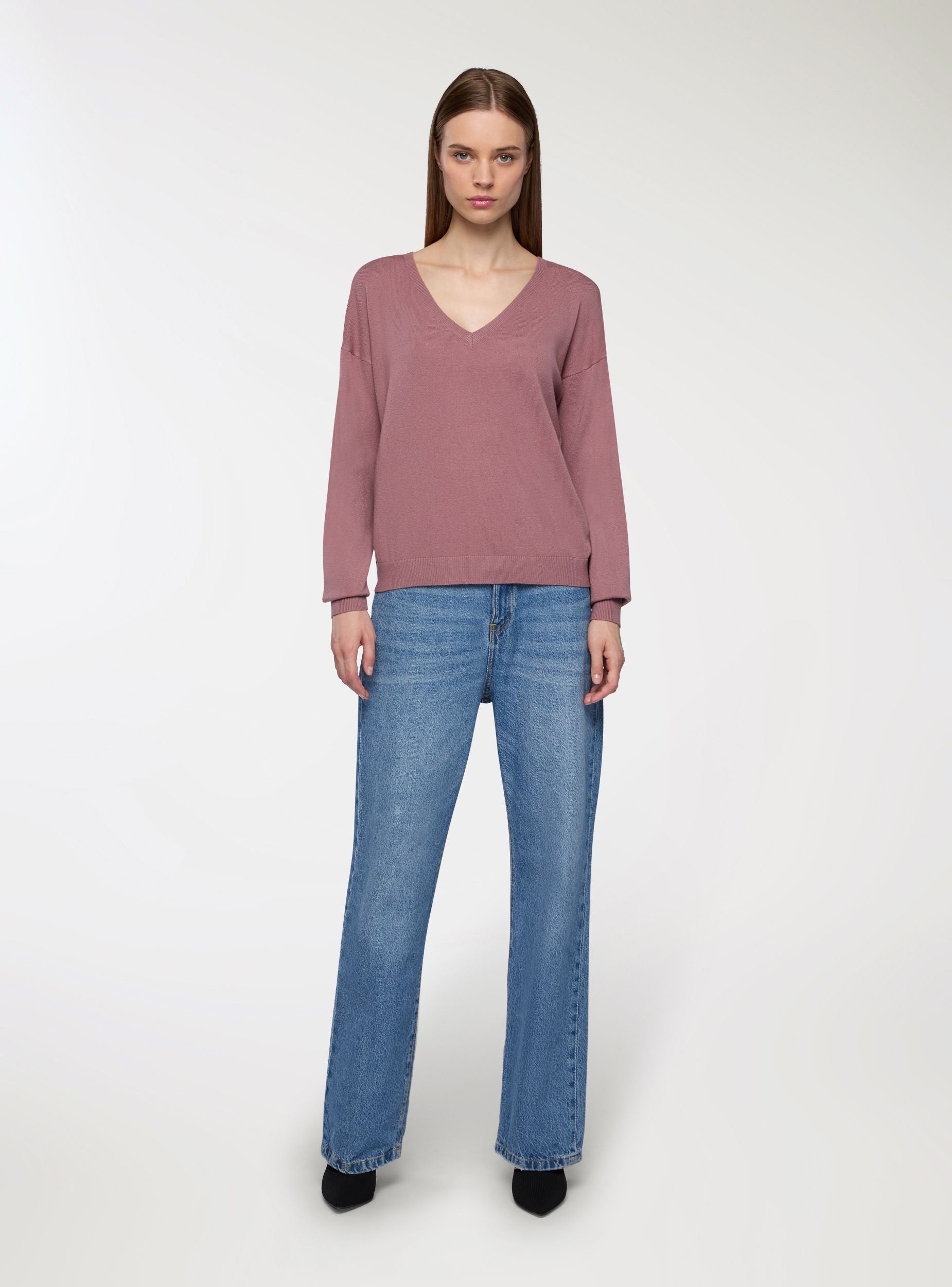 Ženska majica s V-izrezom i dugim rukavima, idealna za ležeran i svestran izgled. Savršena za kombiniranje s trapericama ili elegantnim hlačama, ova majica nudi udobno pristajanje i jednostavan, ali profinjen dizajn. Mekani kroj i jednobojni dizajn čine je prikladnom za različite prilike, od posla do slobodnog vremena. Osnovni komad u garderobi svake žene.
