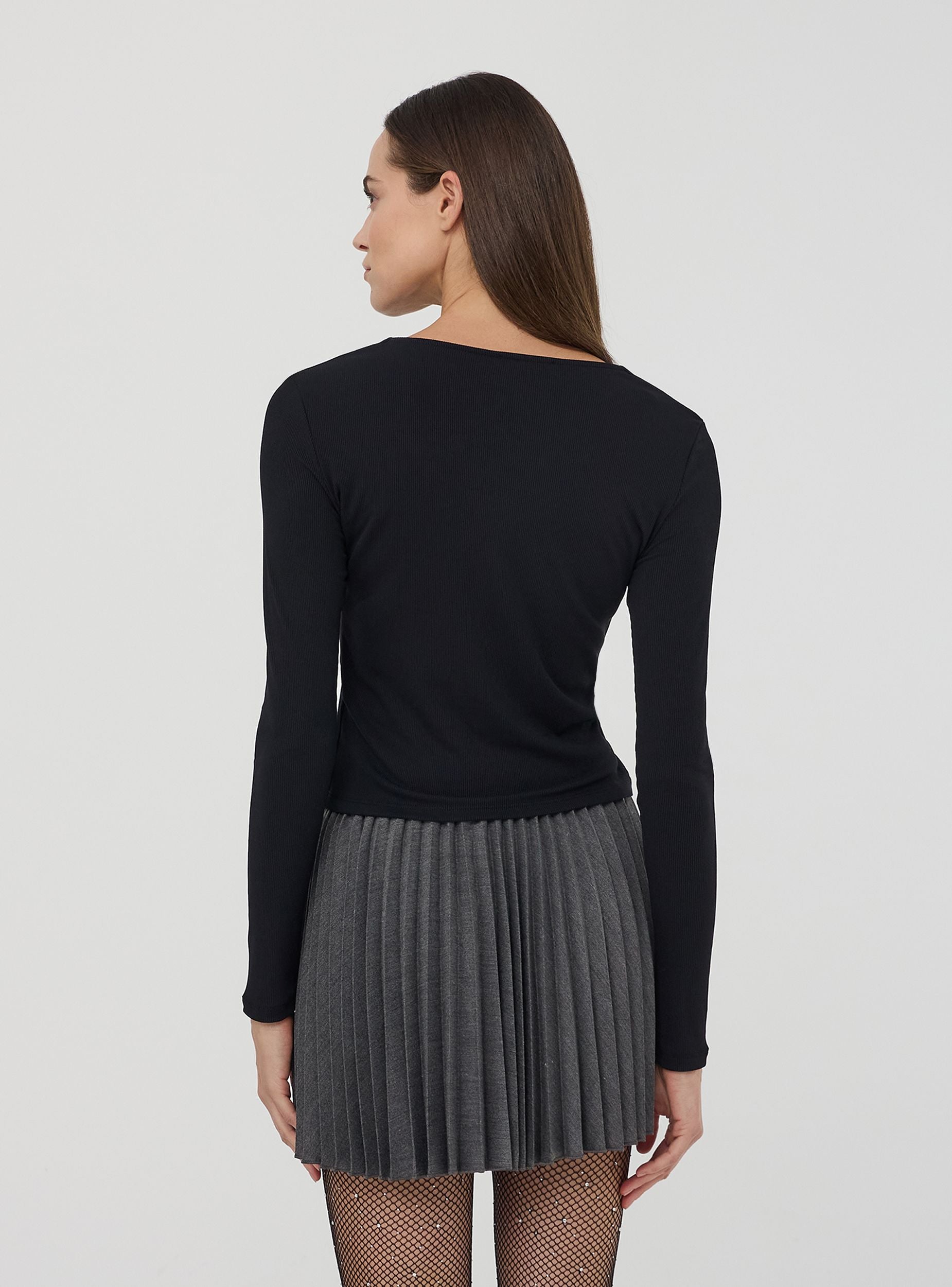 Ženska majica s širokim izrezom, savršena za dodavanje sofisticiranog dodira tvojoj garderobi. Ukrašena delikatnim šljokicama koje osvjetljavaju dizajn, ova majica je idealna za elegantne i ženstvene outfite. Dugi rukavi osiguravaju udobnost i svestranost, čineći je pogodnom za hladnije dane ili posebne večeri. Svestran komad koji spaja stil i praktičnost s blistavim dodirom.
