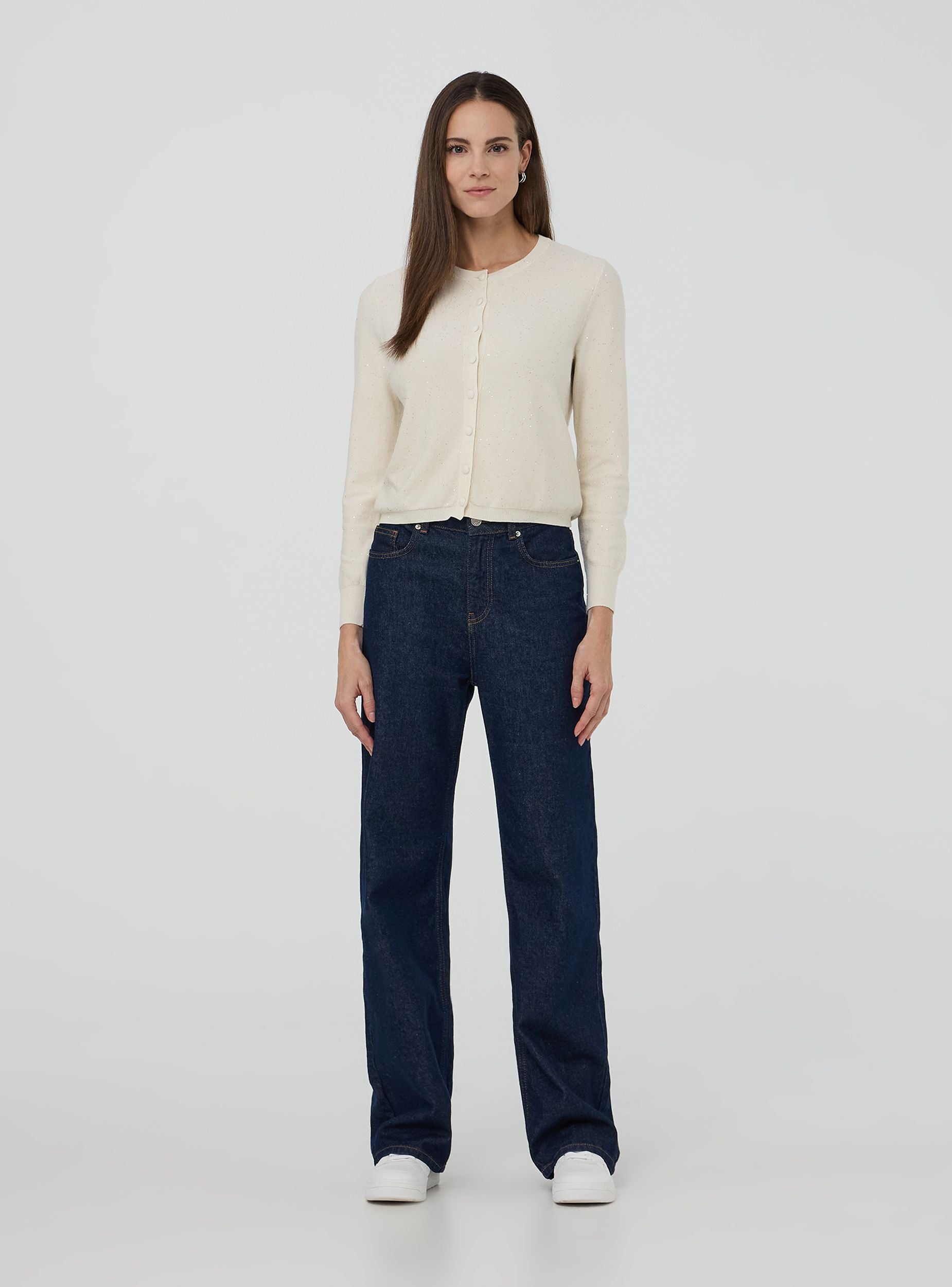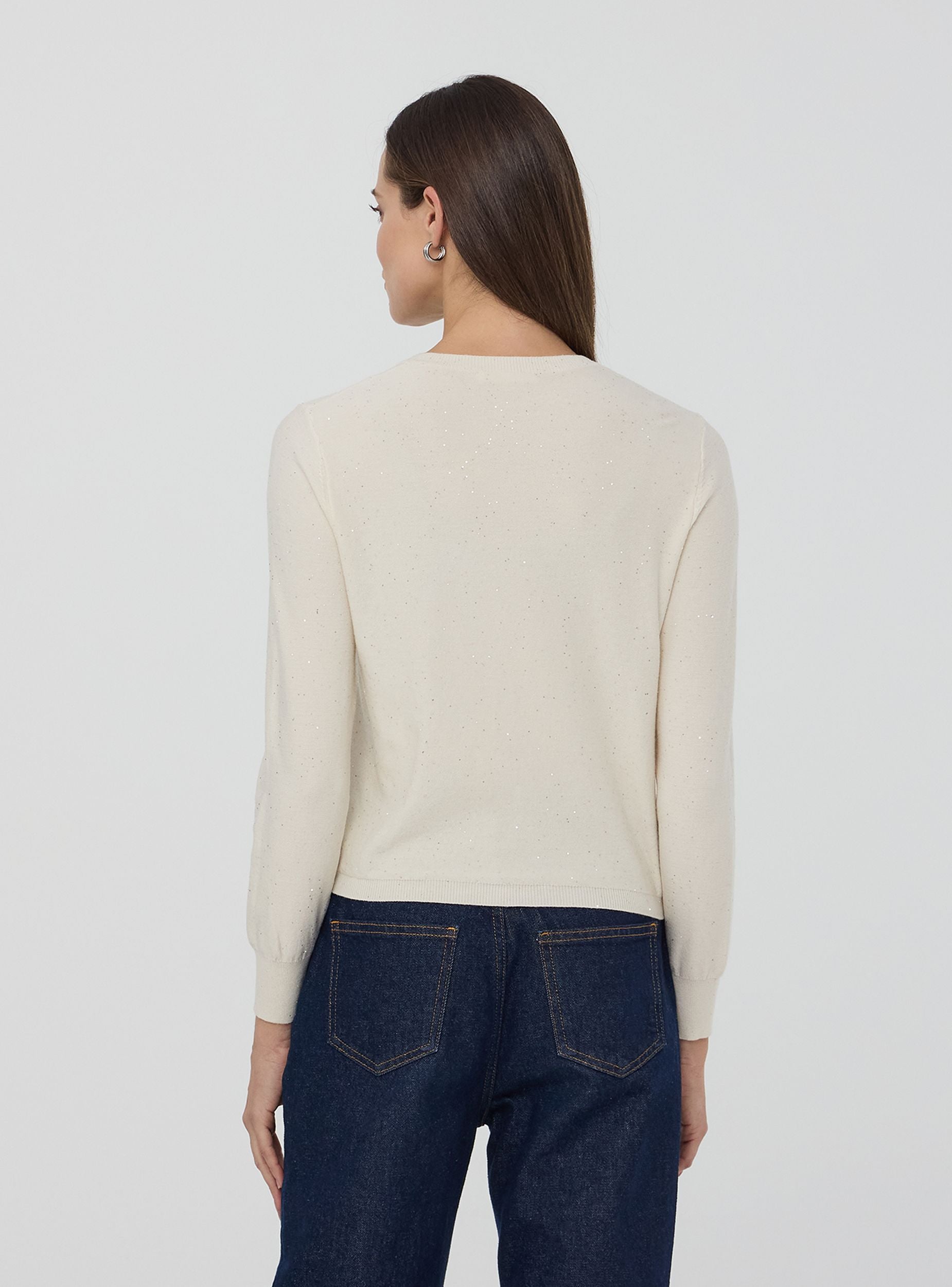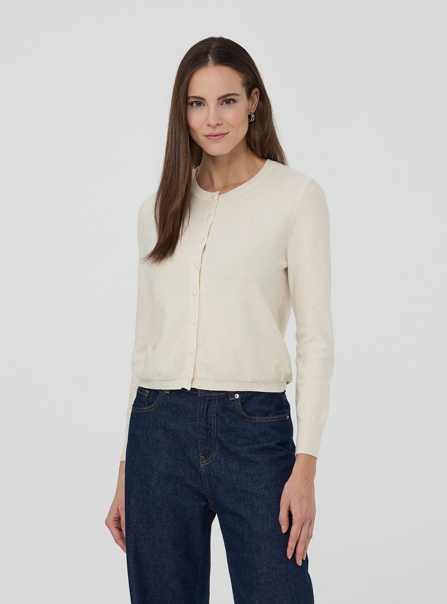 Ženski kardigan sofisticiranog dizajna ukrašen delikatnim šljokicama koje daju dašak svjetlosti. Ima jednobojnu siluetu, savršenu za elegantno upotpunjavanje različitih izgleda. Dugi rukavi i okrugli izrez dodaju dašak svestranosti, dok prednje kopčanje na dugmad osigurava udobno i praktično nošenje. Idealni komad za dodavanje sjaja garderobi, bez odricanja od suzdržanosti i stila, savršeno za nošenje kako tijekom dana, tako i navečer.