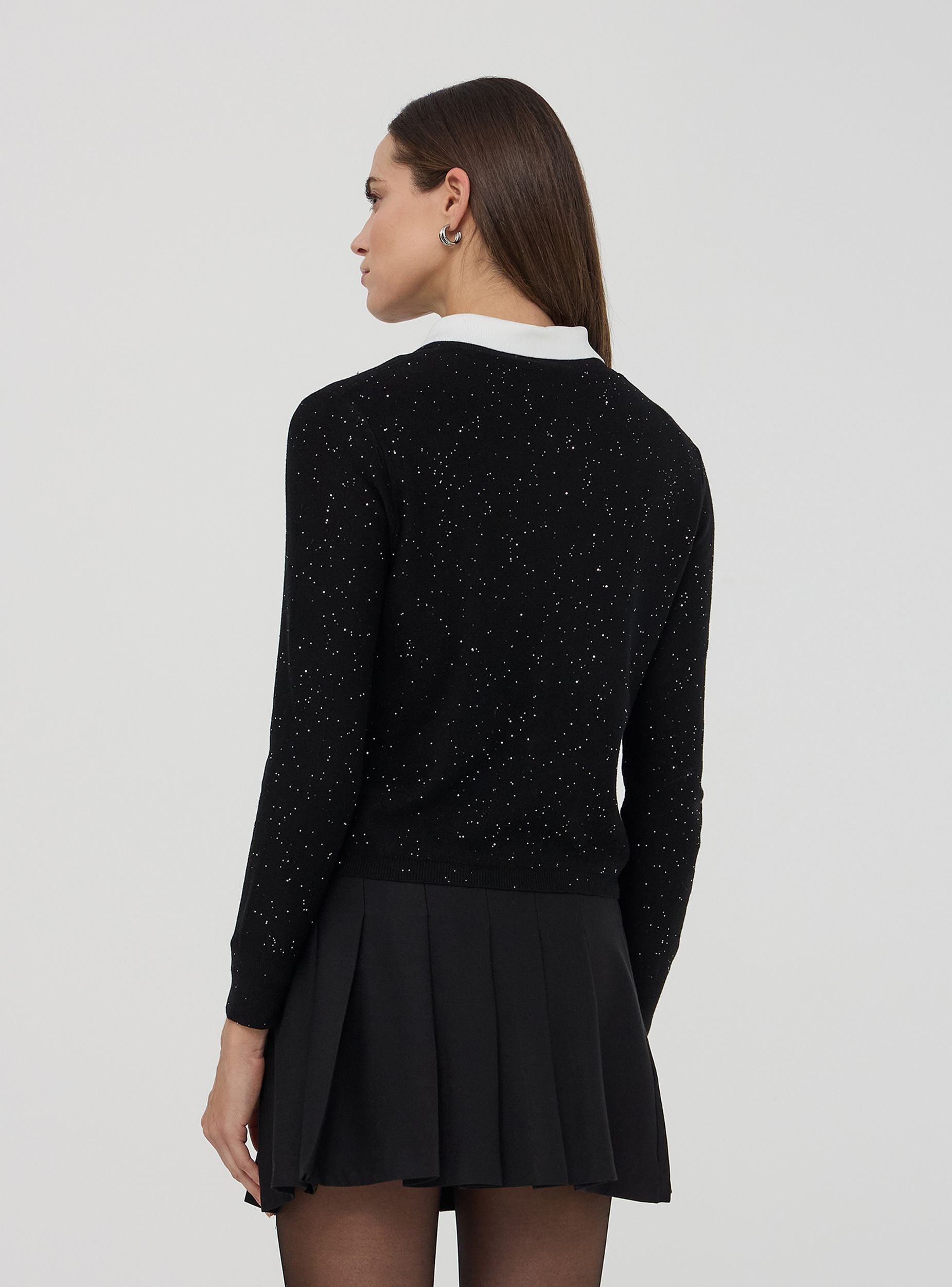 Ženski kardigan rafiniranog dizajna ukrašen delikatnim šljokicama koje daju dašak svjetlosti. Ima jednobojnu siluetu, savršenu za dovršavanje različitih izgleda s elegancijom. Dugi rukavi i okrugli izrez dodaju dašak svestranosti, dok kopčanje gumbima sprijeda osigurava udobno i praktično nošenje. Idealni komad za dodavanje sjaja garderobi, bez odricanja od suzdržanosti i stila, savršeno za nošenje i tijekom dana i navečer.