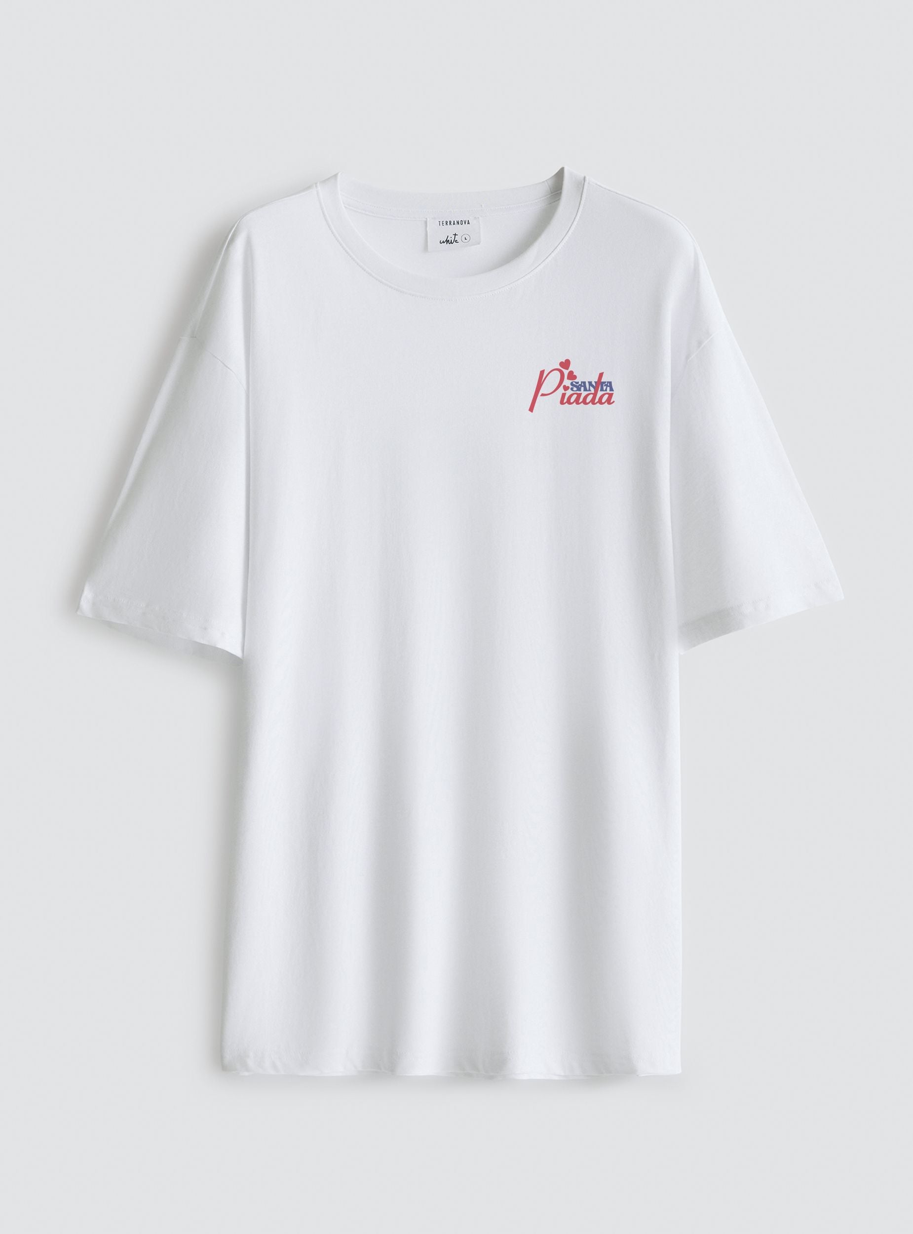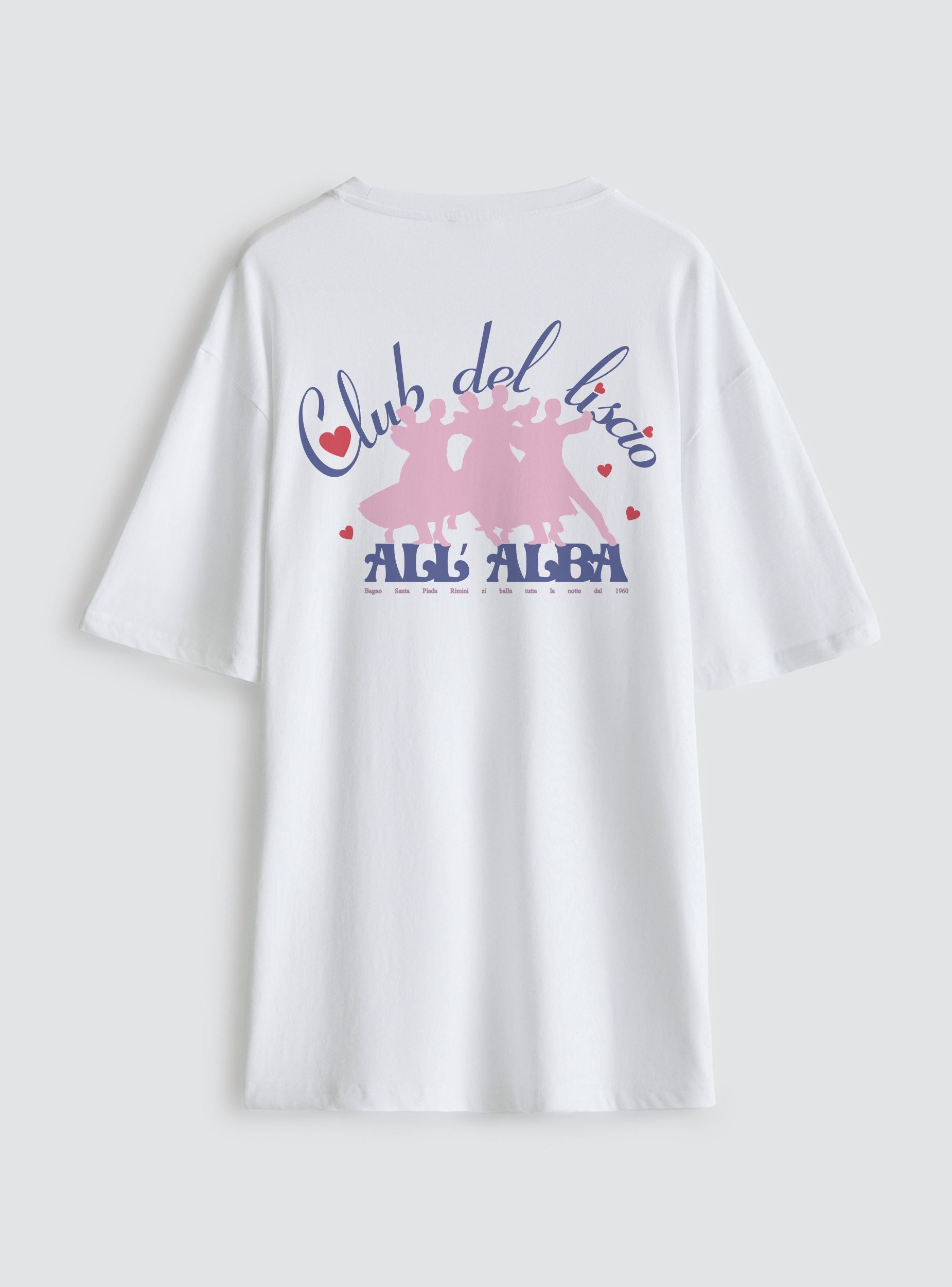 Muška over t-shirt kratkih rukava s okruglim izrezom i dvostrukim printom: mala prednja “Santa Piada” i grafika na leđima s natpisom “Club del liscio all’alba” i siluetom plesača. Savršena za ironične i opuštene lookove, za nošenje u ljetnim kontekstima.Detalji