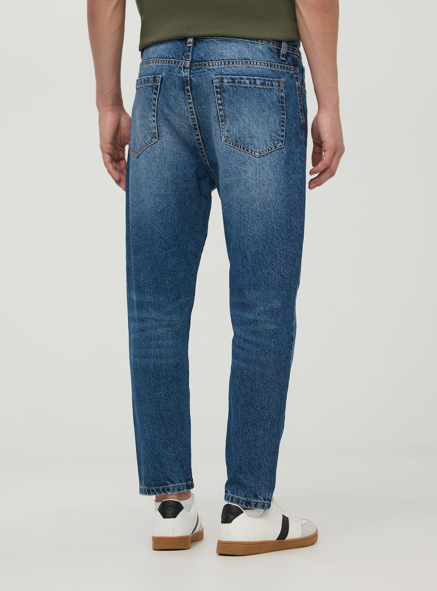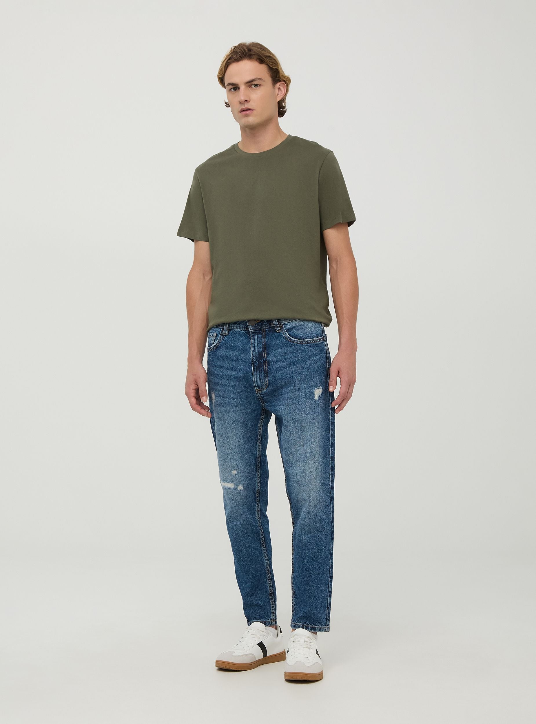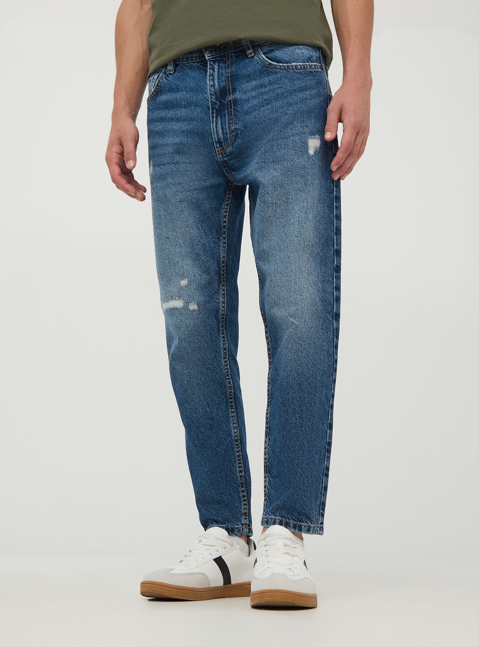 Tamni muški traperice s relaxed krojem, savršeni za ležeran i moderni izgled. Dizajn uključuje male strateški postavljene poderotine, koje daju dojam istrošenosti i trendi izgleda. Model s pet džepova, s petljama na struku i zatvaranjem na dugme i patentni zatvarač. Regularni struk osigurava udobnost i dobar kroj, dok relaxed silueta omogućava slobodu kretanja bez žrtvovanja stila. Idealni za svakodnevni ležeran izgled, ove traperice lako se kombiniraju s majicama i tenisicama za opušten, ali pažljivo osmišljen outfit.