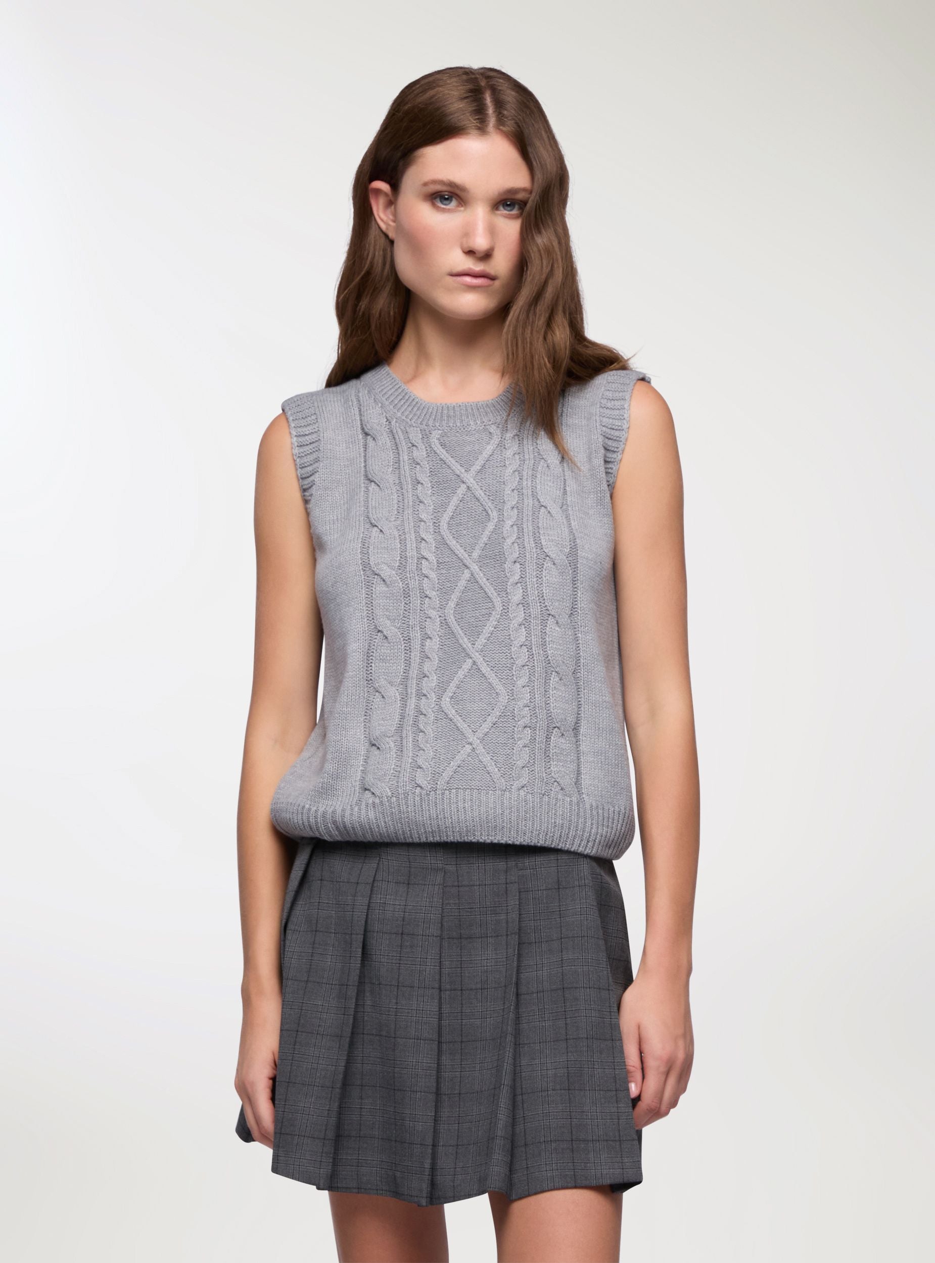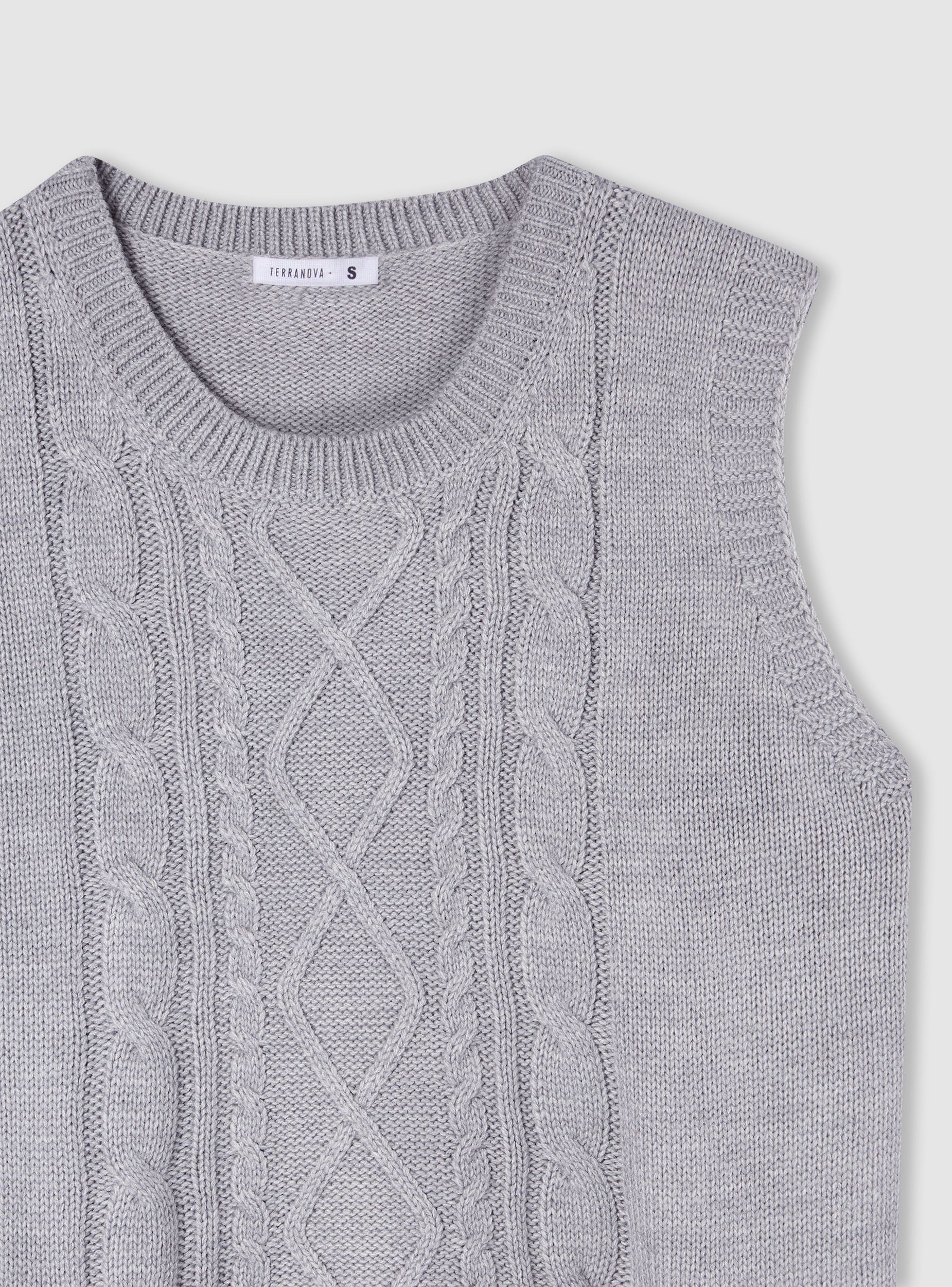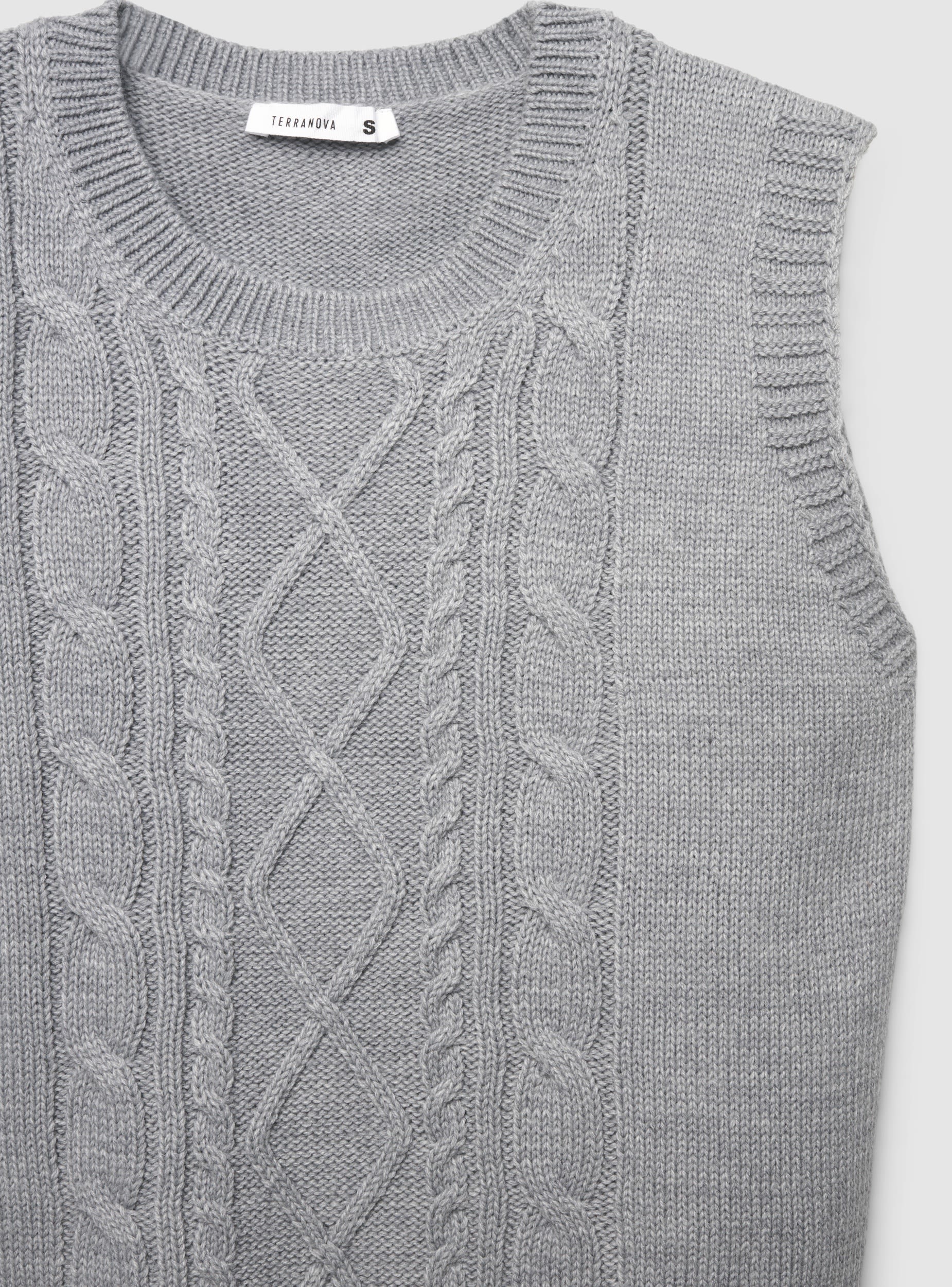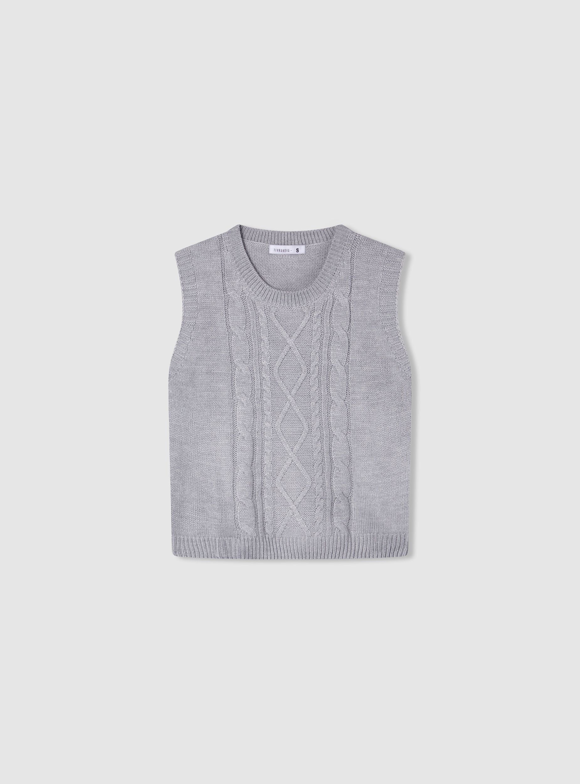 Ženski pleteni prsluk u jednobojnoj boji, karakteriziran rafiniranim uzorkom pletenica sprijeda. Savršen za nošenje preko košulja ili dolčevita, dodaje toplinu i stil odjevnim kombinacijama sezone. Okrugli izrez i rub s rebrastim uzorkom upotpunjuju dizajn, čineći ga svestranom odjećom idealnom za stvaranje modernih slojeva.Detalji