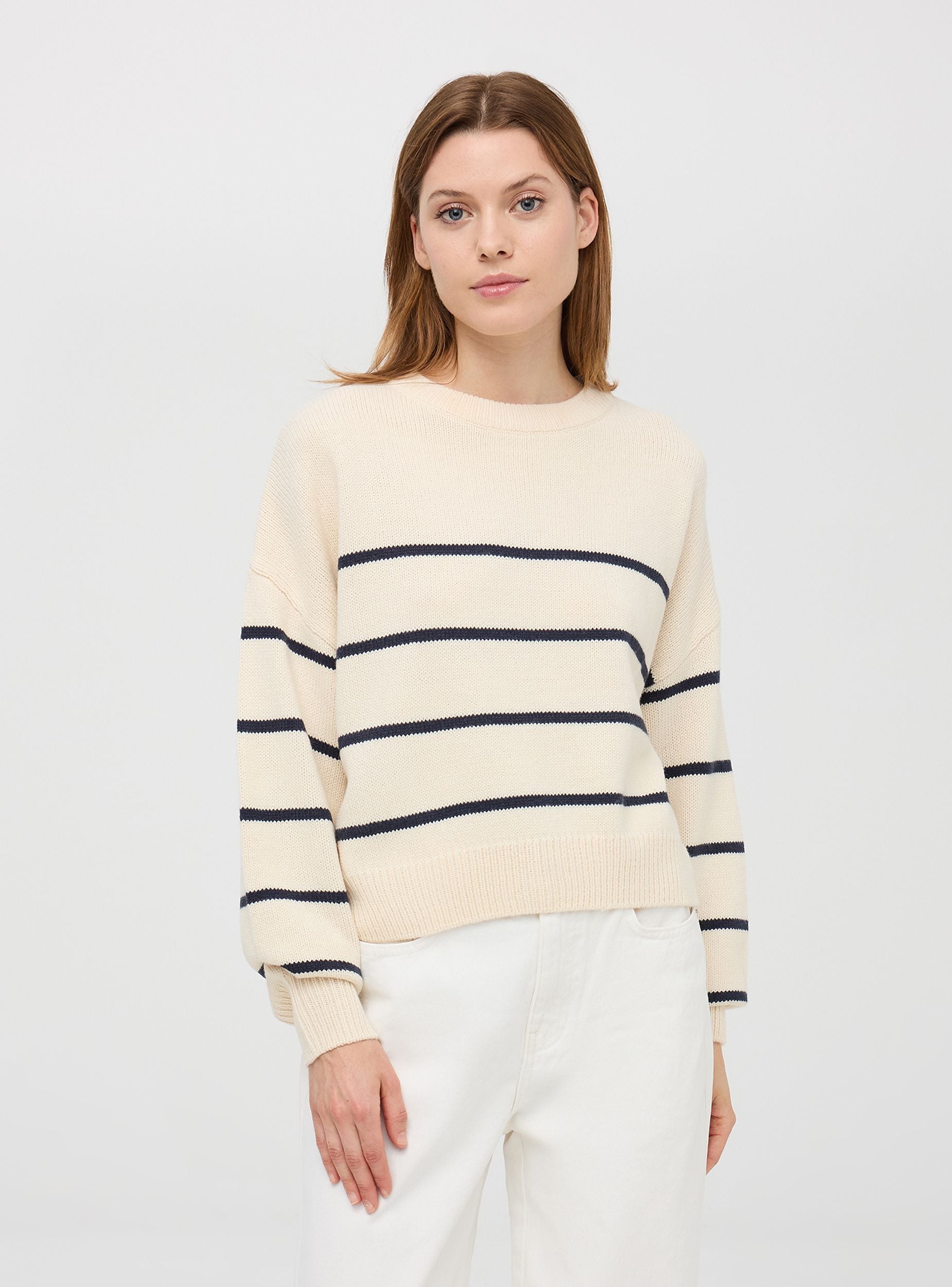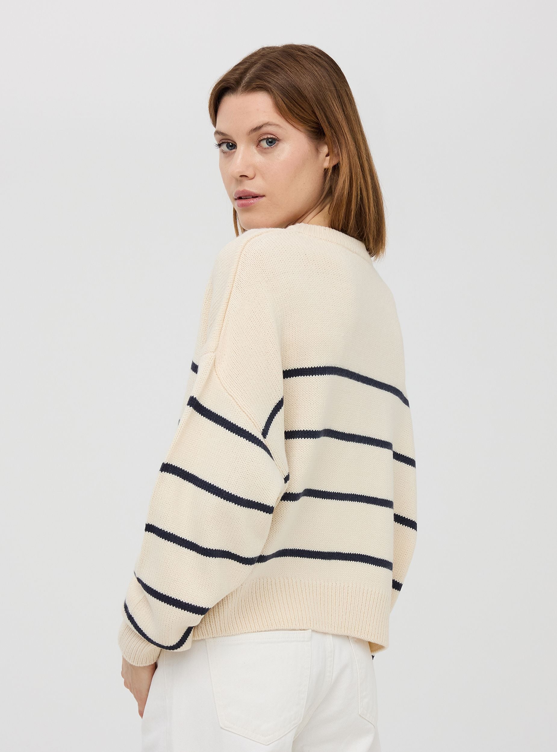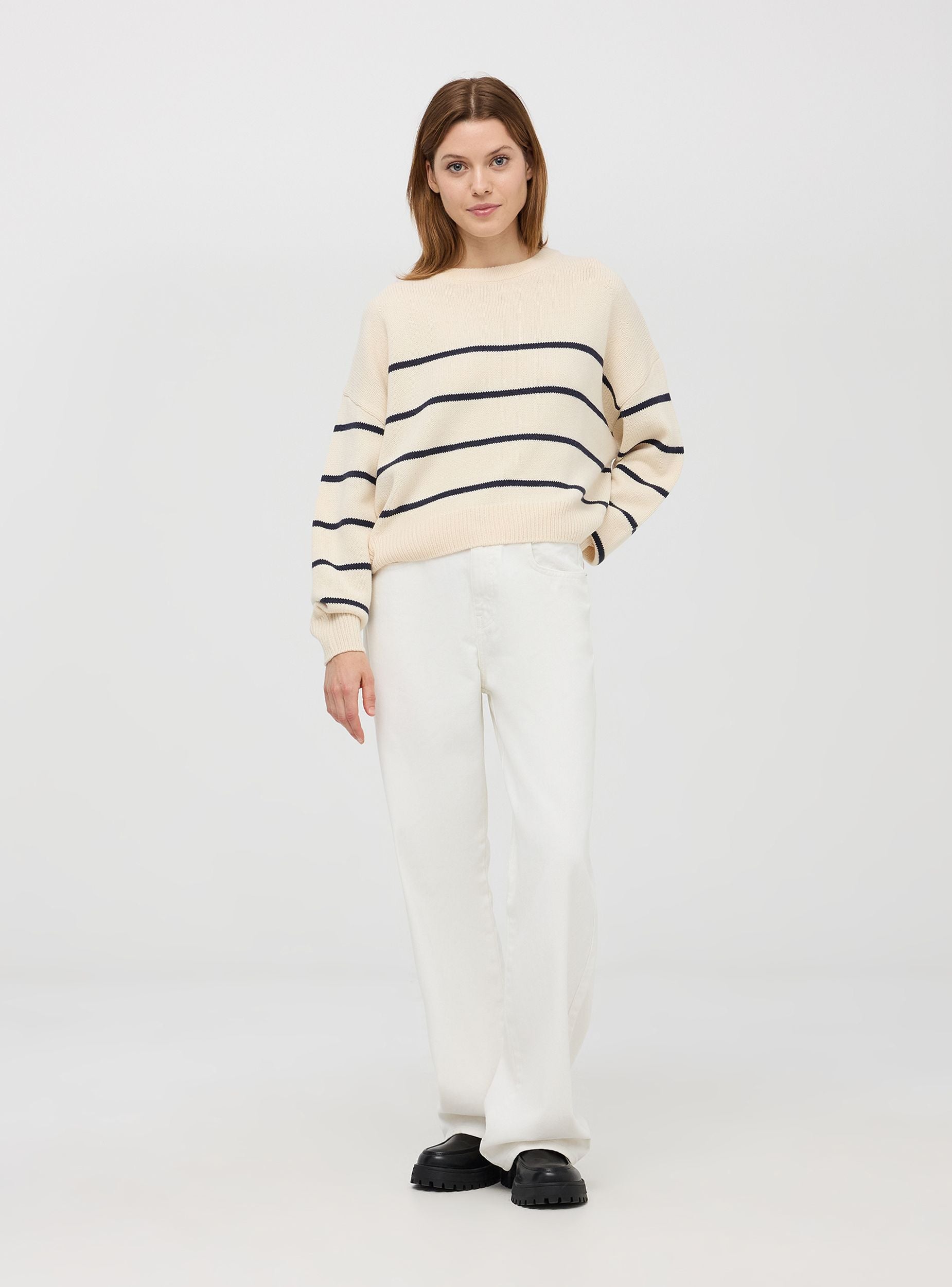 Ženska široka prugasta kratka majica s okruglim izrezom i dugim rukavima. Široka kroja i kratki rez daju ležeran i opušten izgled, idealan za kombiniranje s trapericama ili hlačama visokog struka za udoban i moderan outfit.Detalji