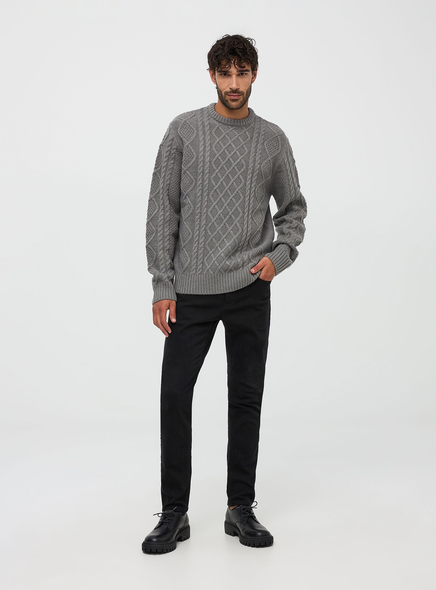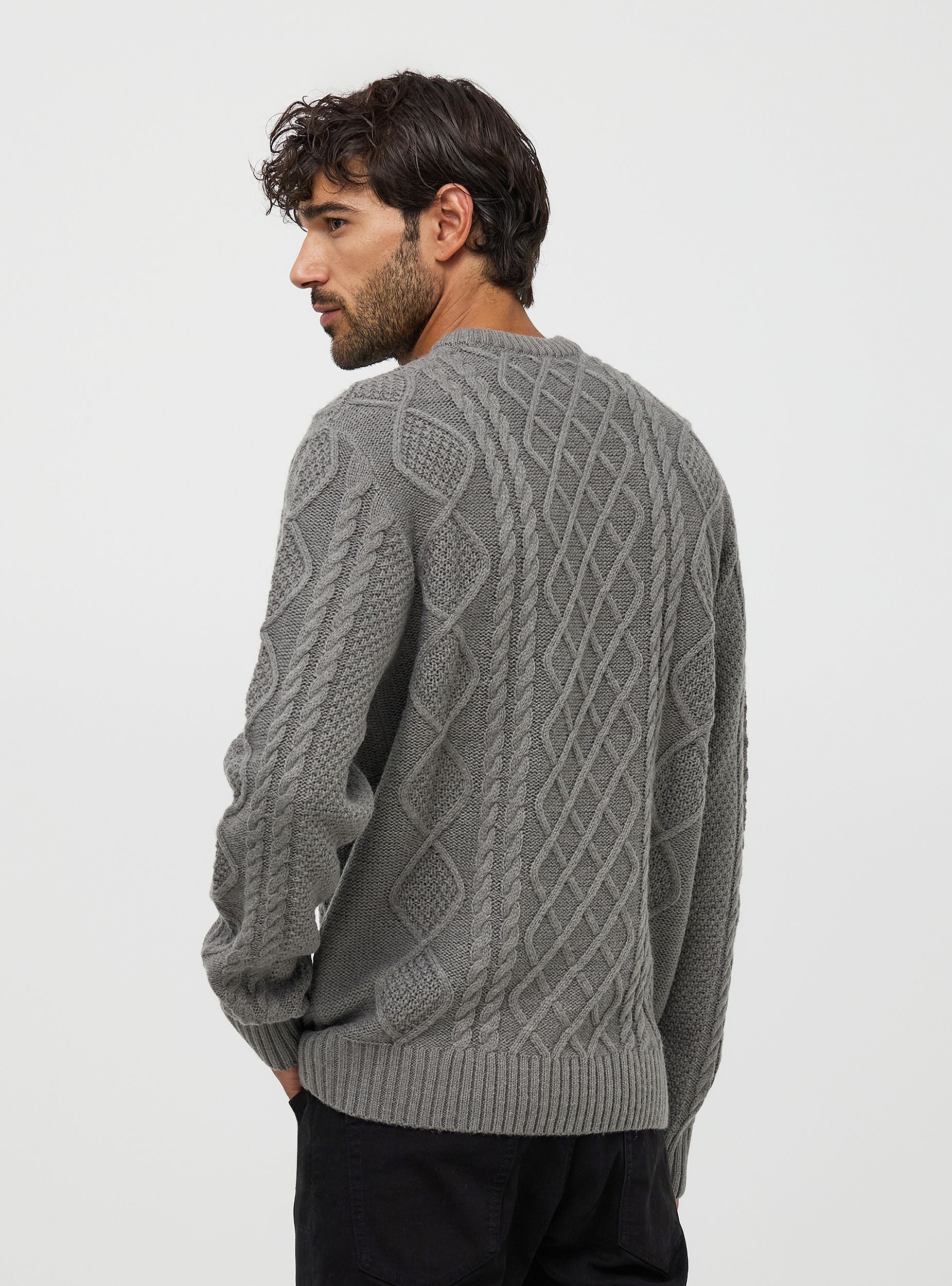 Muška majica s pletenim dizajnom, karakterizirana pletenim uzorkom po cijeloj površini, kako sprijeda tako i straga. Majica ima regularnu kroj i ima rebraste rubove na ovratniku, manžetama i donjem dijelu, što joj daje elegantan i tradicionalan izgled. Odjevni predmet je prikladan za nošenje tijekom zimske sezone, pružajući toplinu i stil.
