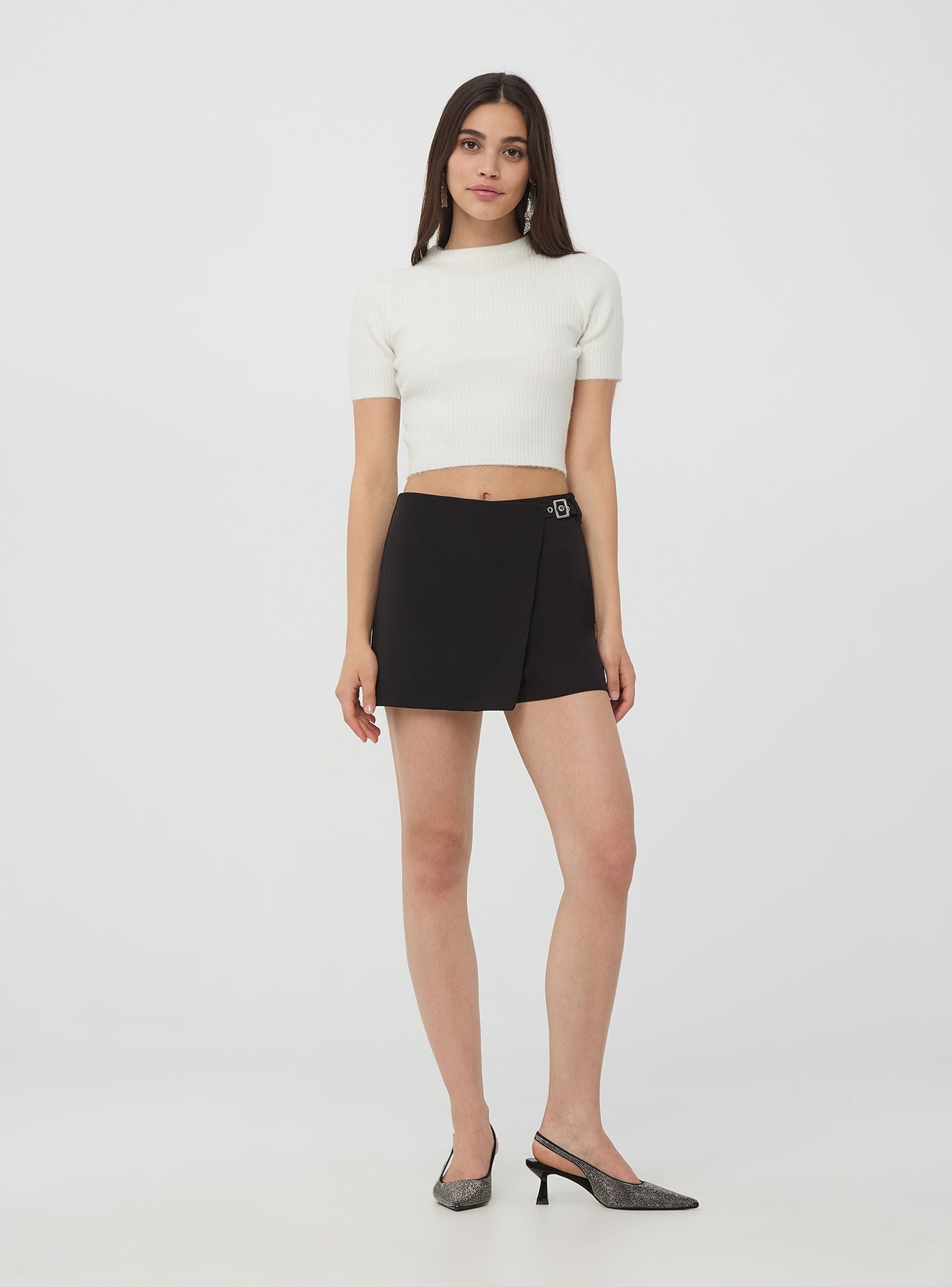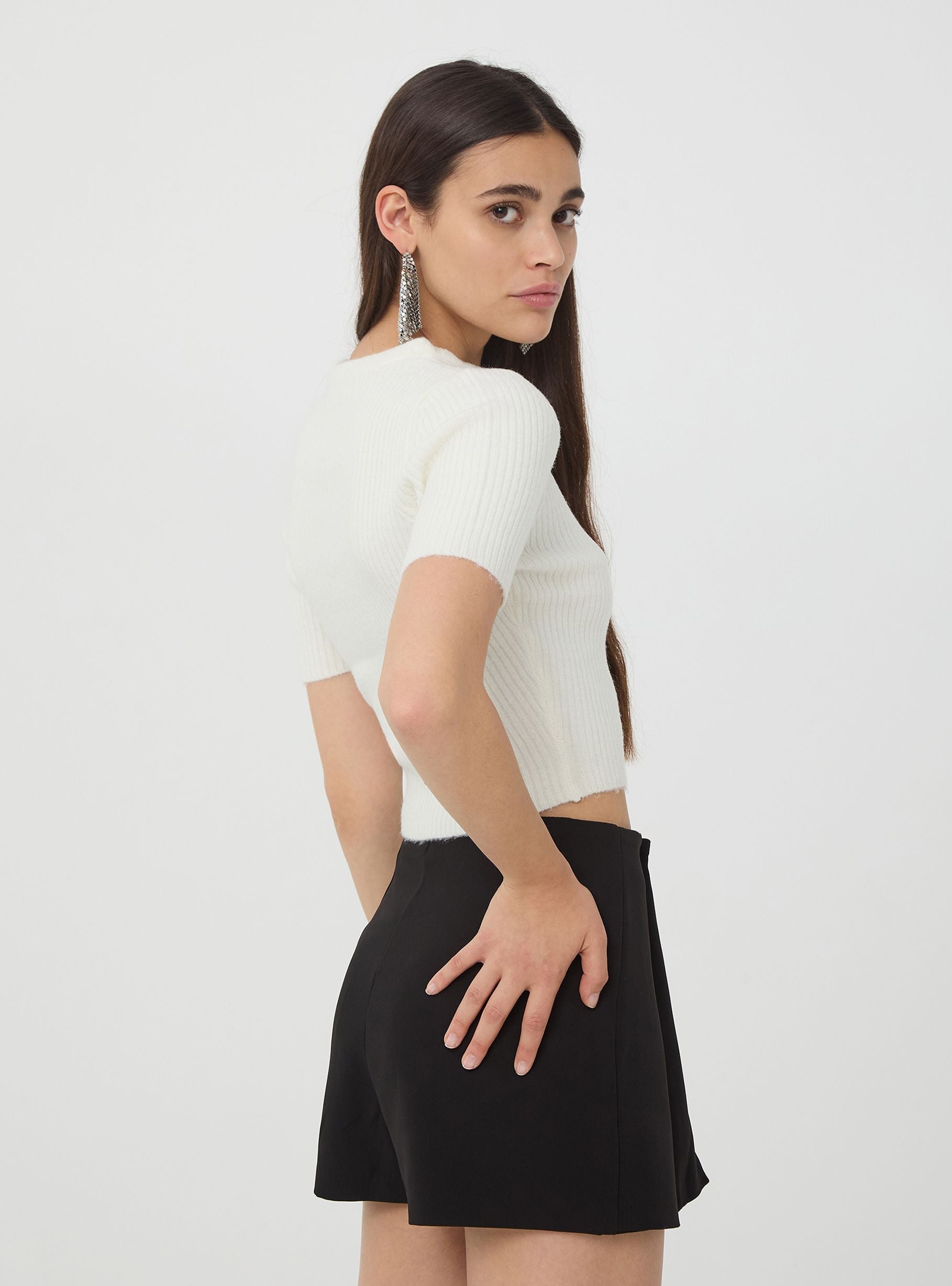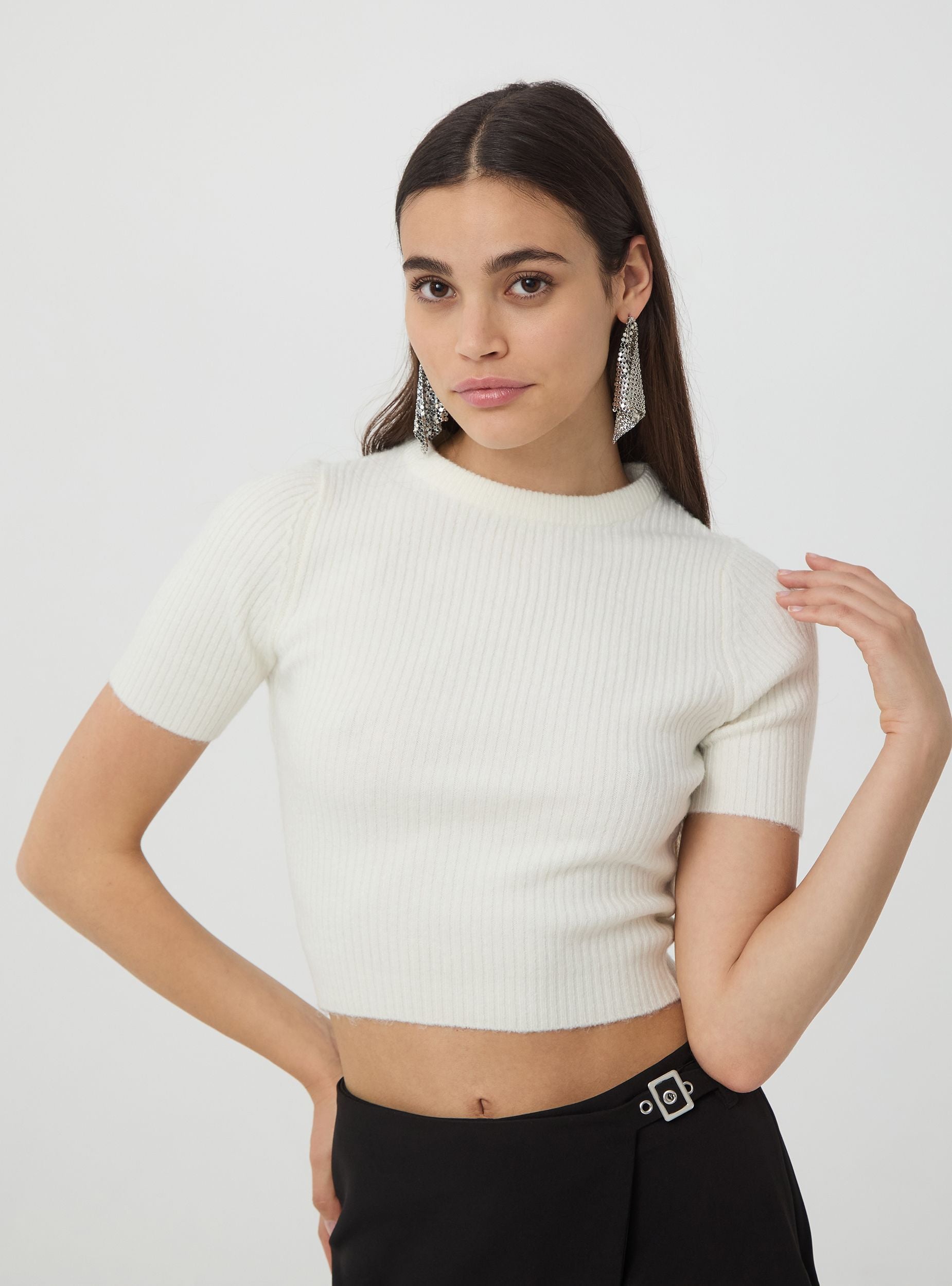 Ženska majica s kratkim rukavima od jednobojnog materijala s rebrastim uzorkom, savršena za dodavanje daška elegancije i udobnosti tvojoj garderobi. Ova majica pruža osjećaj mekoće na koži, čineći je idealnom za svaku priliku. Dizajn s kratkim rukavima čini je svestranom i savršenom za nošenje kako u ležernim tako i u formalnim prilikama. Udobna i uska silueta savršeno se prilagođava ženskoj figuri.Detalji