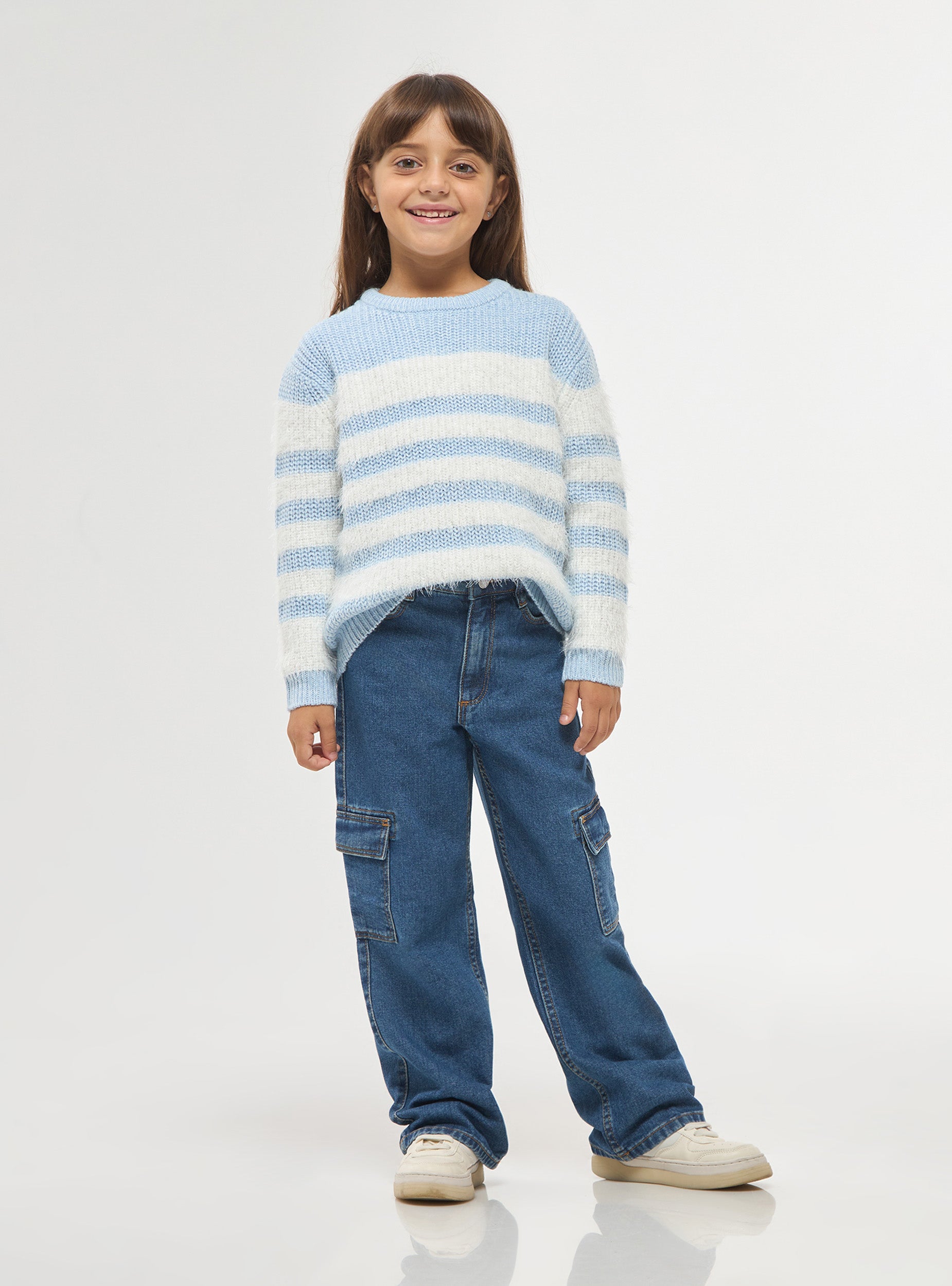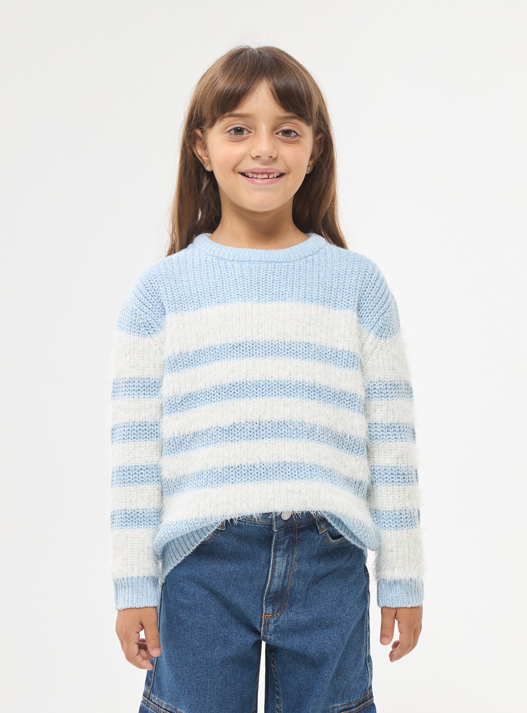 Maglia da bambina modello girocollo. Tessuto lavorato a maglia con fantasia a righe. Vestibilità è  regular.