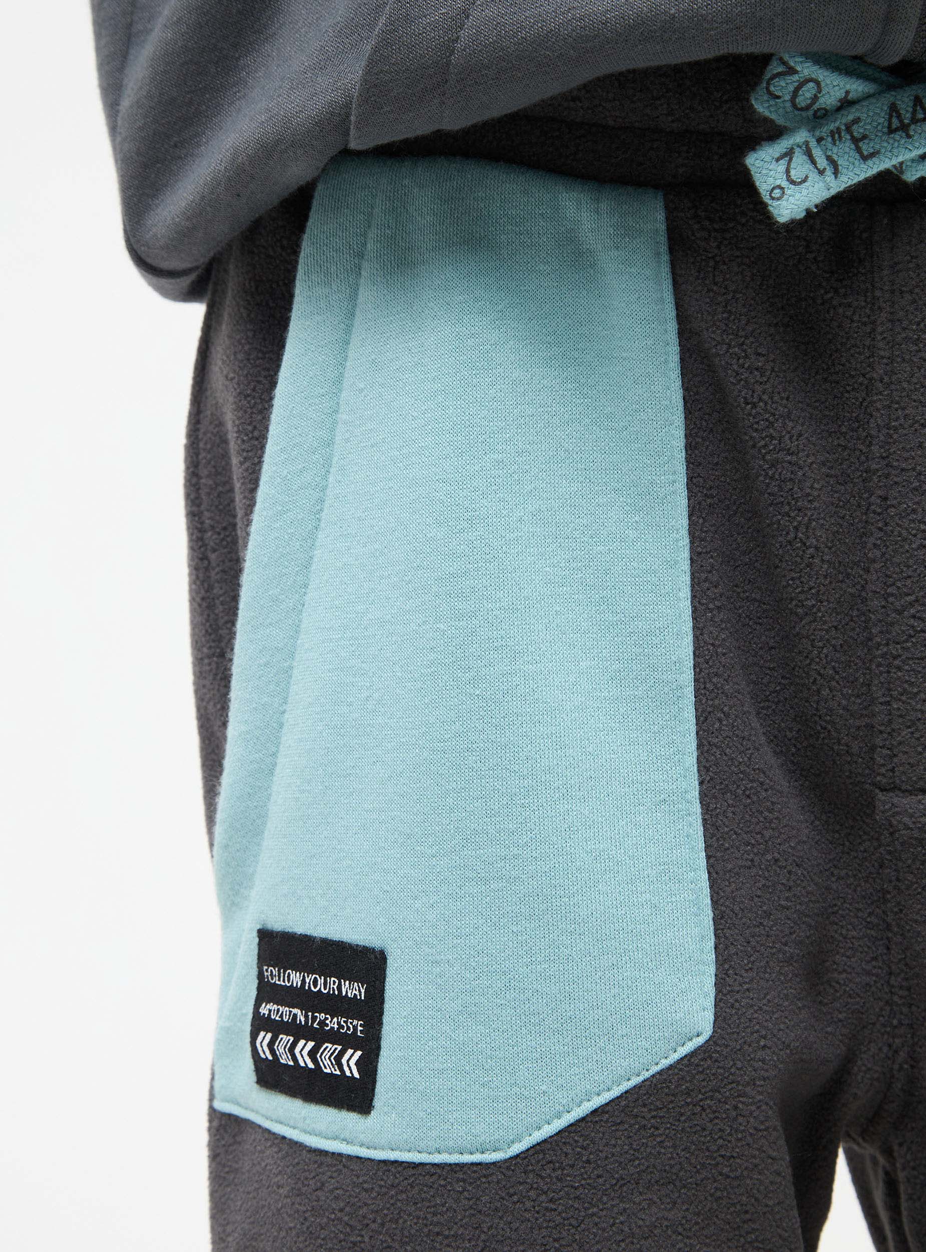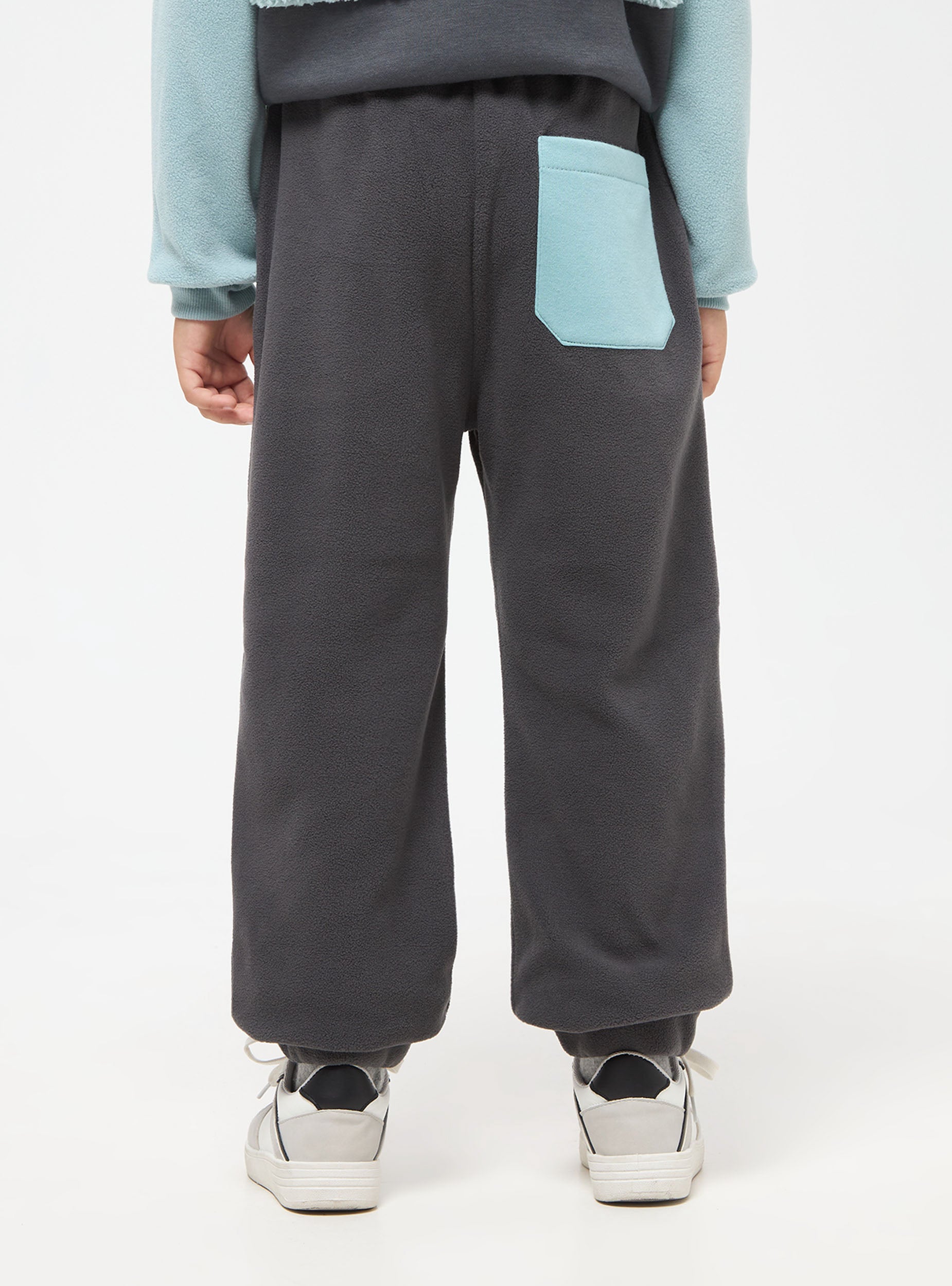 Pantaloni tuta lungo da bambino. Elastico e coulisse in vita, fondo con polsino. Tinta unita con inserti in pile.