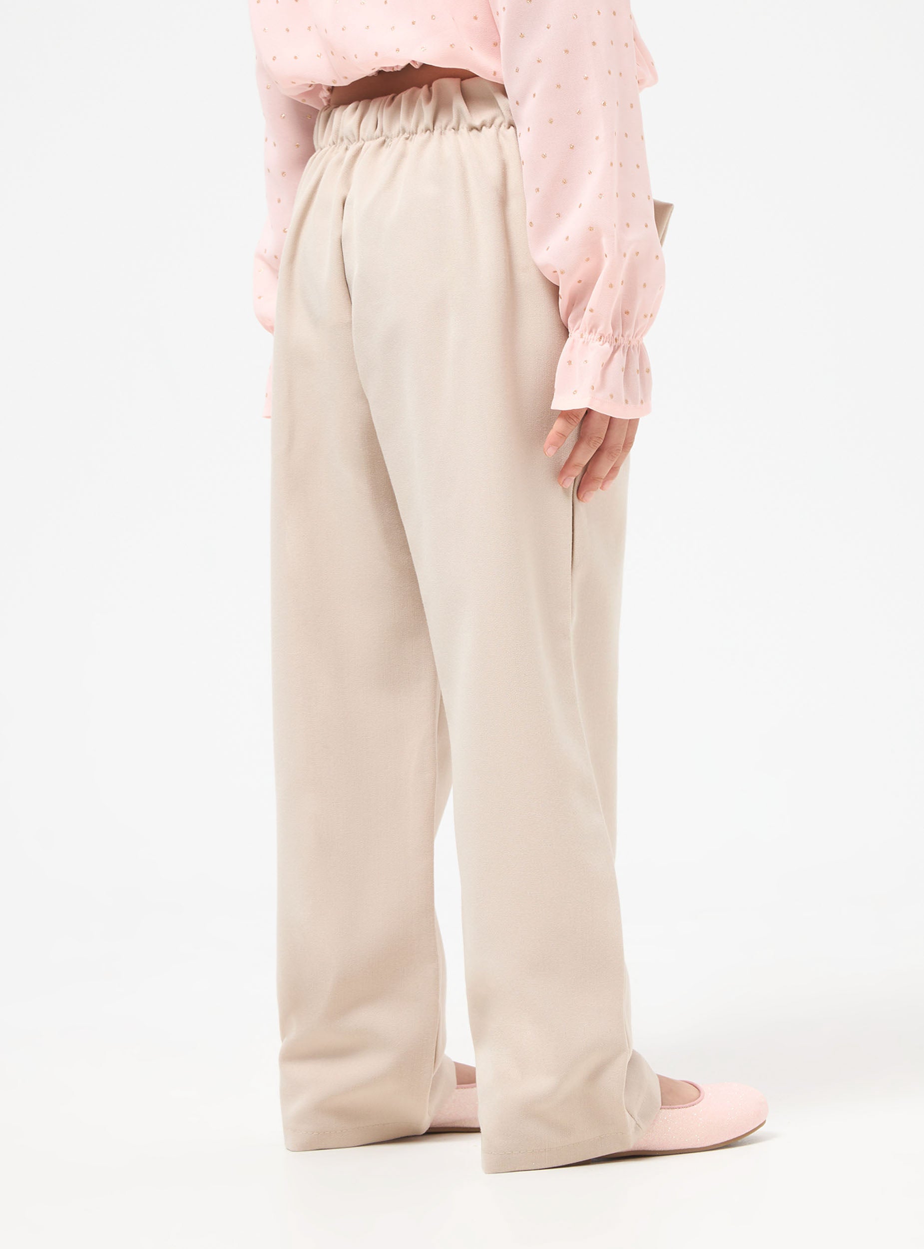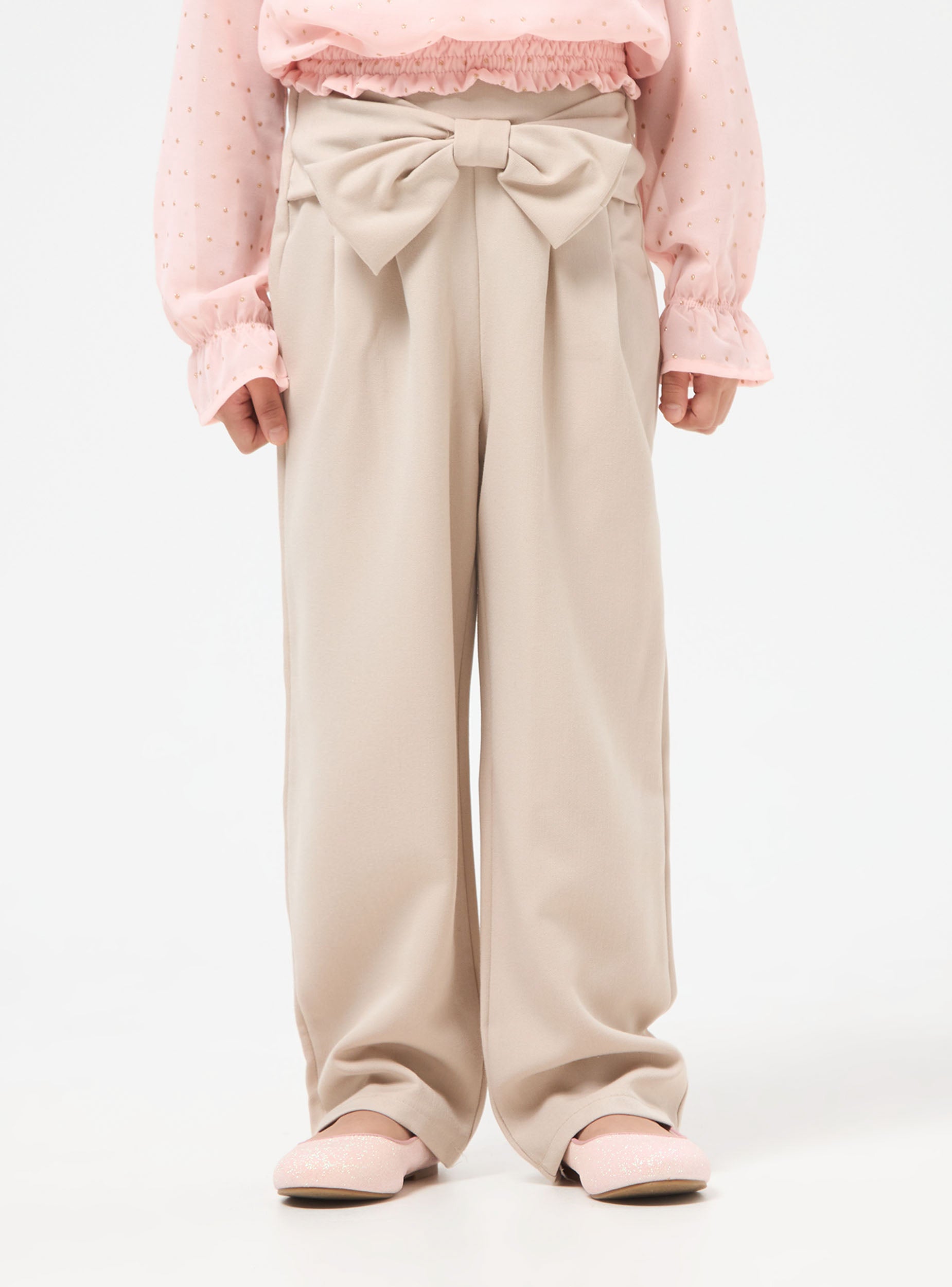Pantaloni da bambina con gamba ampia e fiocco in vita. Completa il look con la giacca abbinata. La modella è alta 1,20 e indossa la taglia 6-7 anni.