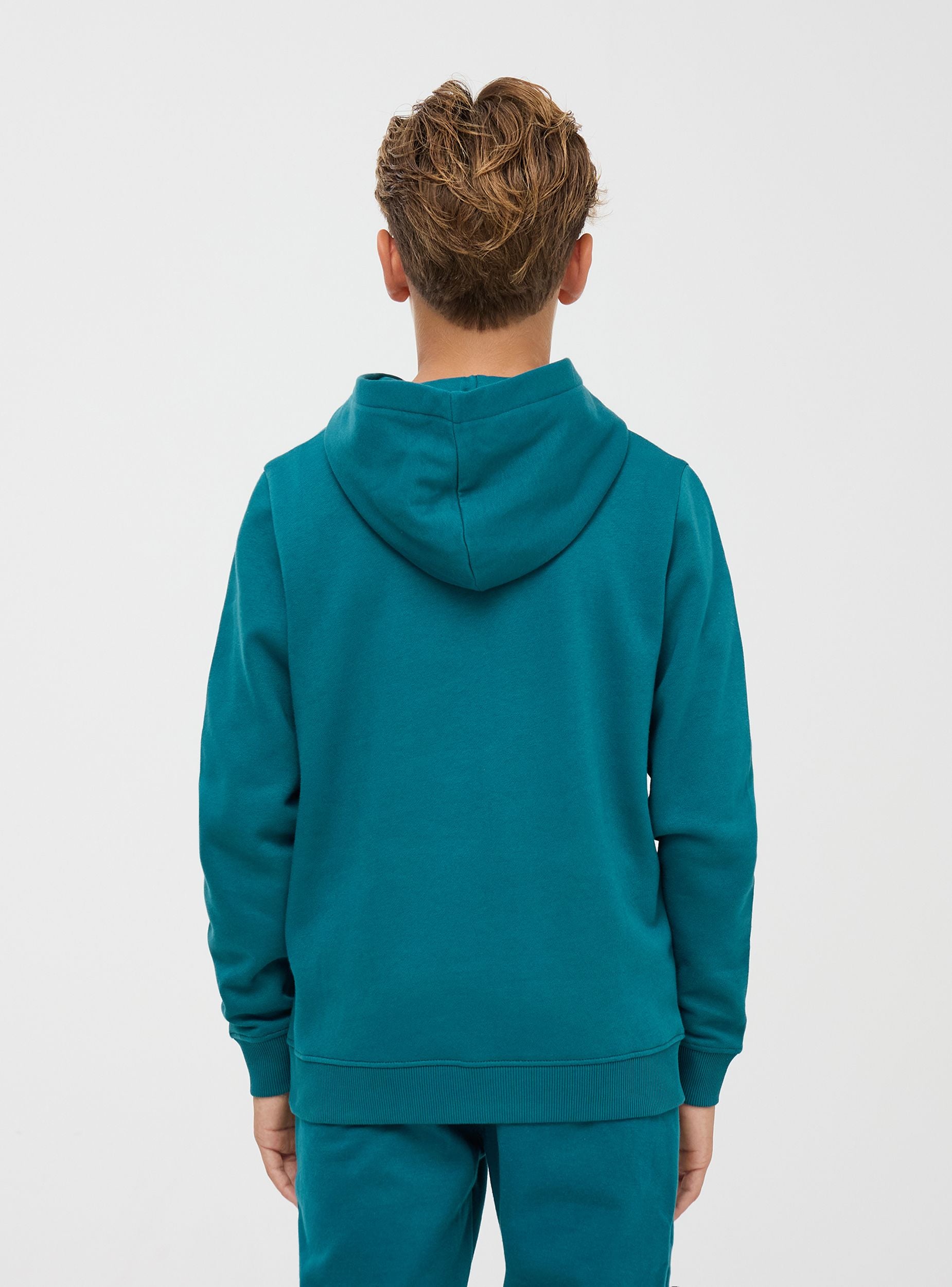 Dječja majica od teškog materijala, idealna za hladnu sezonu. Ima kapuljaču za dodatnu zaštitu od hladnoće i udobnu prednju džepu. Manžetne i rub su elastični kako bi se osigurao uski i udoban fit. Savršena za nošenje tijekom vanjskih aktivnosti ili za ležeran i sportski izgled.