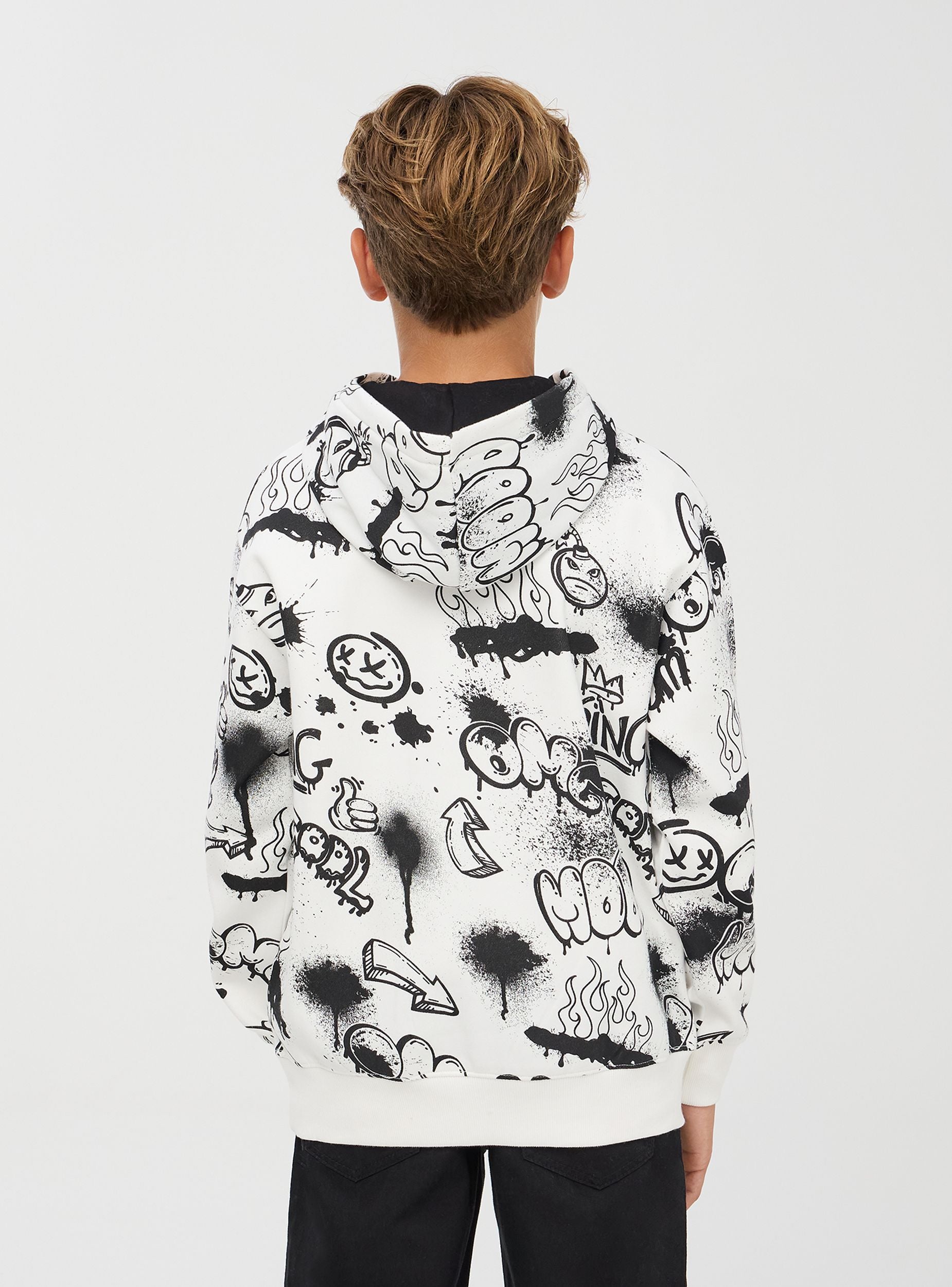 Dječja majica od teškog materijala, opremljena kapuljačom i elastičnim manžetama. Dizajn sadrži all-over grafitnu ispis za urbani i moderni izgled, idealan za hladnu sezonu. Savršena za održavanje topline tijekom hladnijih dana, uz jamstvo stila i udobnosti.