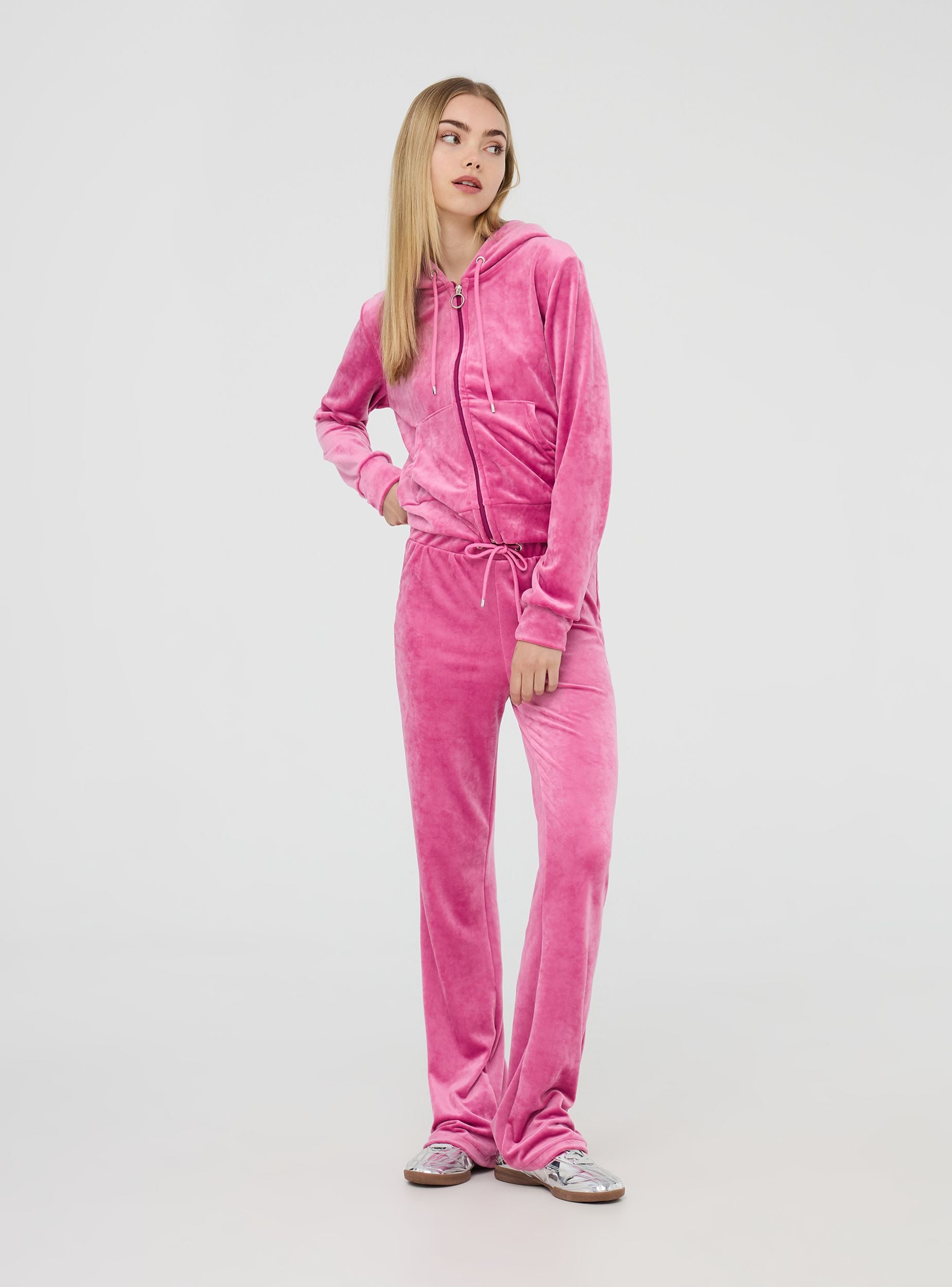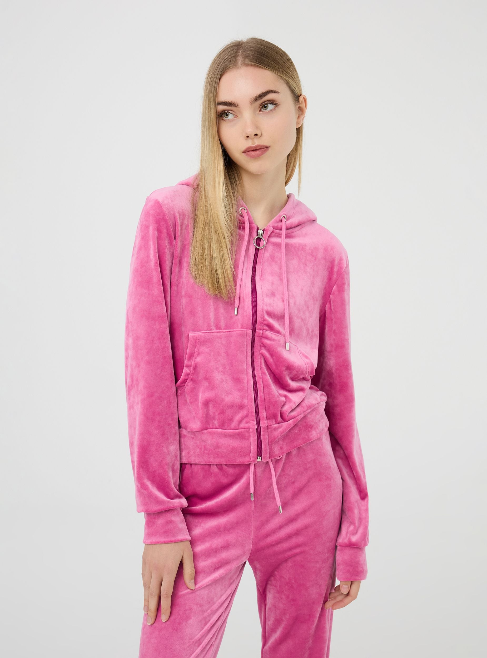 Ženska dukserica s kapuljačom izrađena od jednobojnog pliša. Model s prednjim zatvaranjem na patentni zatvarač i središnjim džepom. Savršena za sportske ili casual chic kombinacije.