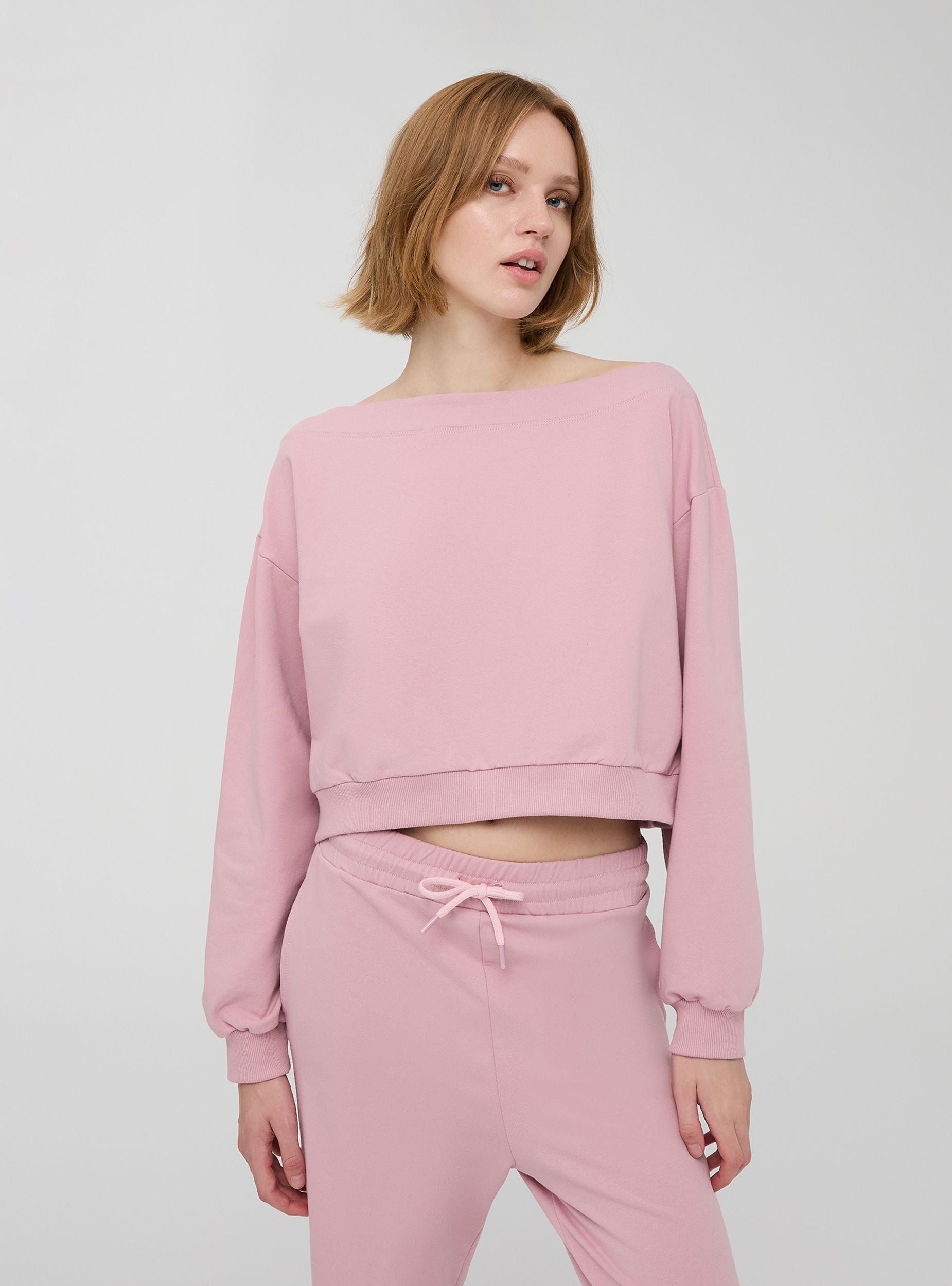 Ženska dukserica karakterizirana širokim i opuštenim krojem. Ima široki šifon izrez koji otkriva ramena, duge rukave s rebrastim manžetama i rebrasti rub, za udoban fit. Dukserica je dizajnirana za pružanje udobnosti i stila, savršena za svakodnevnu neformalnu odjeću.