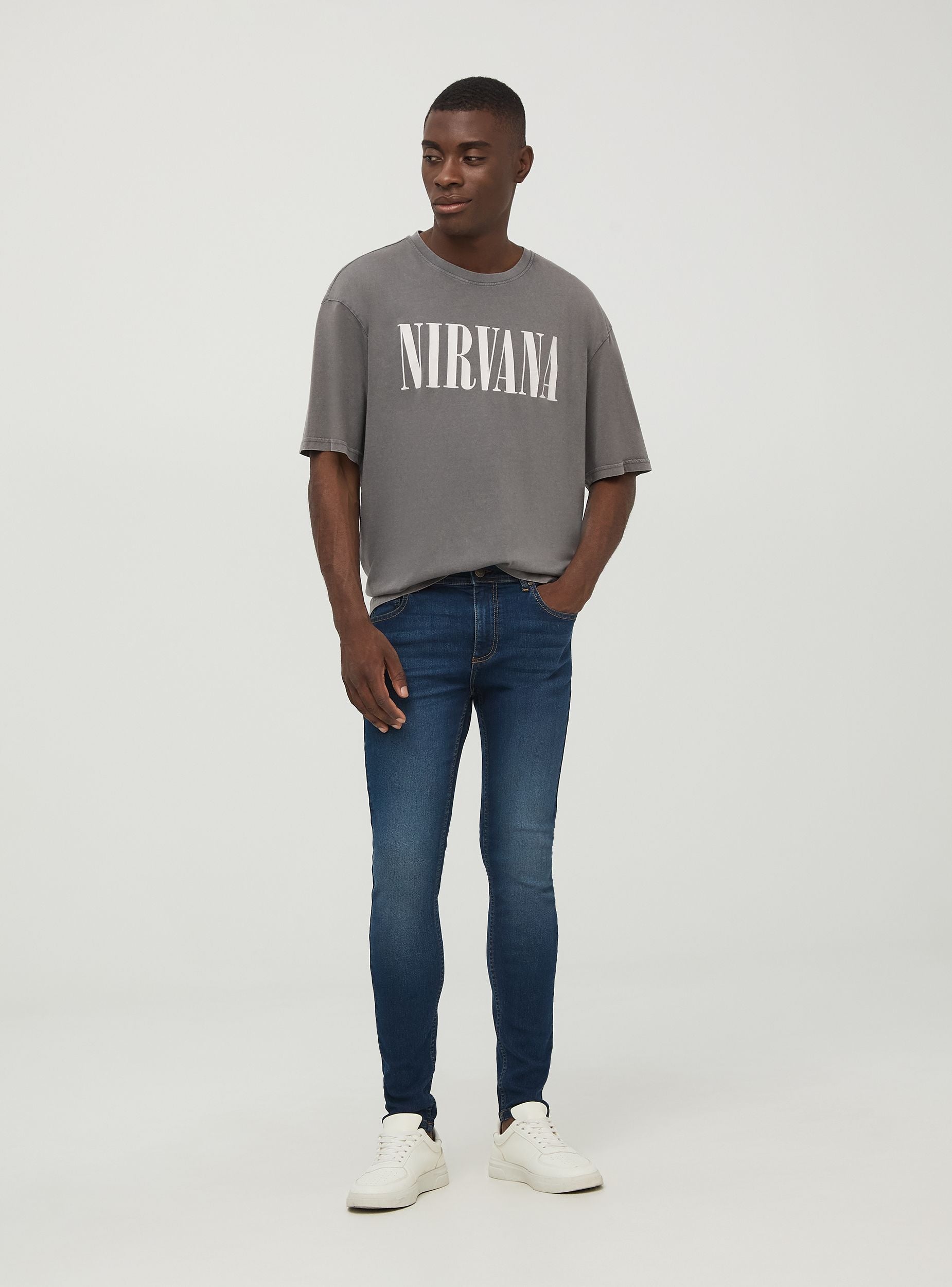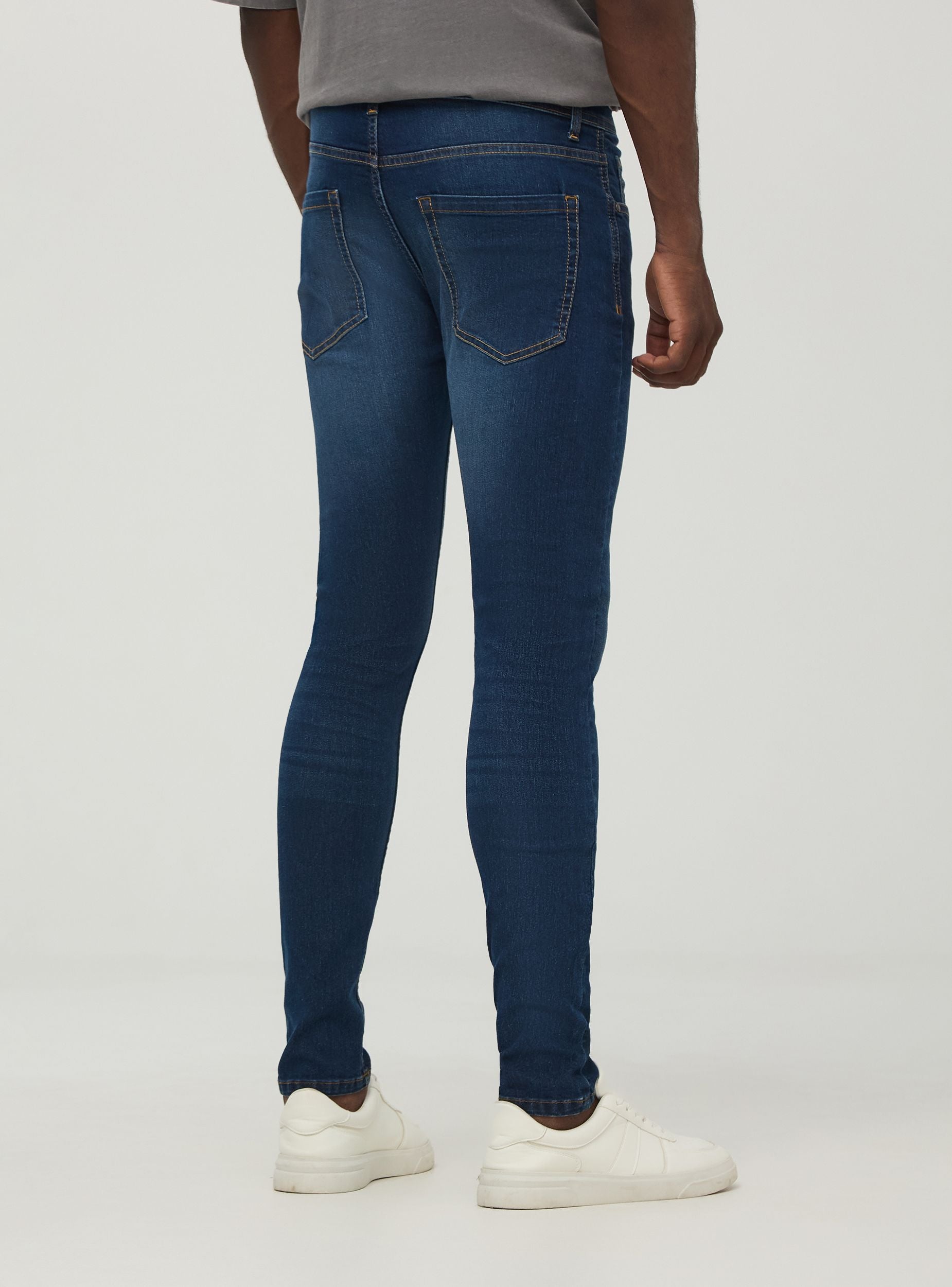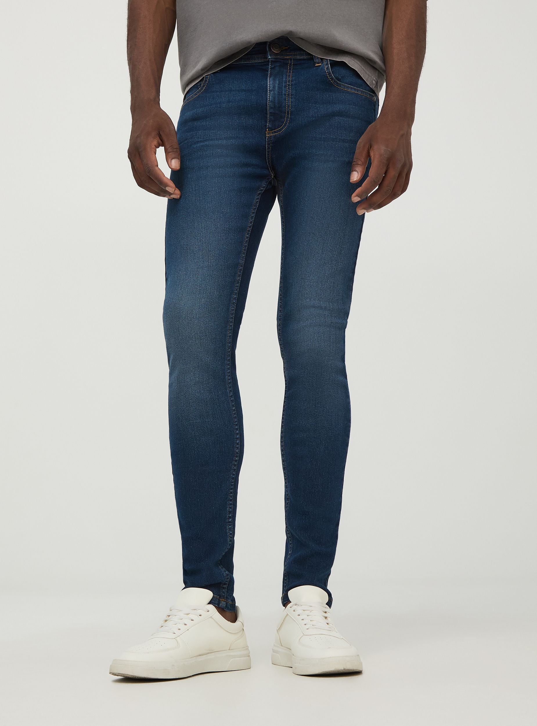 Super skinny fit traperice za muškarce, izrađene od tamnoplavog denima. Elastične za optimalnu udobnost i pristajanje. Imaju ravnomjernu boju s laganim izblijedjelim nijansama na bedrima i koljenima, te kontrastne šavove. Opremljene su zatvaranjem na gumb i patentni zatvarač, imaju pet džepova. Lako se kombiniraju s majicama, duksericama, puloverima ili košuljama.