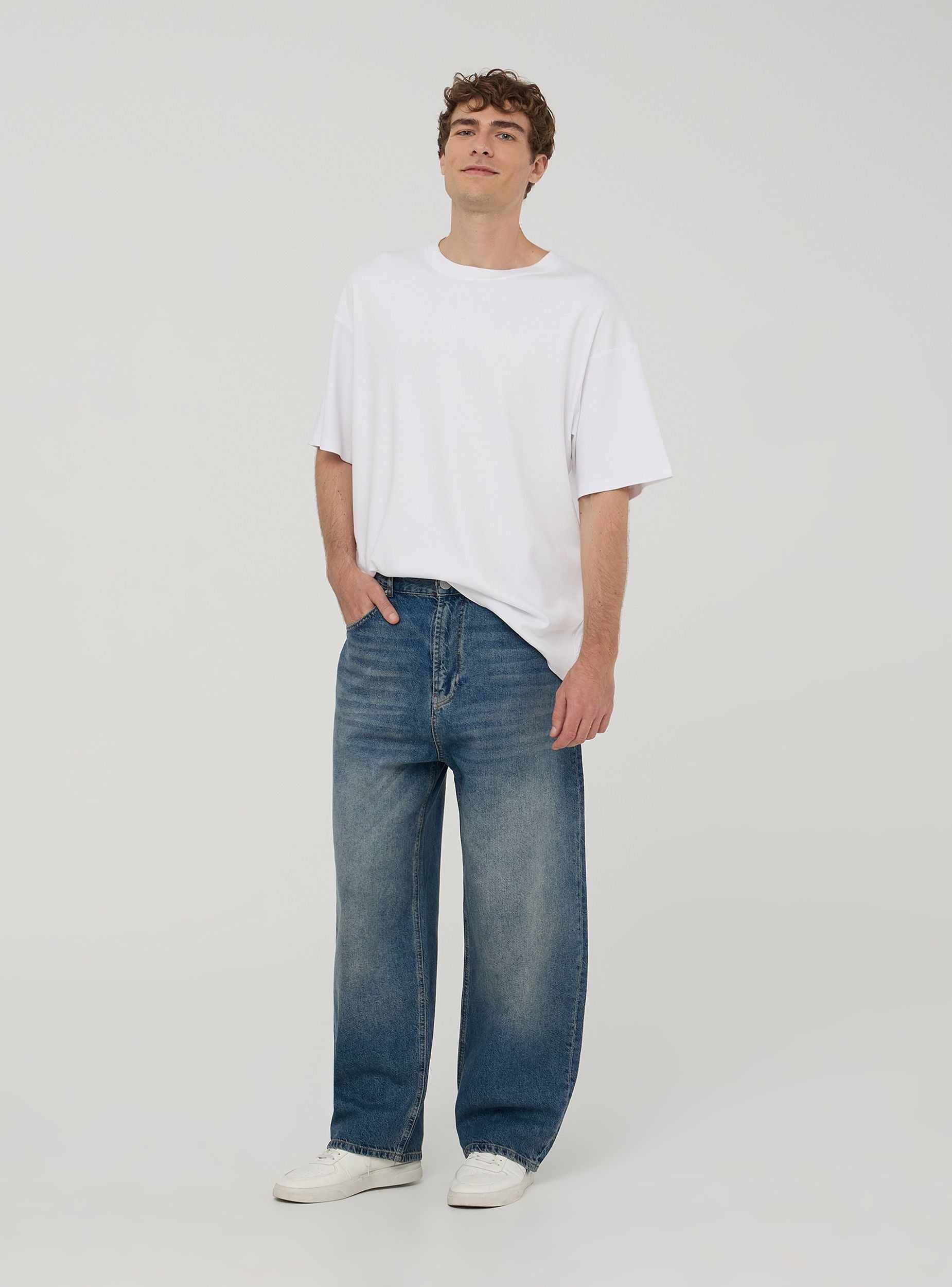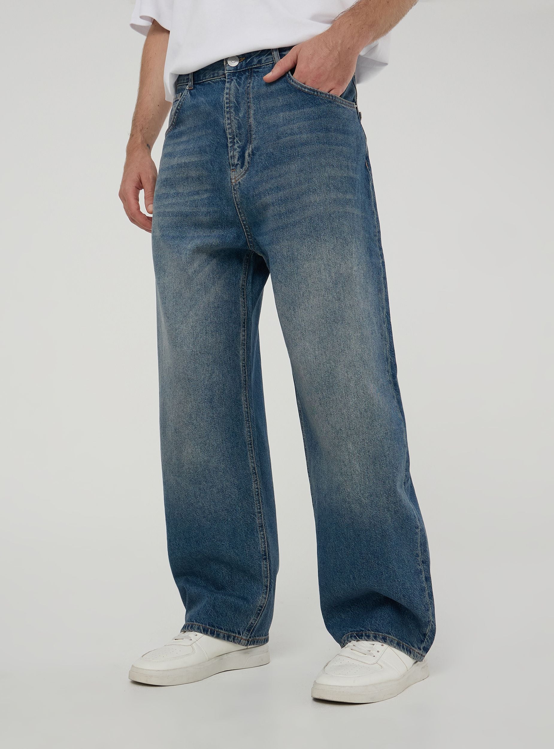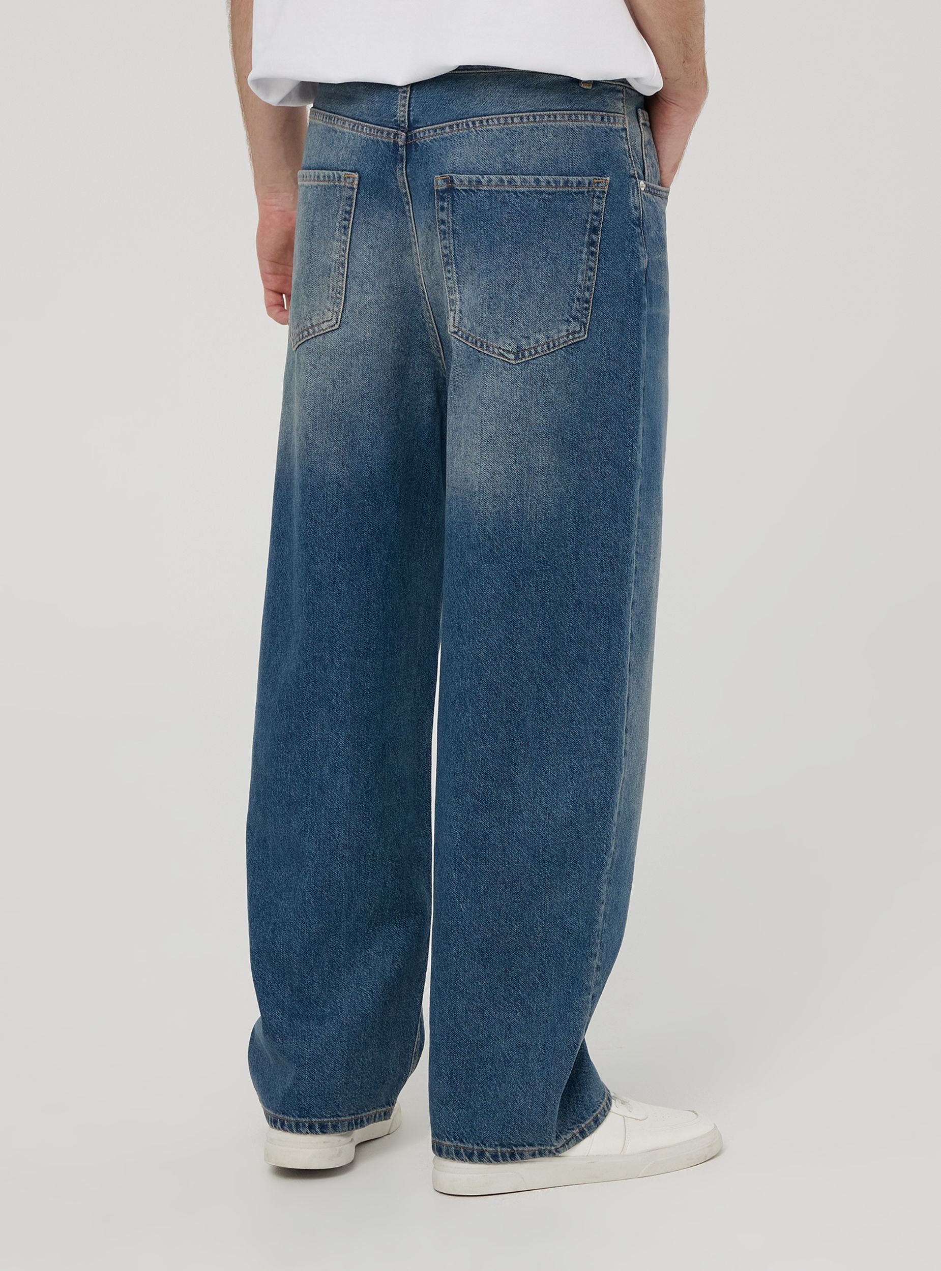 Muške traperice super vrećastog kroja s prednjim kopčanjem na gumb. Imaju dva ukošena prednja džepa, džep za novčiće i dva stražnja našivena džepa. Omče za remen raspoređene su duž struka, što omogućuje korištenje remena različitih veličina. Dizajn je osmišljen za ležeran i opušten izgled, prikladan za one koji traže udobnost bez odricanja od stila.Detalji