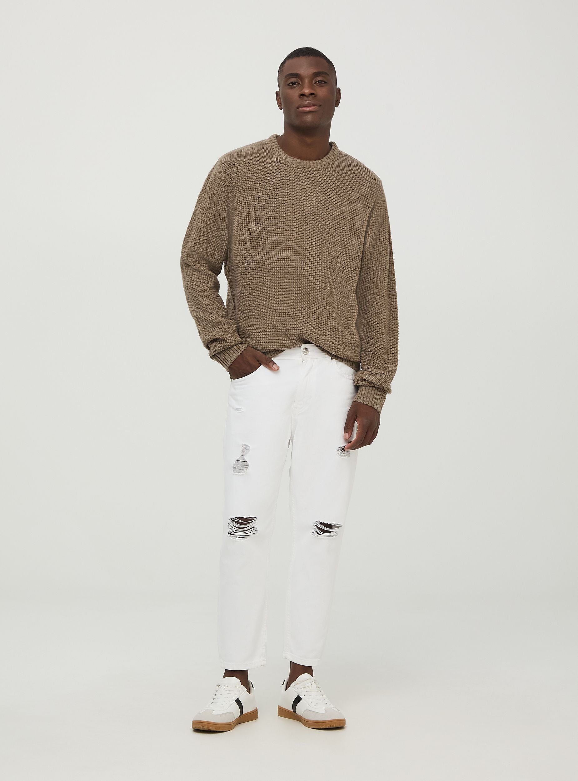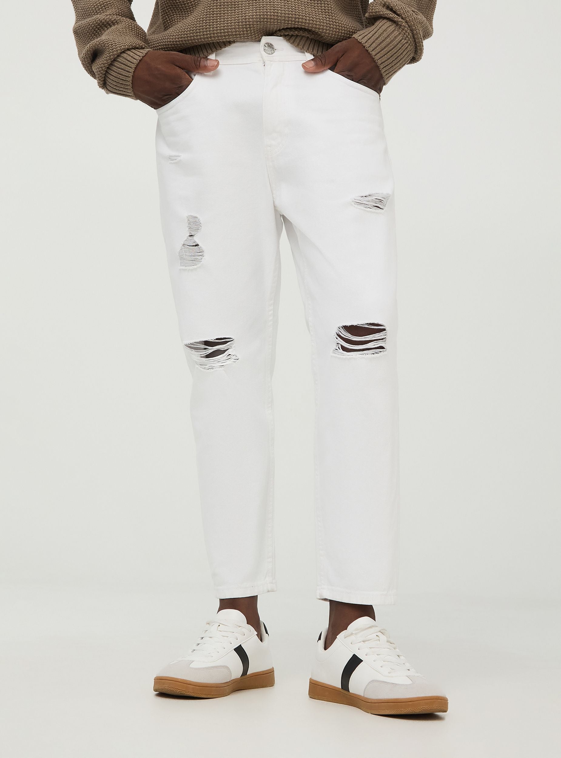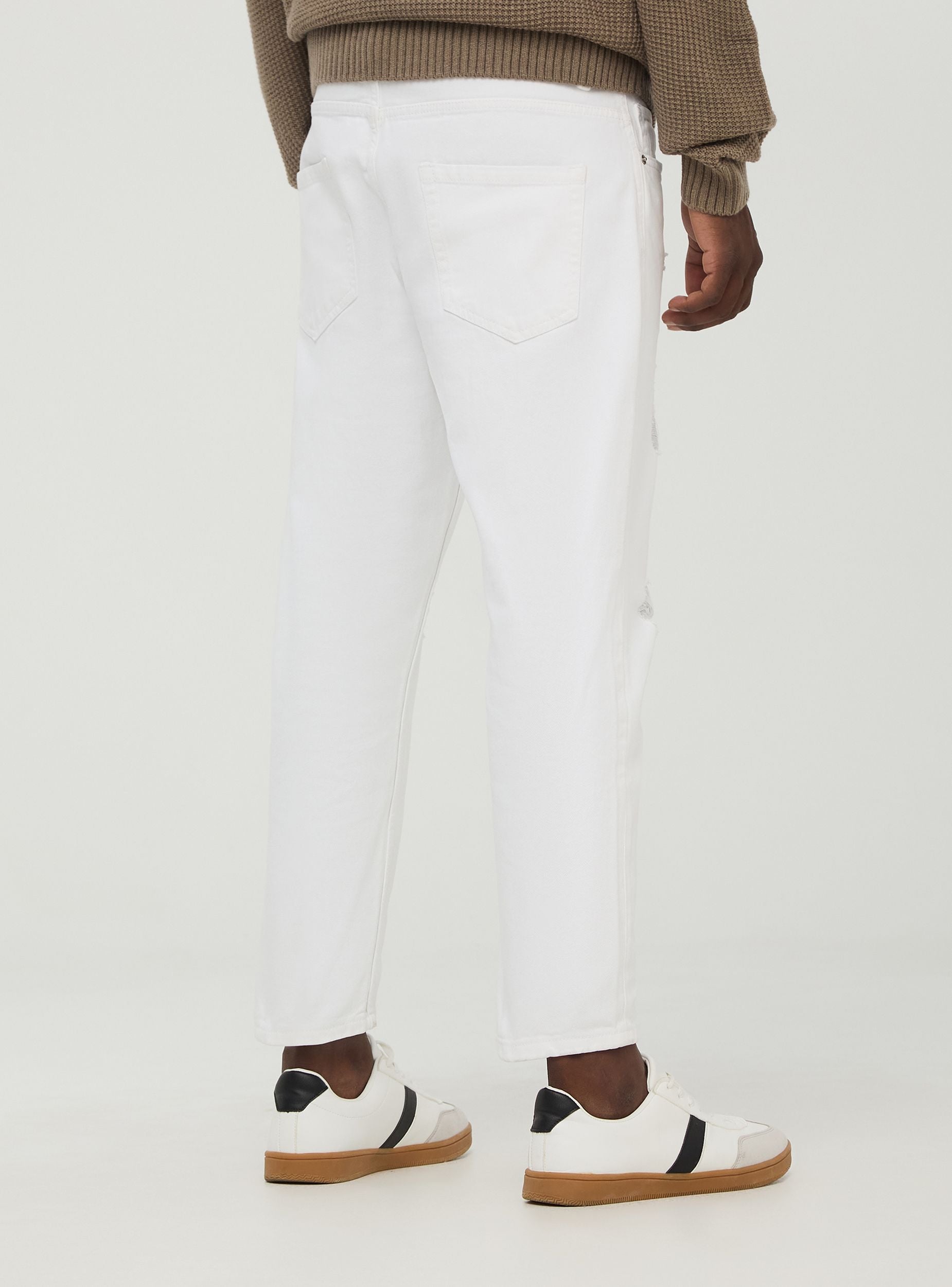 Muški traperice, slobodnog kroja, urbanog dizajna izrađene od pamuka. Imaju strateški postavljene poderotine i abrazije za moderan i oštar izgled. Opremljene su s pet funkcionalnih džepova, zatvaranjem na gumb i patentni zatvarač. Ojačani šavovi osiguravaju otpornost i trajnost. Idealne za ležerne i trendi izglede, savršene za slobodno vrijeme i neformalne izlaske.