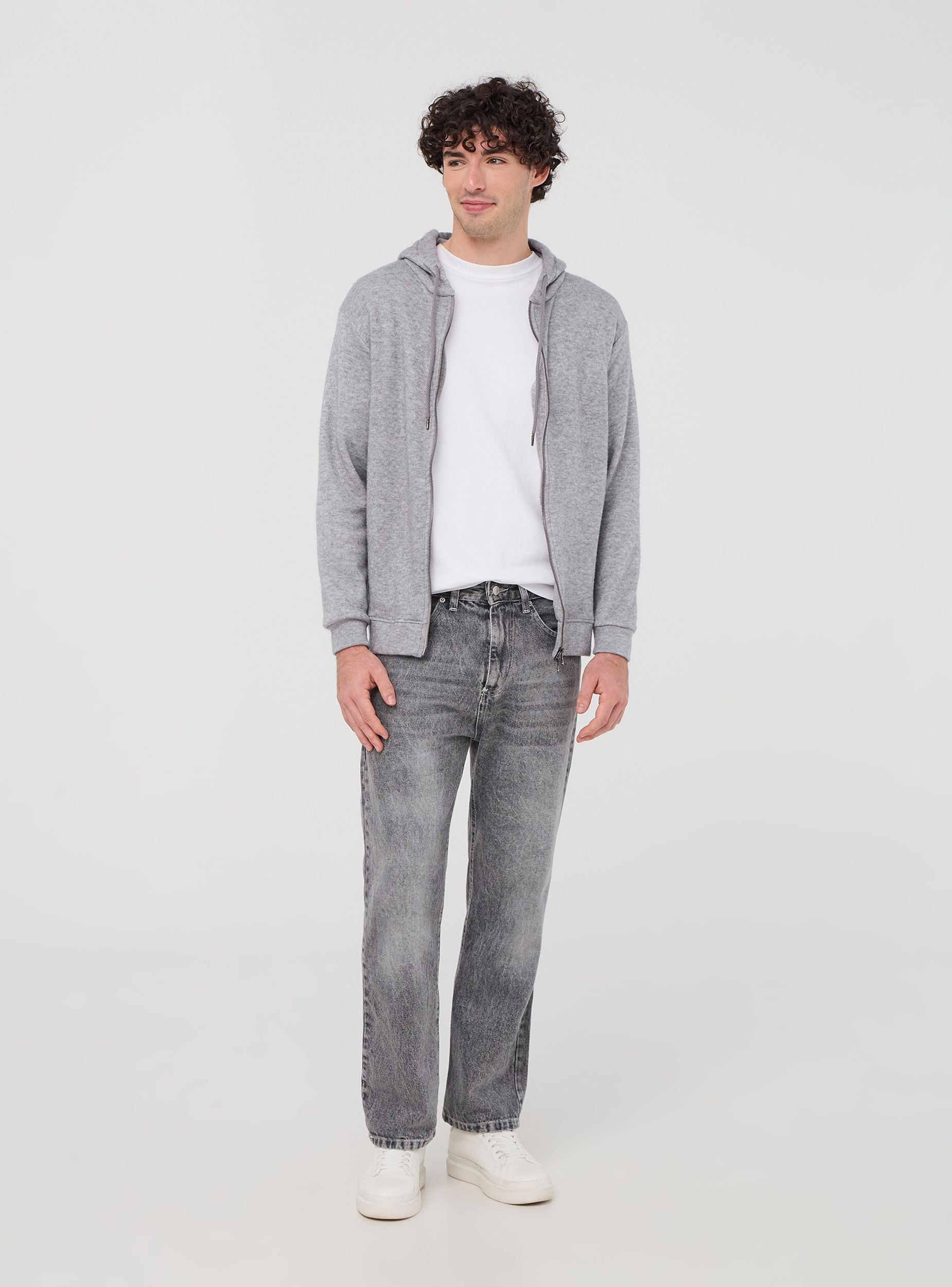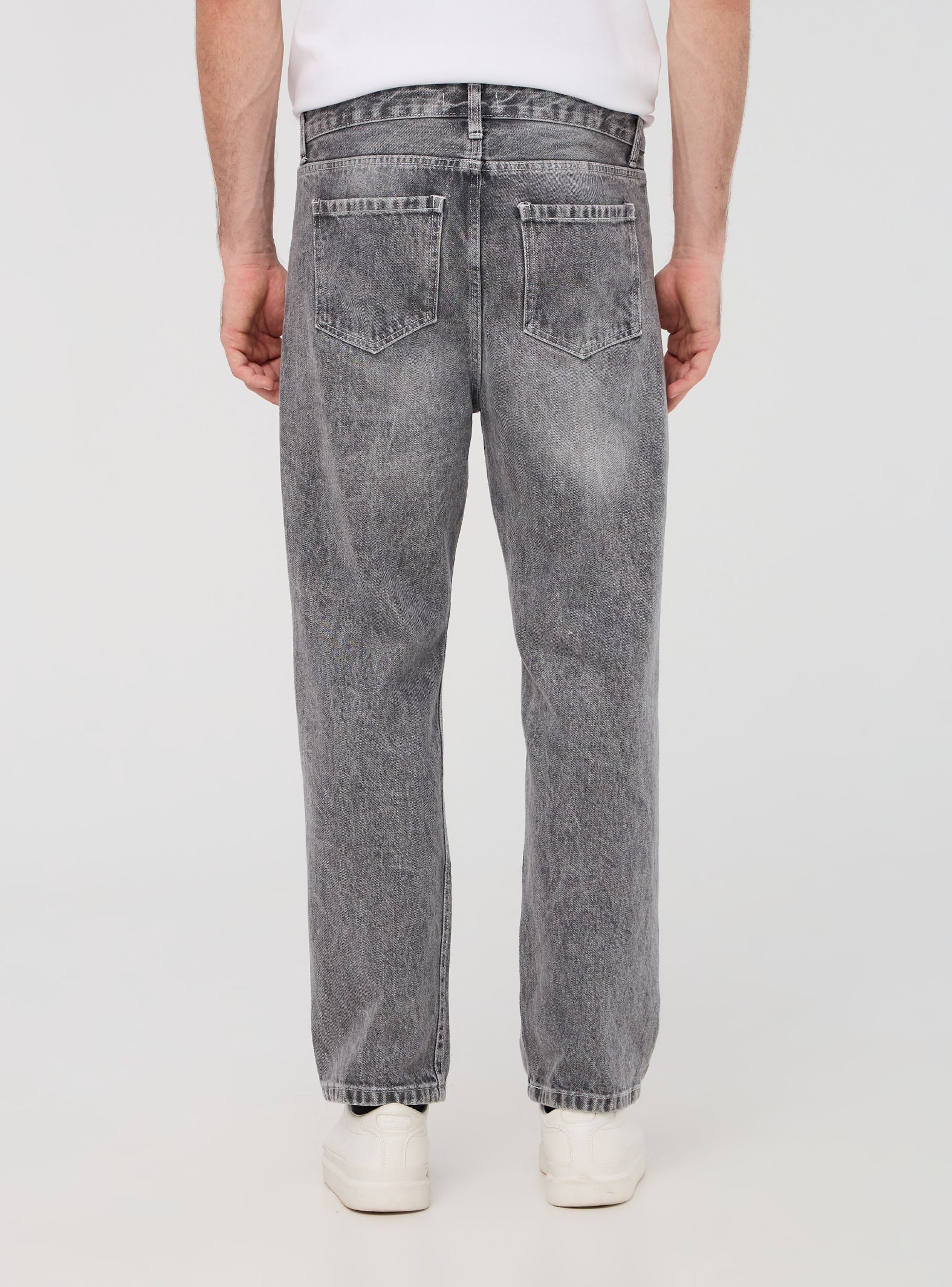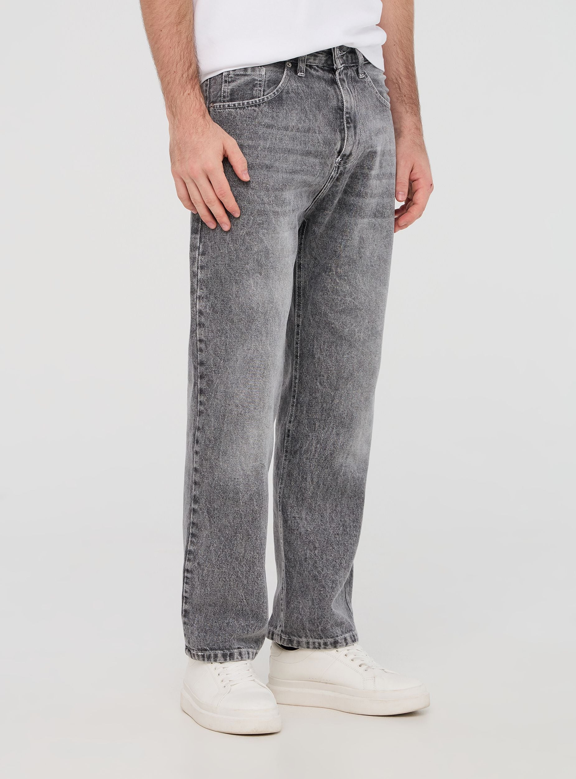 Muške traperice vrećastog kroja s prednjim kopčanjem na gumb. Imaju dva ukošena prednja džepa, džep za novčiće i dva stražnja našivena džepa. Siva traper-tkanina s ispranim efektom. Omče za remen raspoređene su duž struka, što omogućuje korištenje remena različitih veličina. Dizajn je osmišljen za ležeran i opušten izgled, prikladan za one koji traže udobnost bez odricanja od stila.