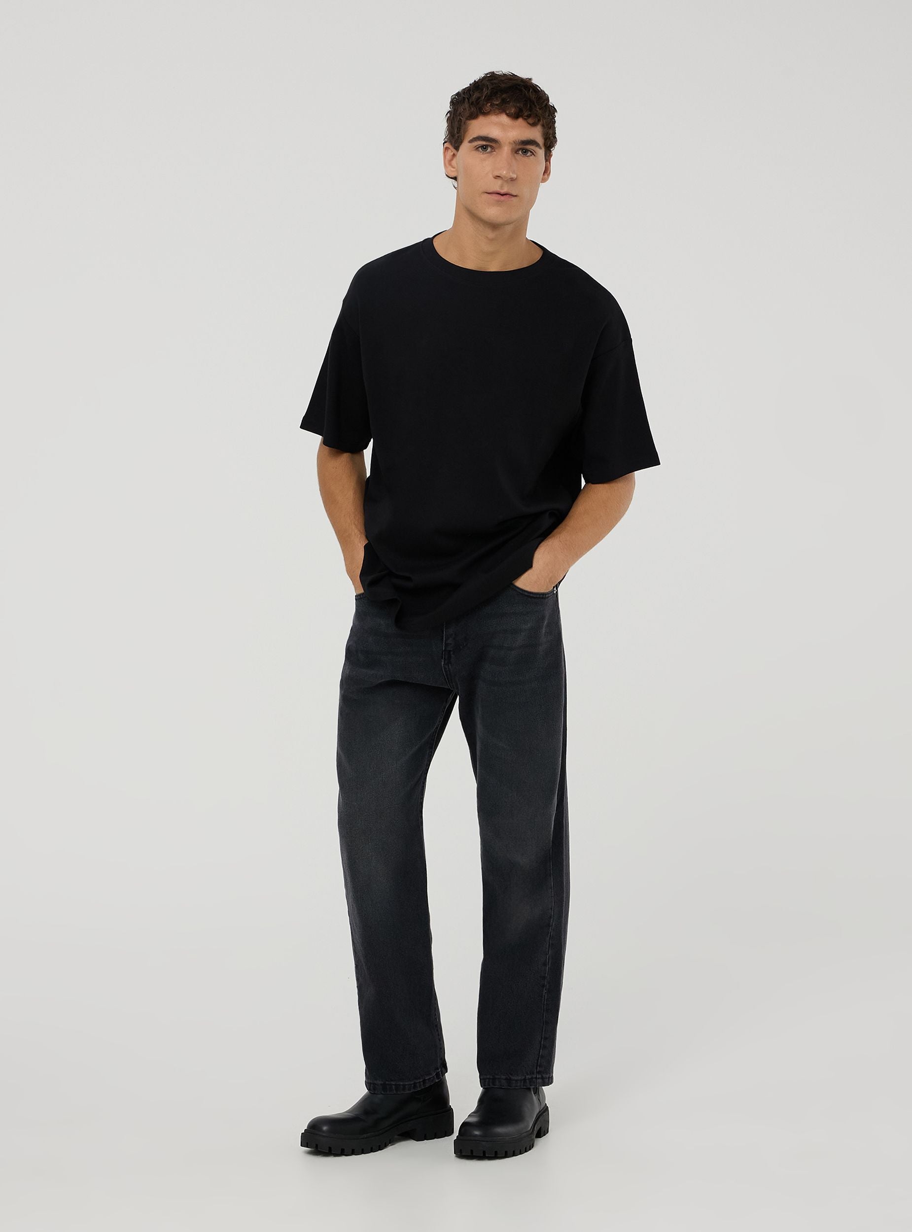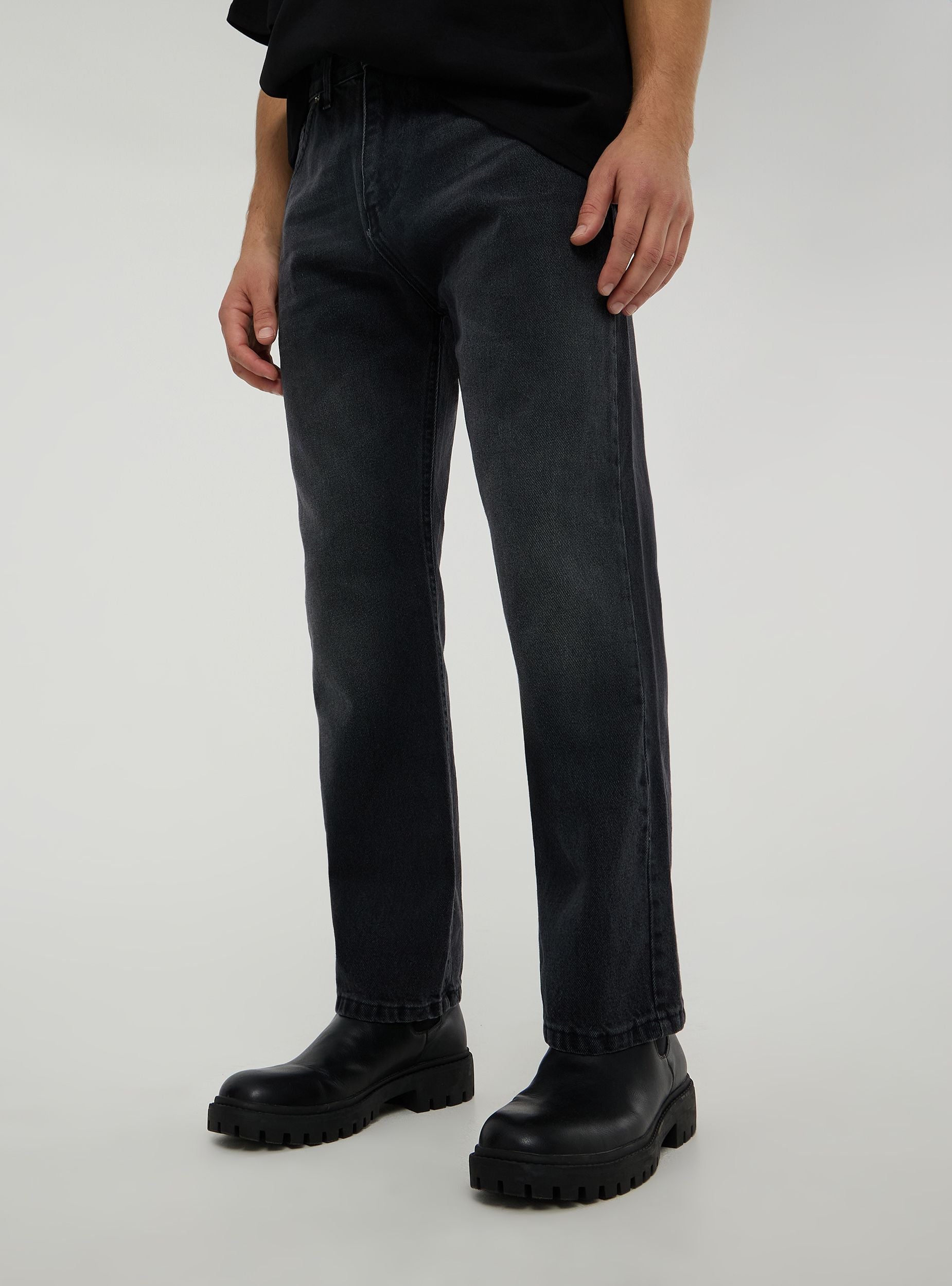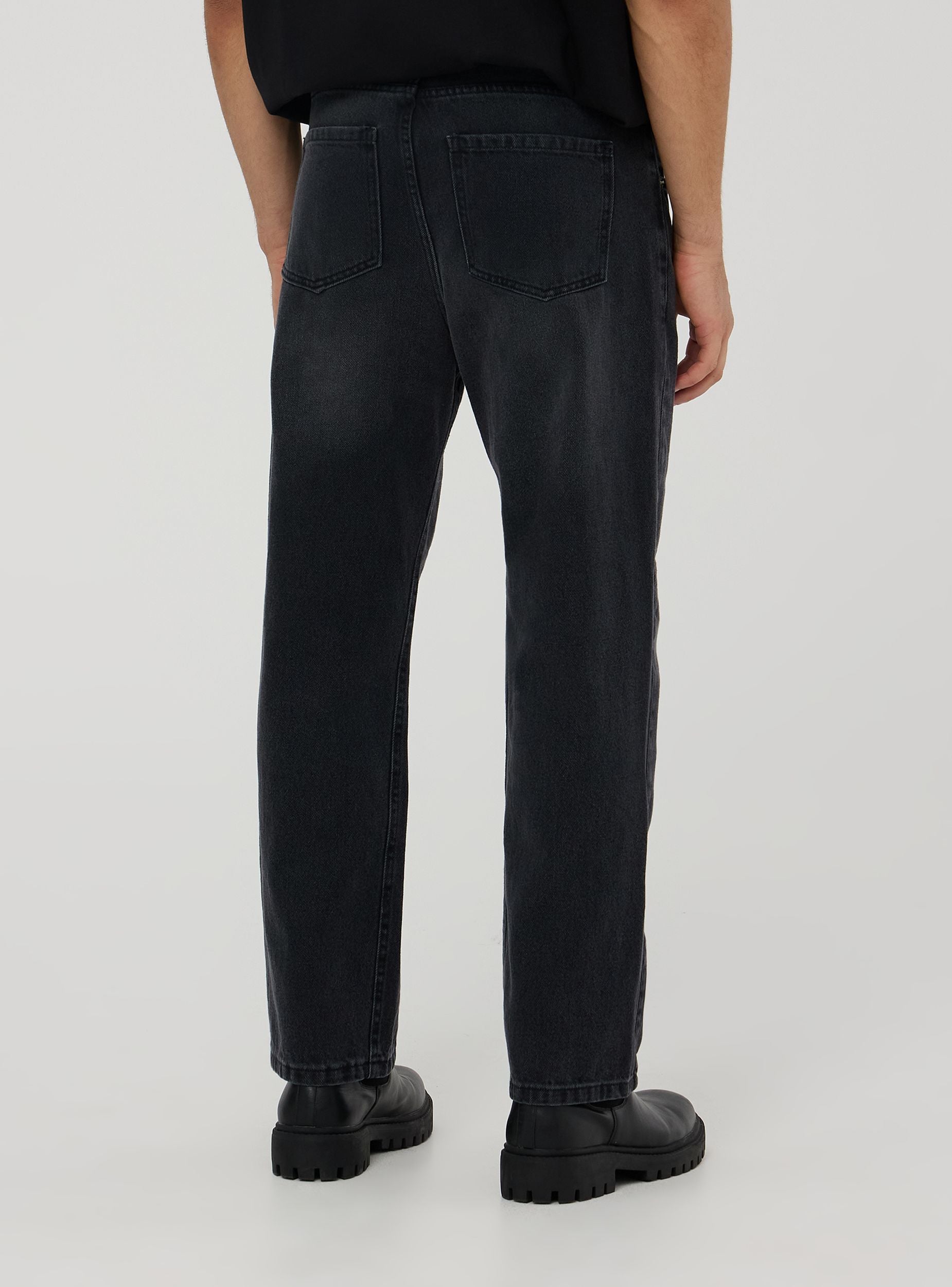 Muške traperice vrećastog kroja s prednjim kopčanjem na gumb. Imaju dva ukošena prednja džepa, džep za novčiće i dva stražnja našivena džepa. Crna traper-tkanina. Omče za remen raspoređene su duž struka, što omogućuje korištenje remena različitih veličina. Dizajn je osmišljen za ležeran i opušten izgled, prikladan za one koji traže udobnost bez odricanja od stila.