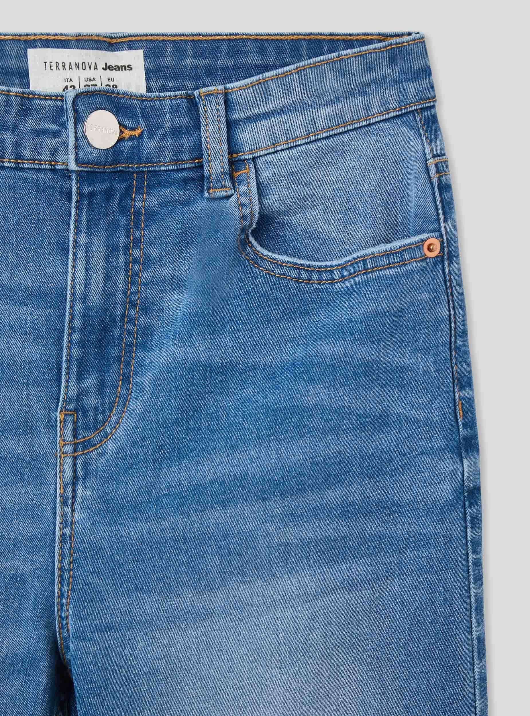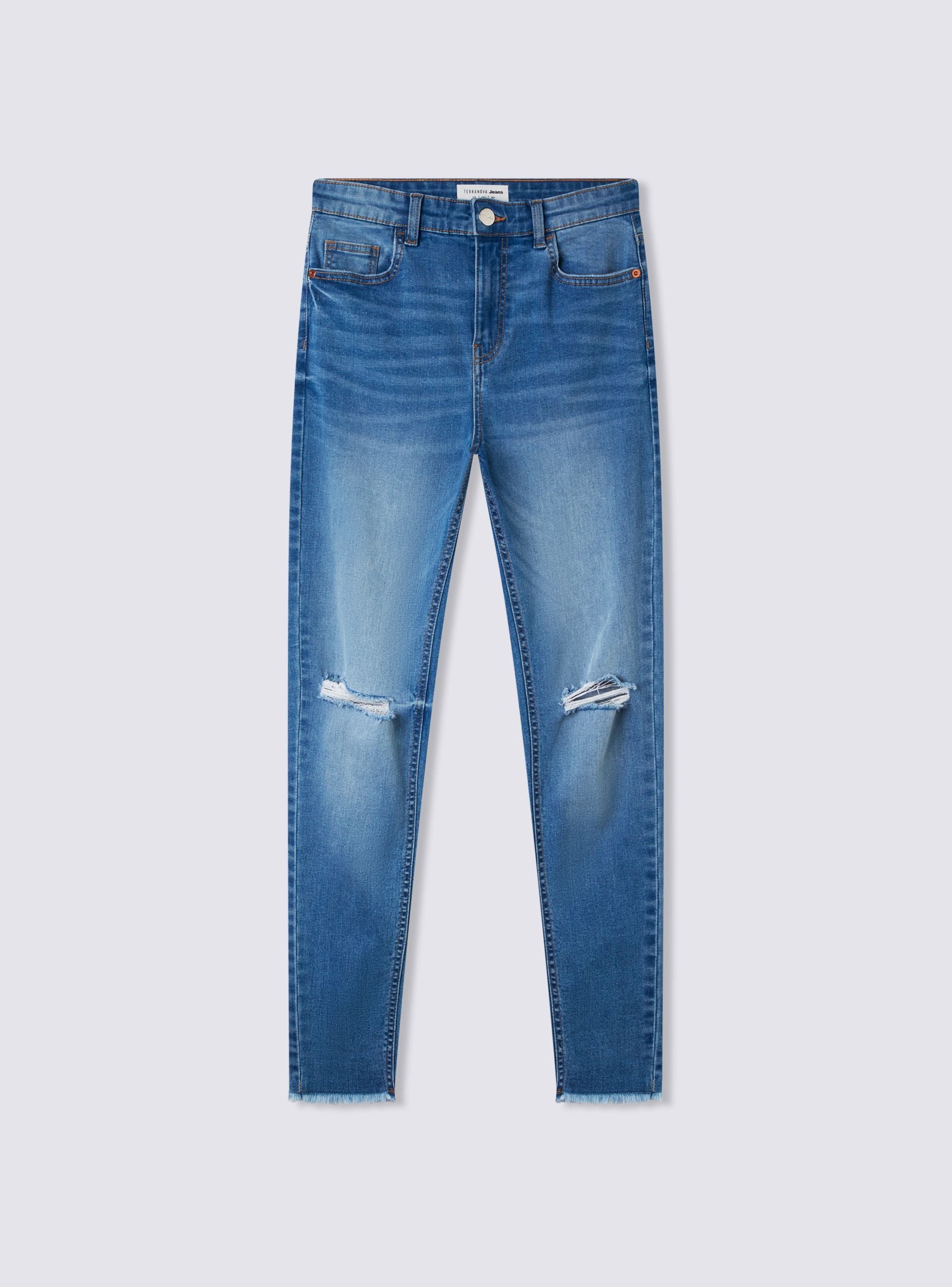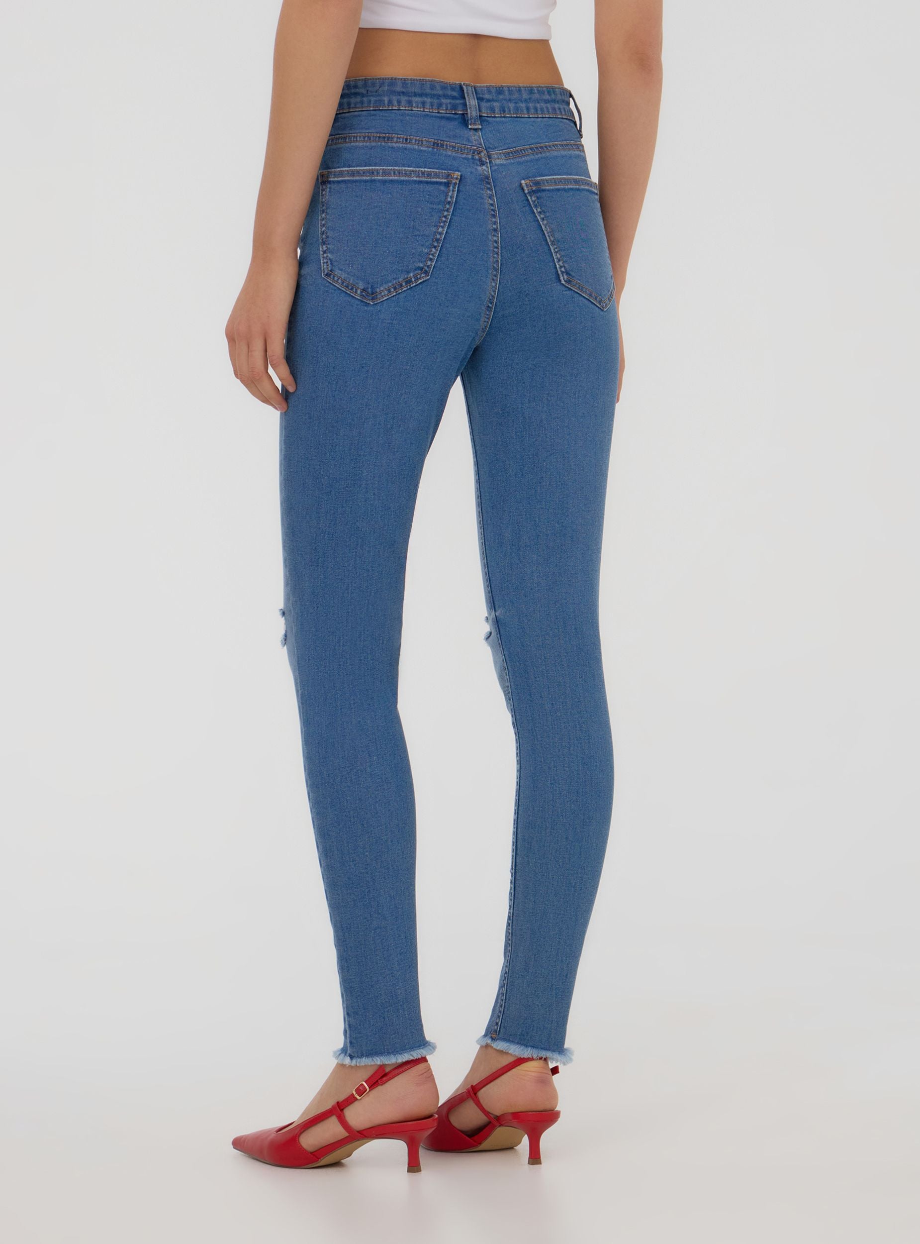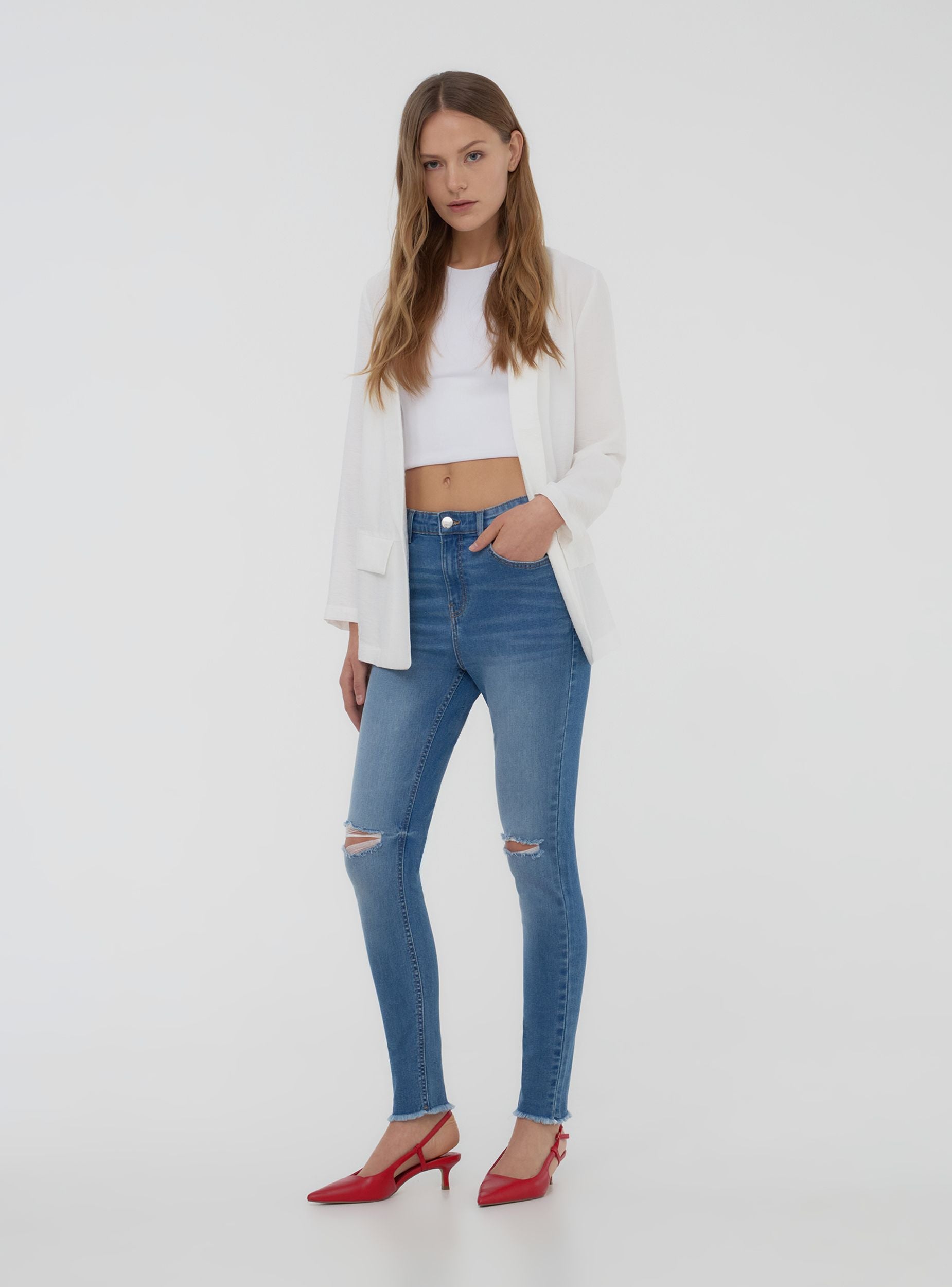 Ženske farmerke uskog kroja sa poderotinama na koljenima, savršene za odvažan i moderan izgled. Dizajn sa pet džepova, zatvaranje na rajsferšlus i dugme te prorezi za kaiš na struku pružaju udobnost i funkcionalnost. Srednje pranje teksasa čini ih svestranim, idealnim za kombinovanje sa kratkim majicama i patikama tokom dana ili sa košuljom i štiklama za trendi večernji outfit.
