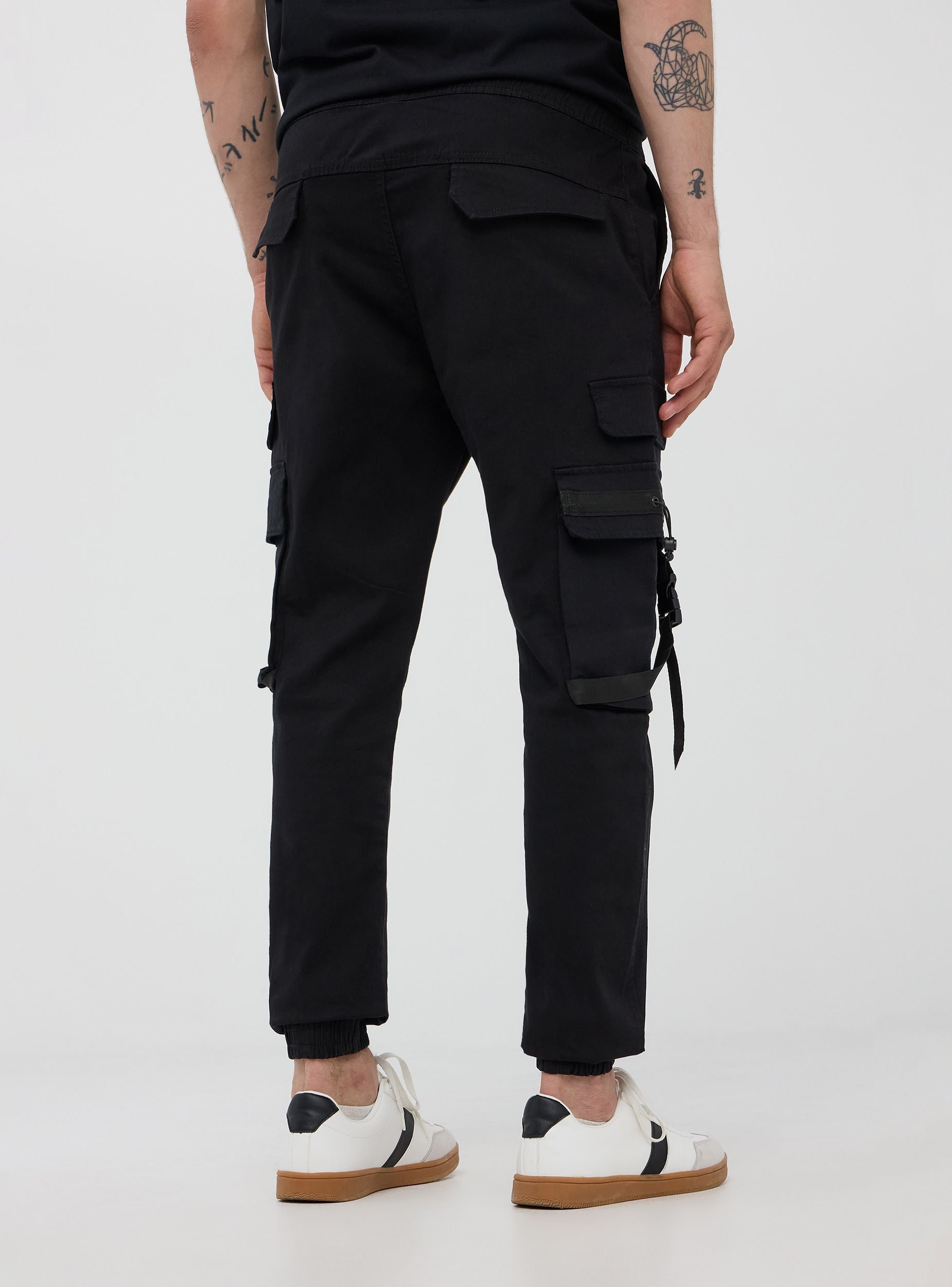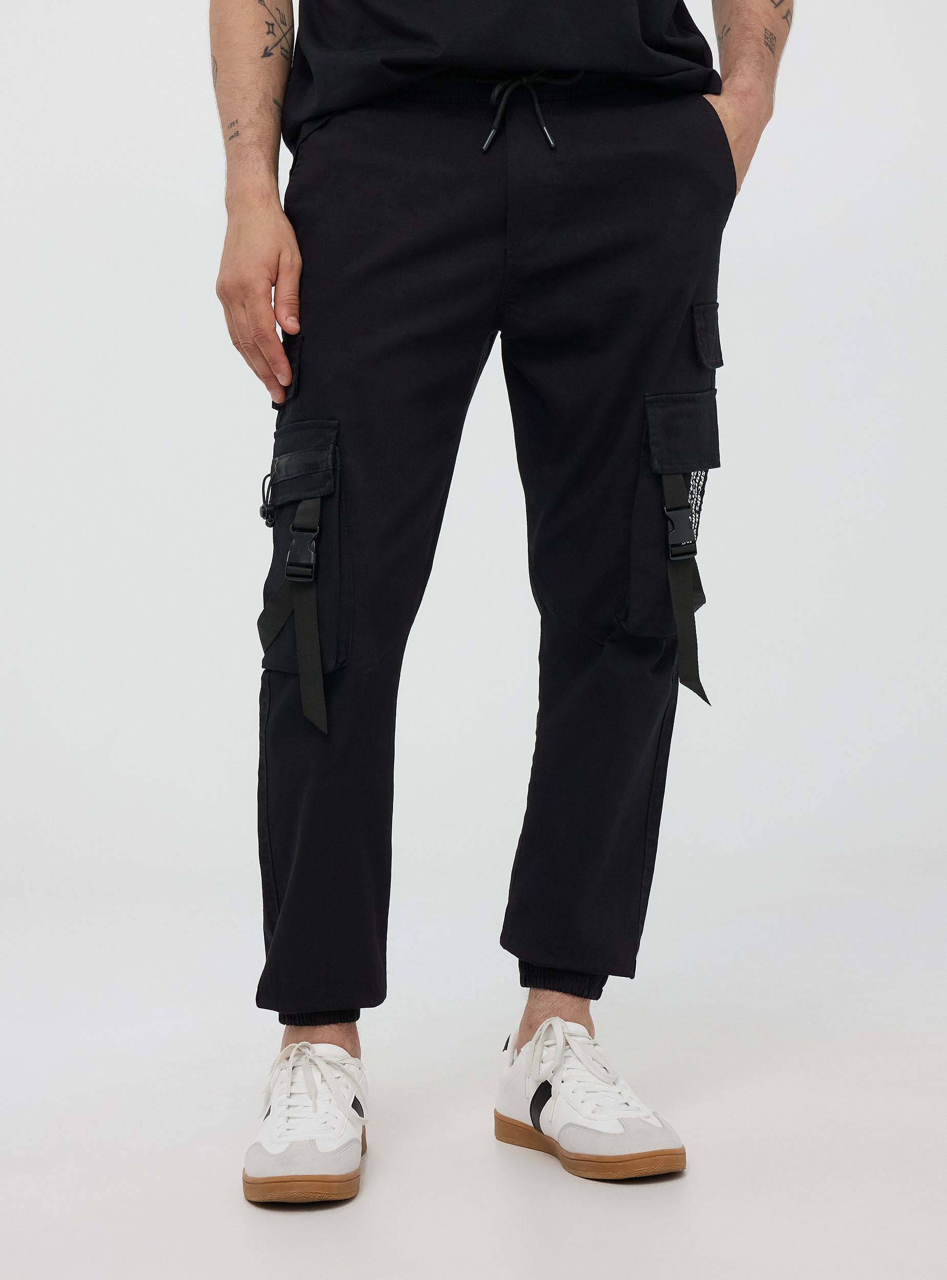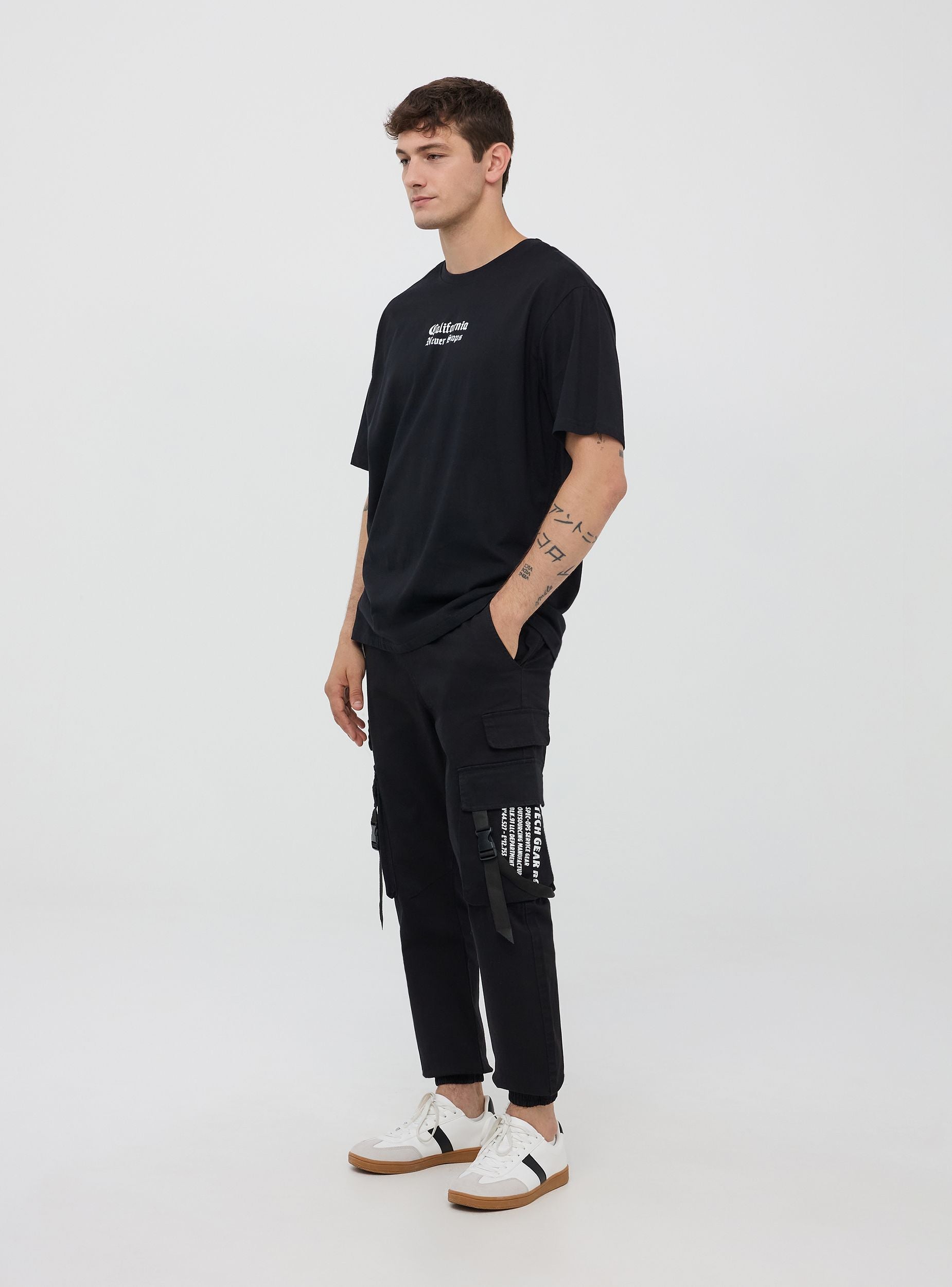 Muški cargo hlače od rastezljivog pamuka, savršene za ležeran i funkcionalan izgled. Imaju dizajn s širokim bočnim džepovima i stražnjim džepovima s preklopom. Obogaćene su detaljima poput podesivih remena, zaustavljača i grafičkog otiska s natpisima, kako bi dodale moderni dodir. Elastični pojas s vezicom i manžetne na gležnjevima osiguravaju udobno pristajanje.