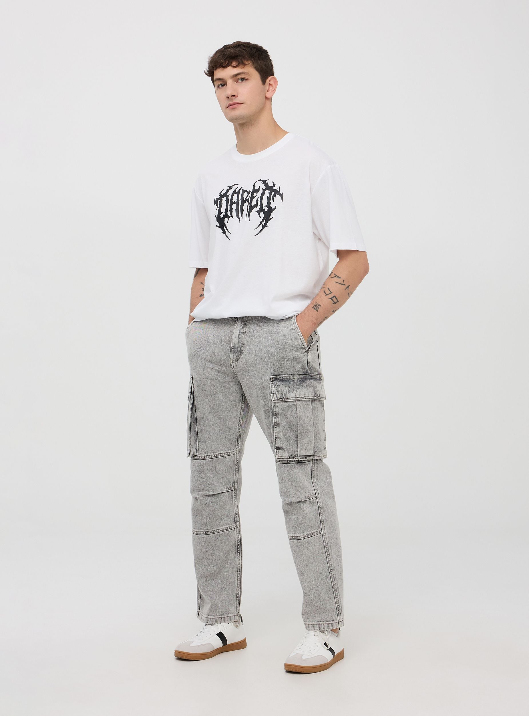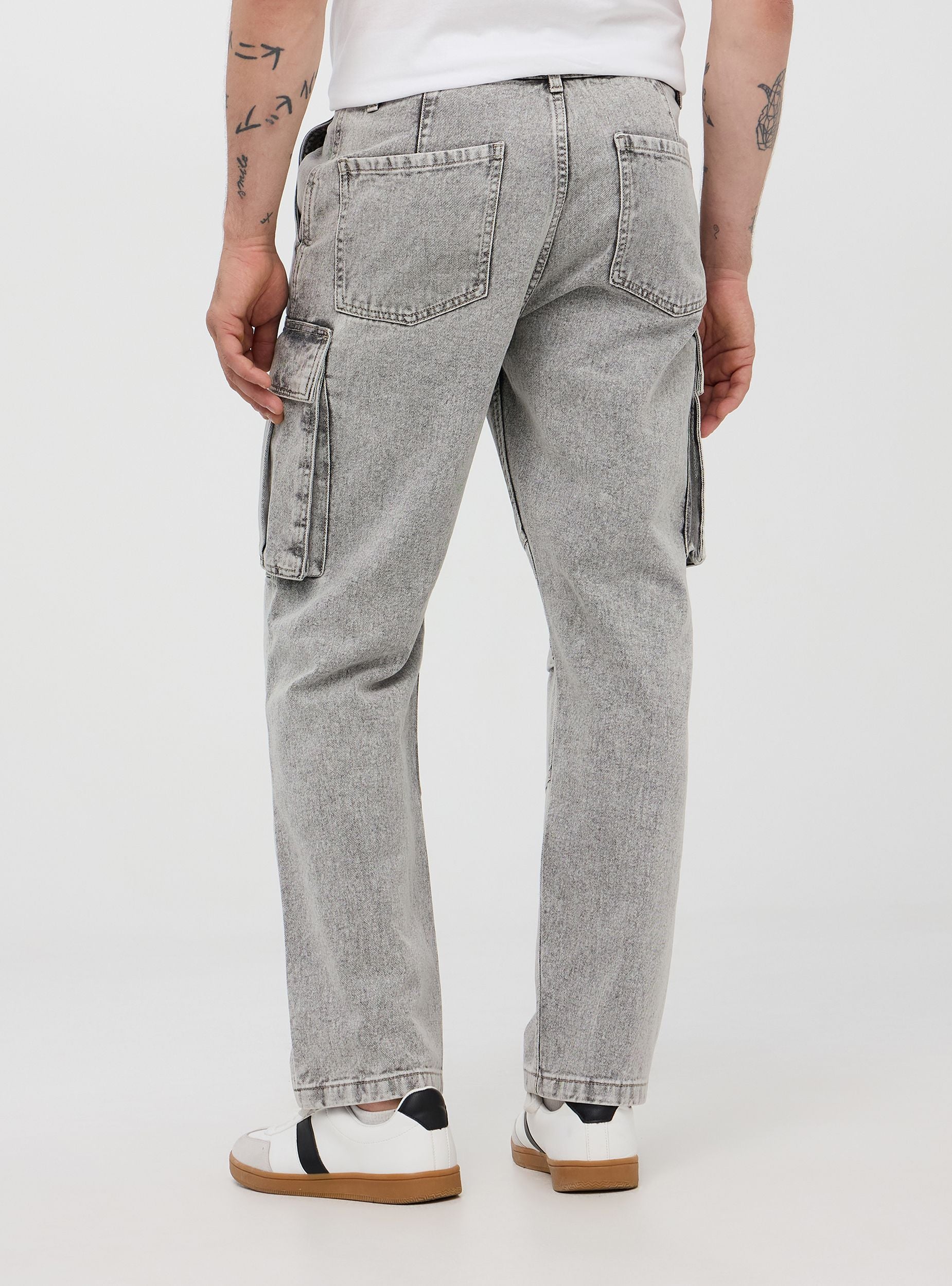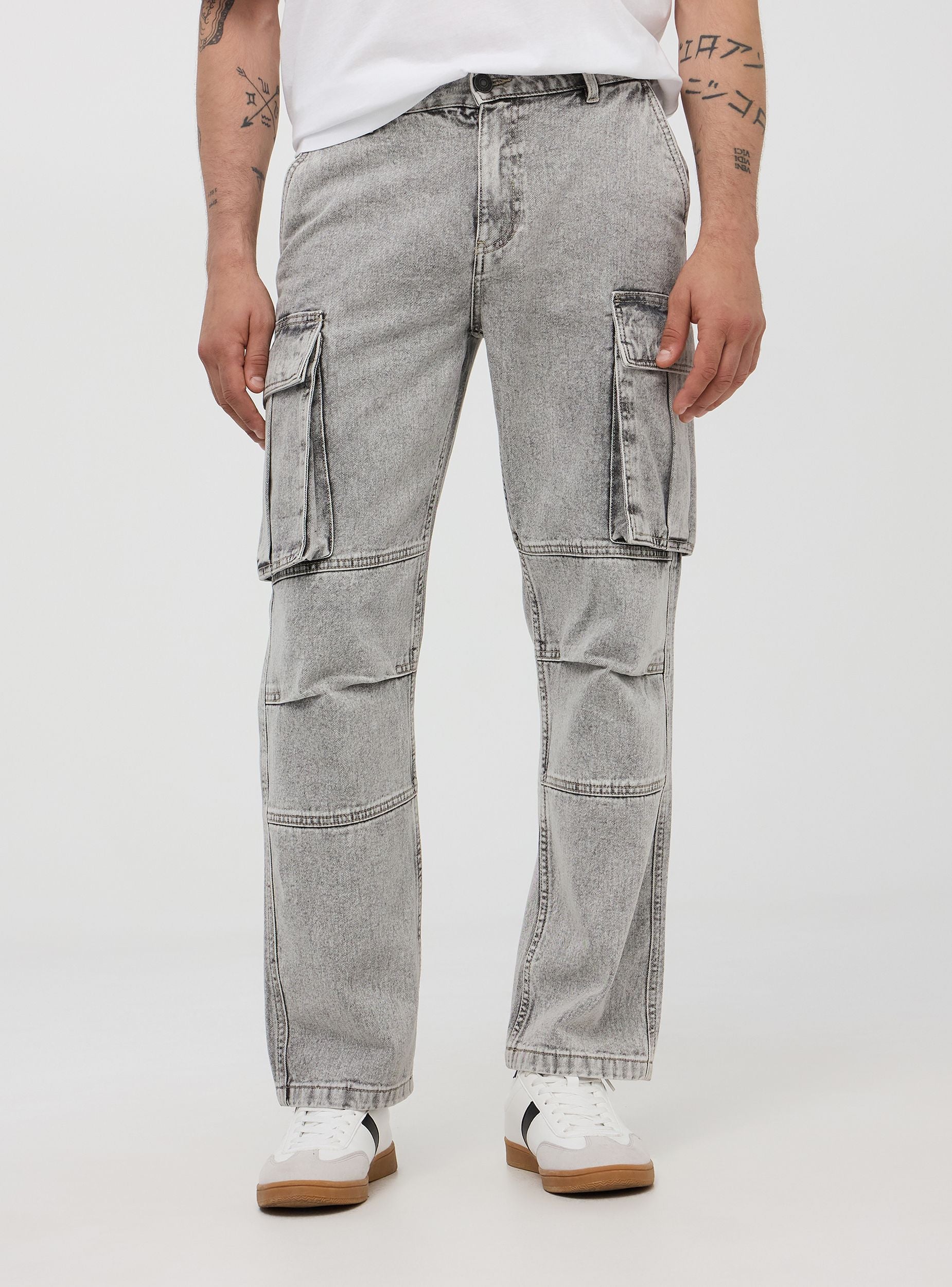 Muške cargo traperice s oversize krojem, karakterizirane dizajnom s velikim bočnim džepovima i šivenim detaljima. Imaju zatvaranje na gumb i rajsferšlus, petlje za remen i ojačane šavove za veću izdržljivost. Model pokazuje efekt kiselog pranja koji daje vintage i istrošen izgled. Na stražnjoj strani nalaze se dva ušivena džepa. Dekorativni i funkcionalni šavovi dodaju dašak stila odjeći, čineći je pogodnom za ležeran i urbani izgled.