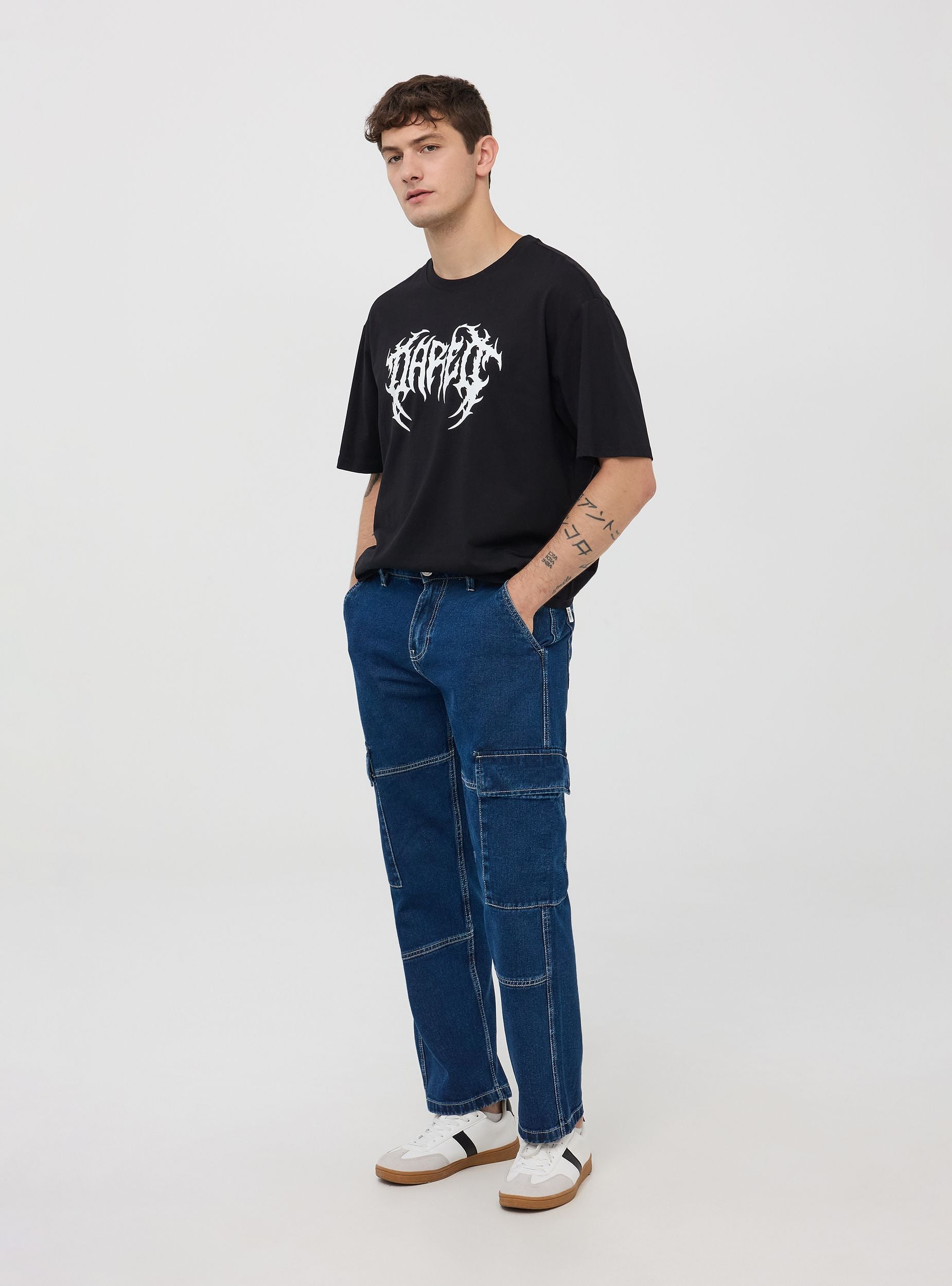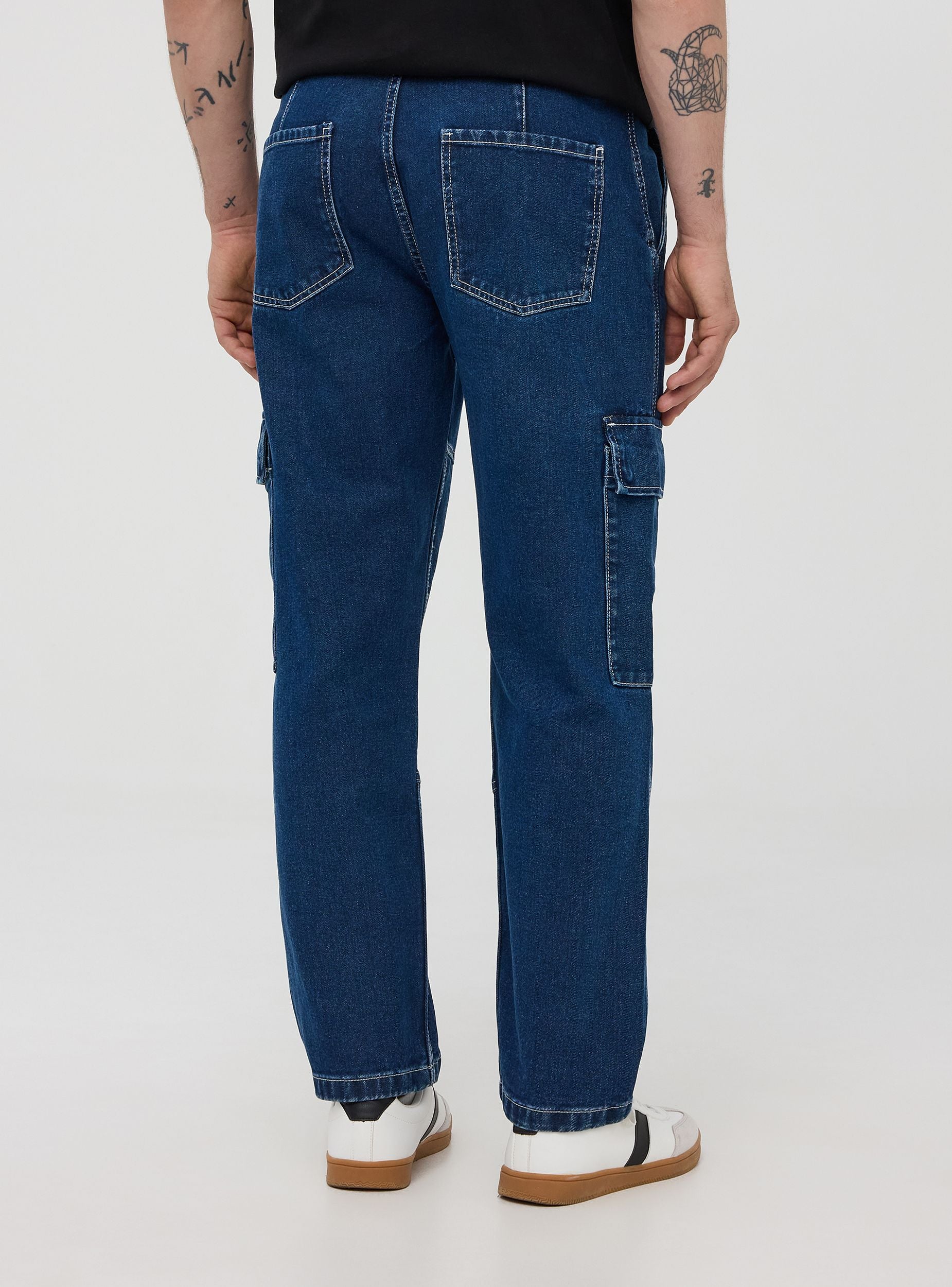 Muški tamnoplavi cargo traperice nude ležeran i funkcionalan izgled. Opremljeni su velikim bočnim džepovima s preklopom, dva nagnuta prednja džepa i dva stražnja džepa, ovi hlače su savršene za one koji traže praktičnost. Udobna i opuštena kroja čini ih idealnima za svakodnevne i vanjske aktivnosti. Kontrastne šavove dodaju dašak dinamičnog stila.